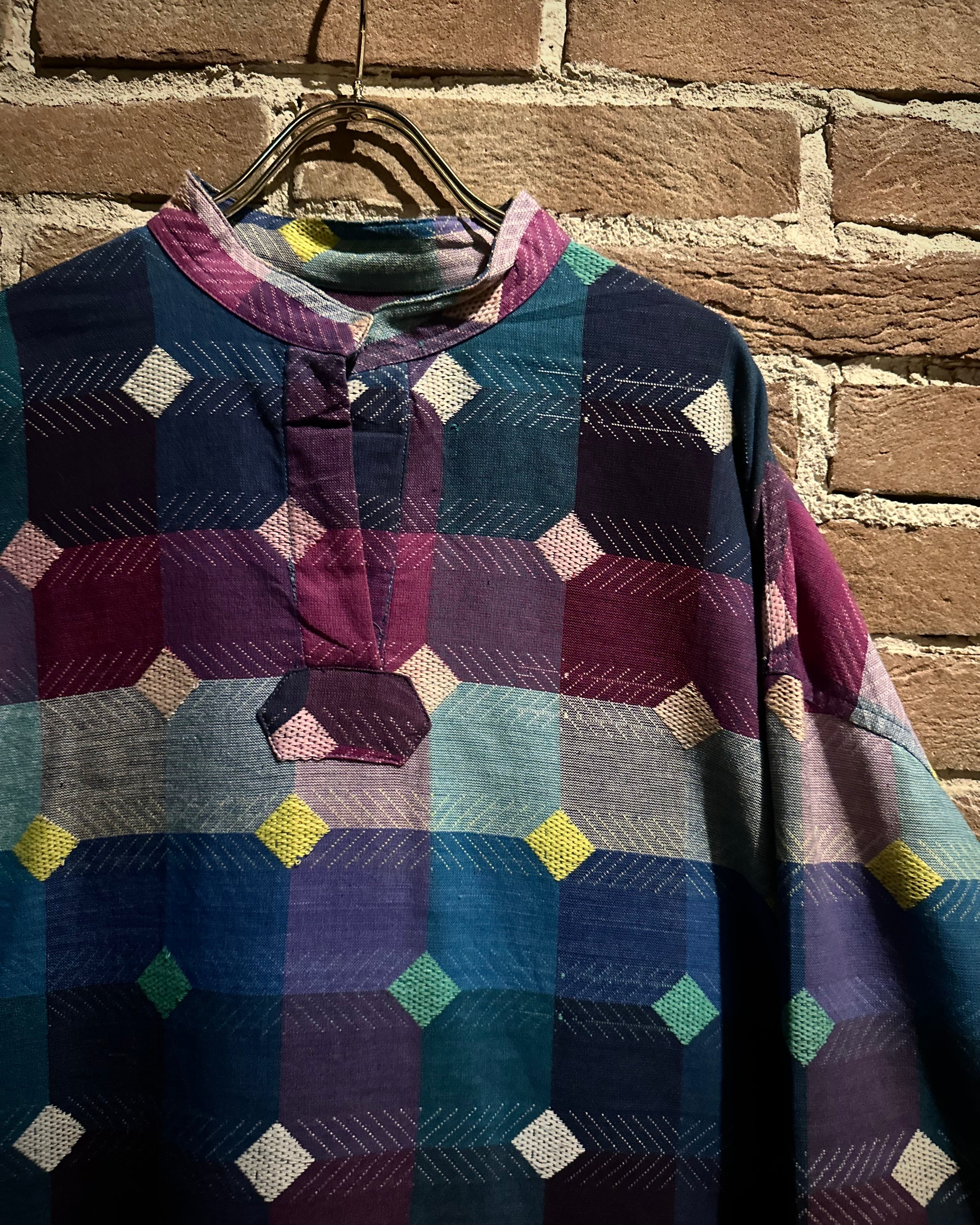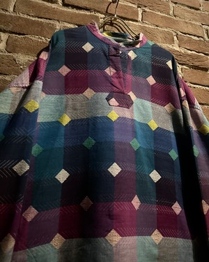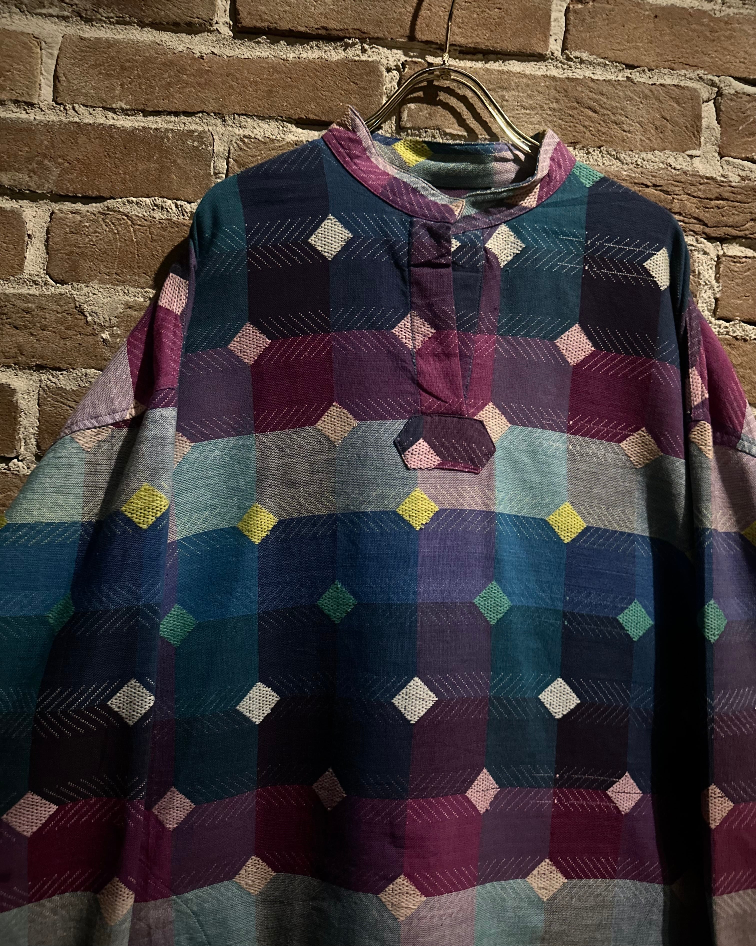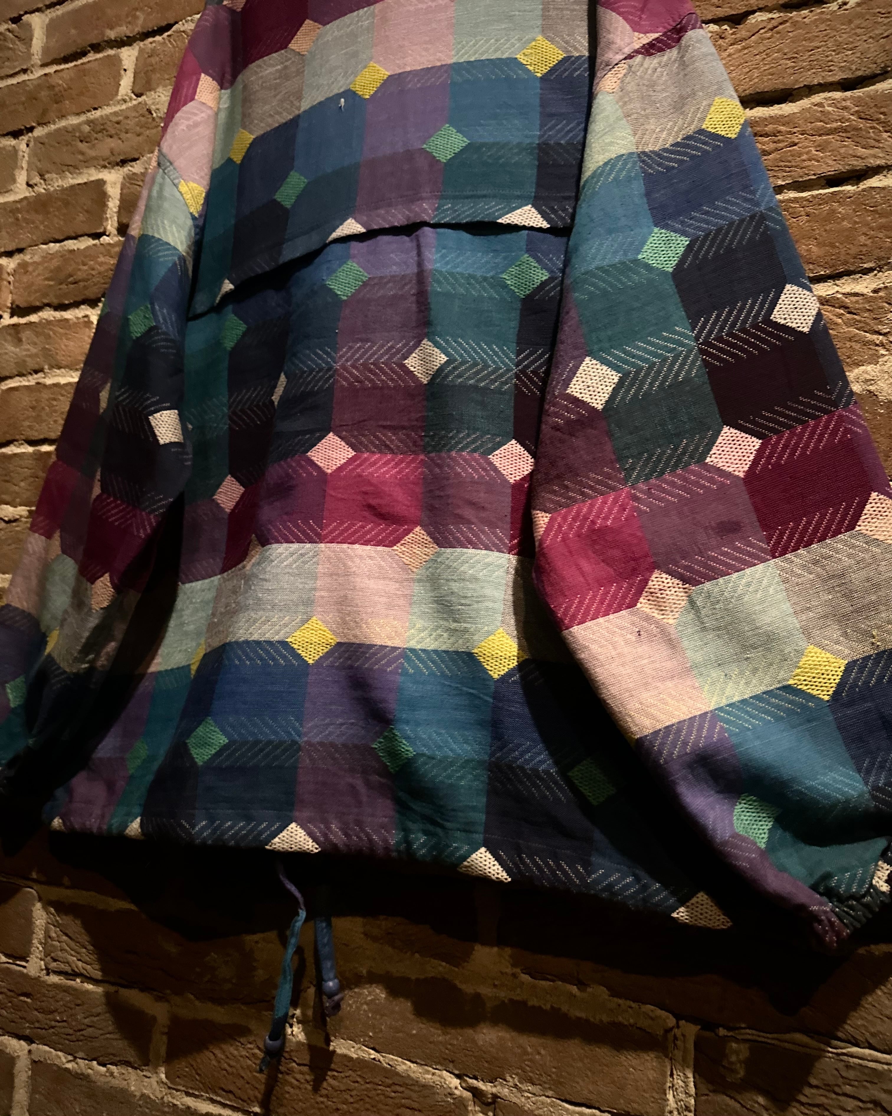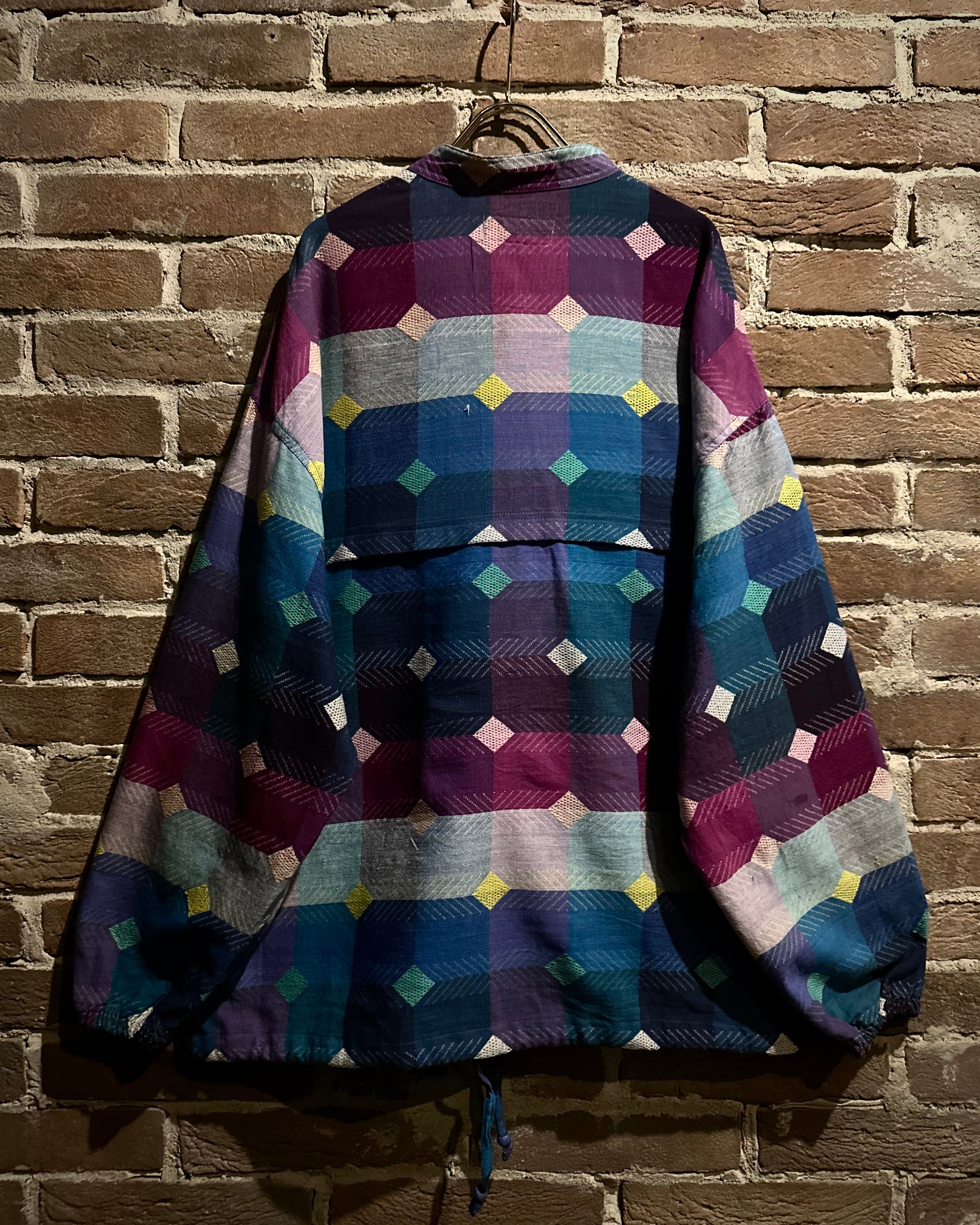 パープル、ブルー、ピンク、グリーン、イエローといった鮮やかな色彩が交差した、幾何学的なデザインのプルオーバー。