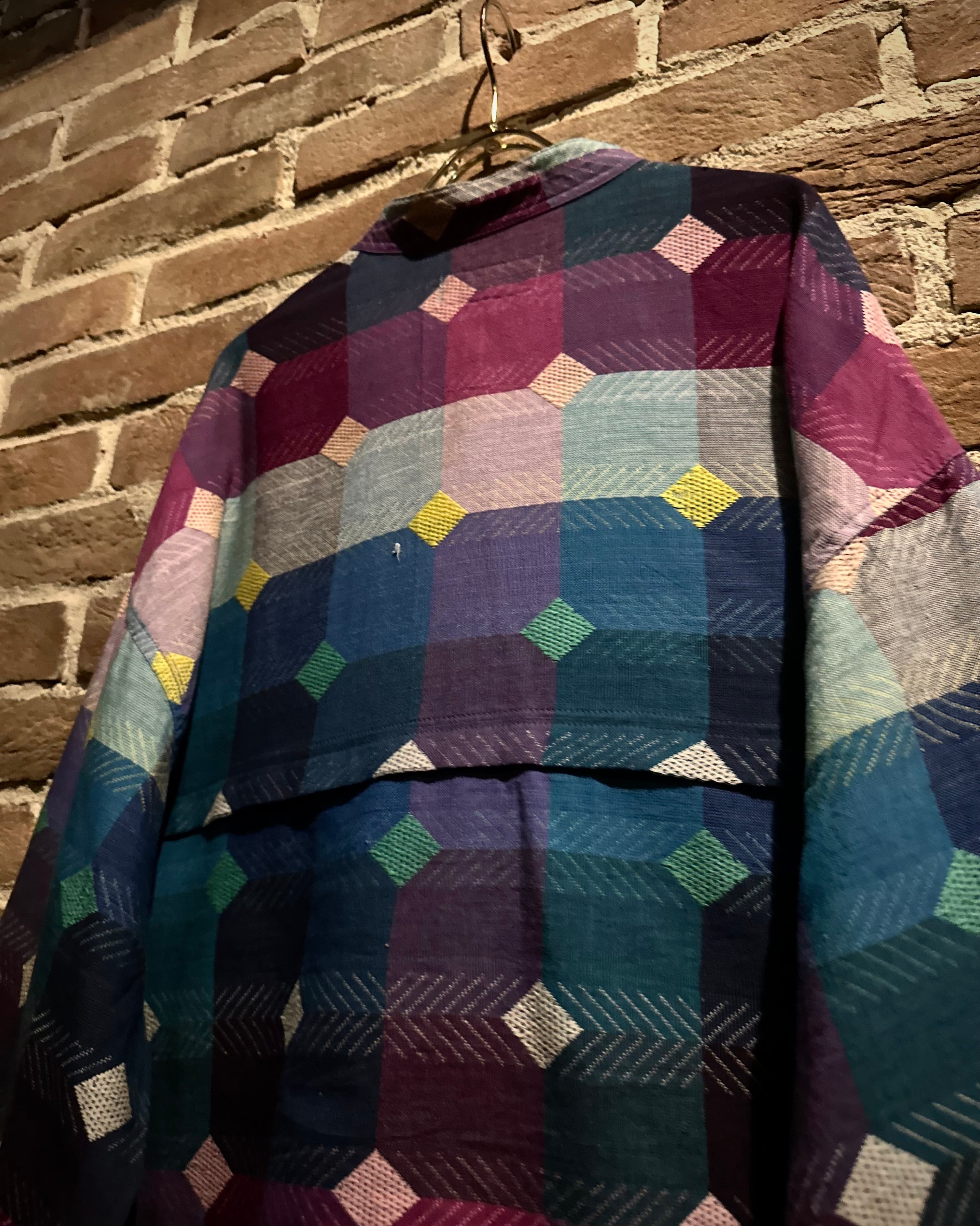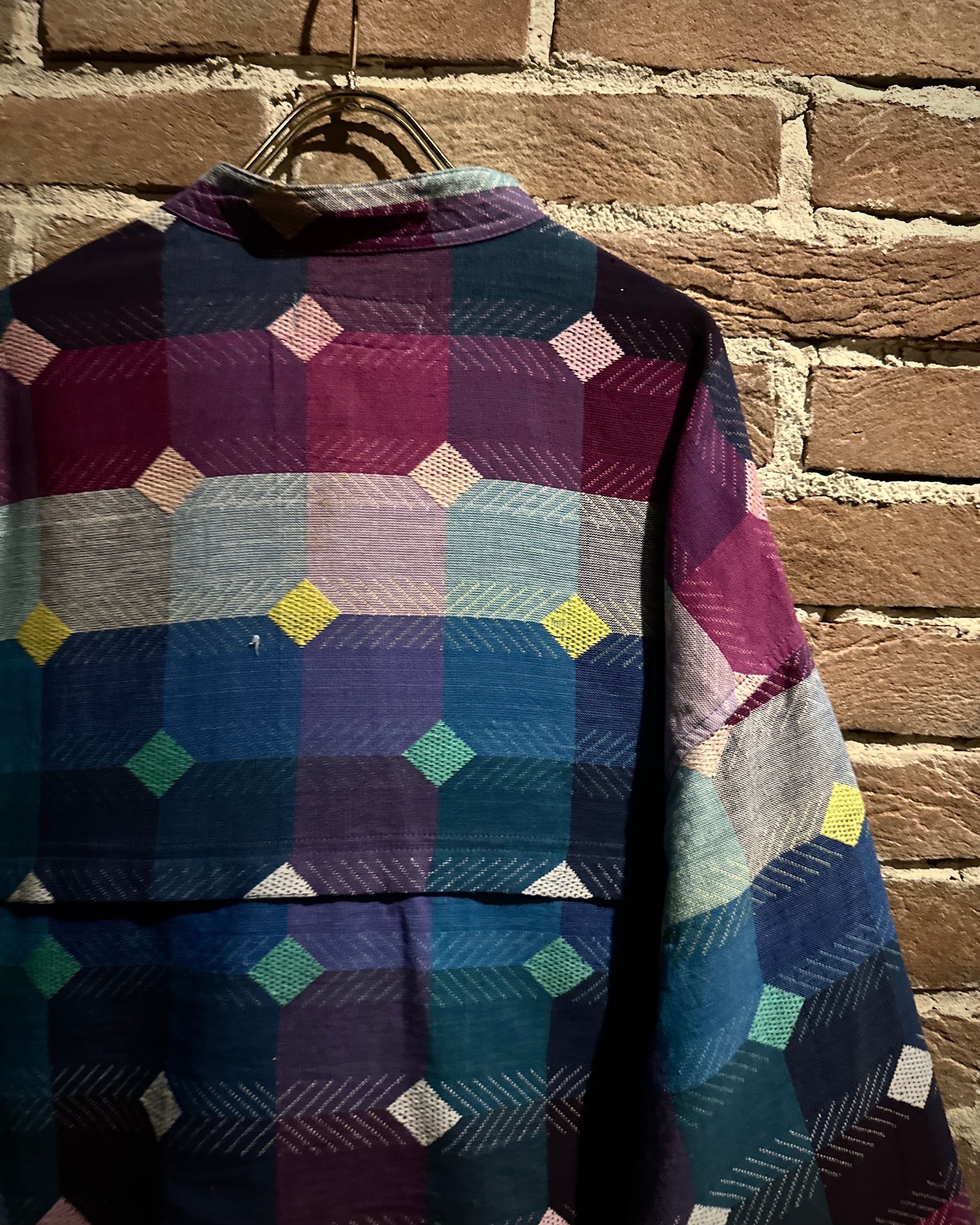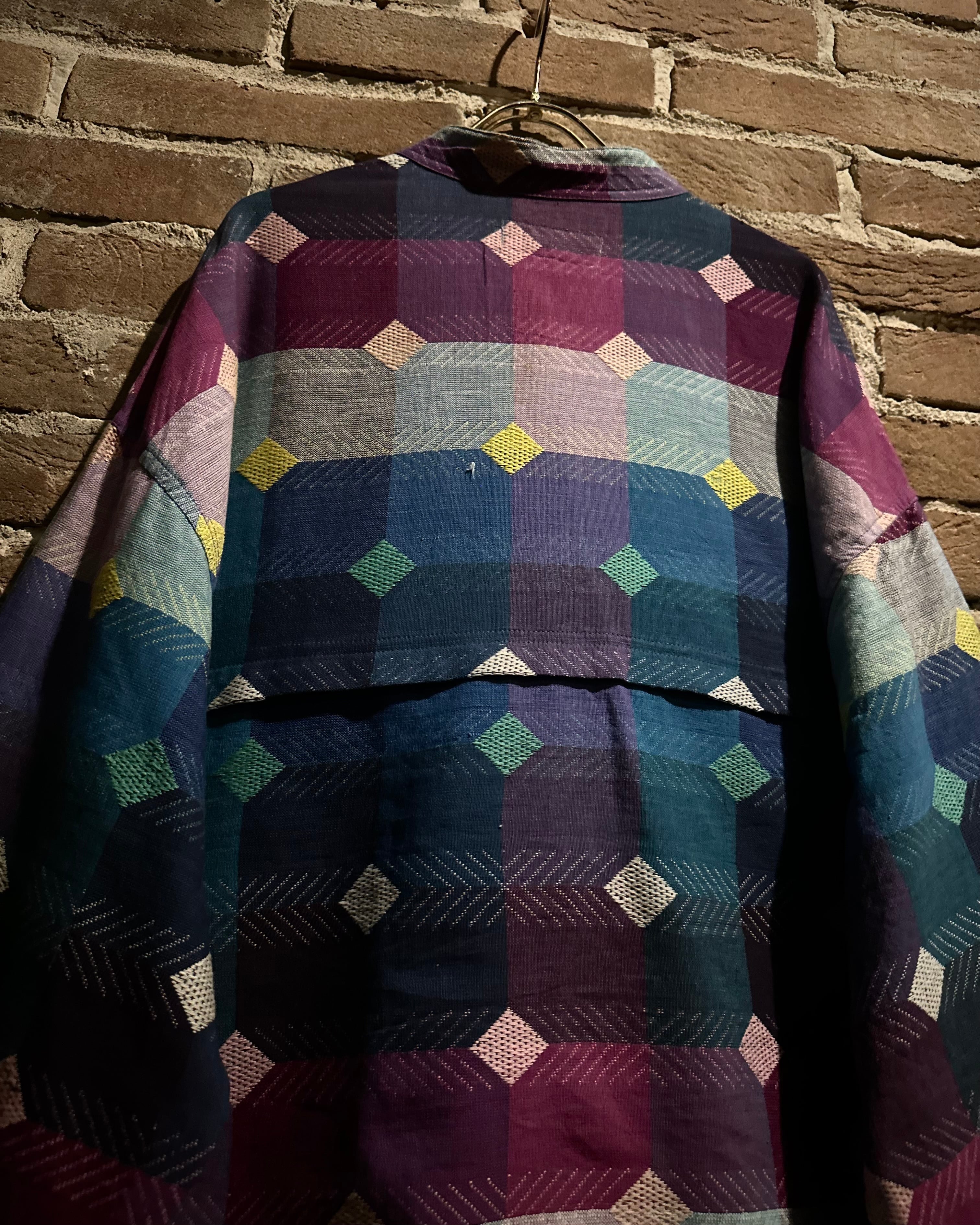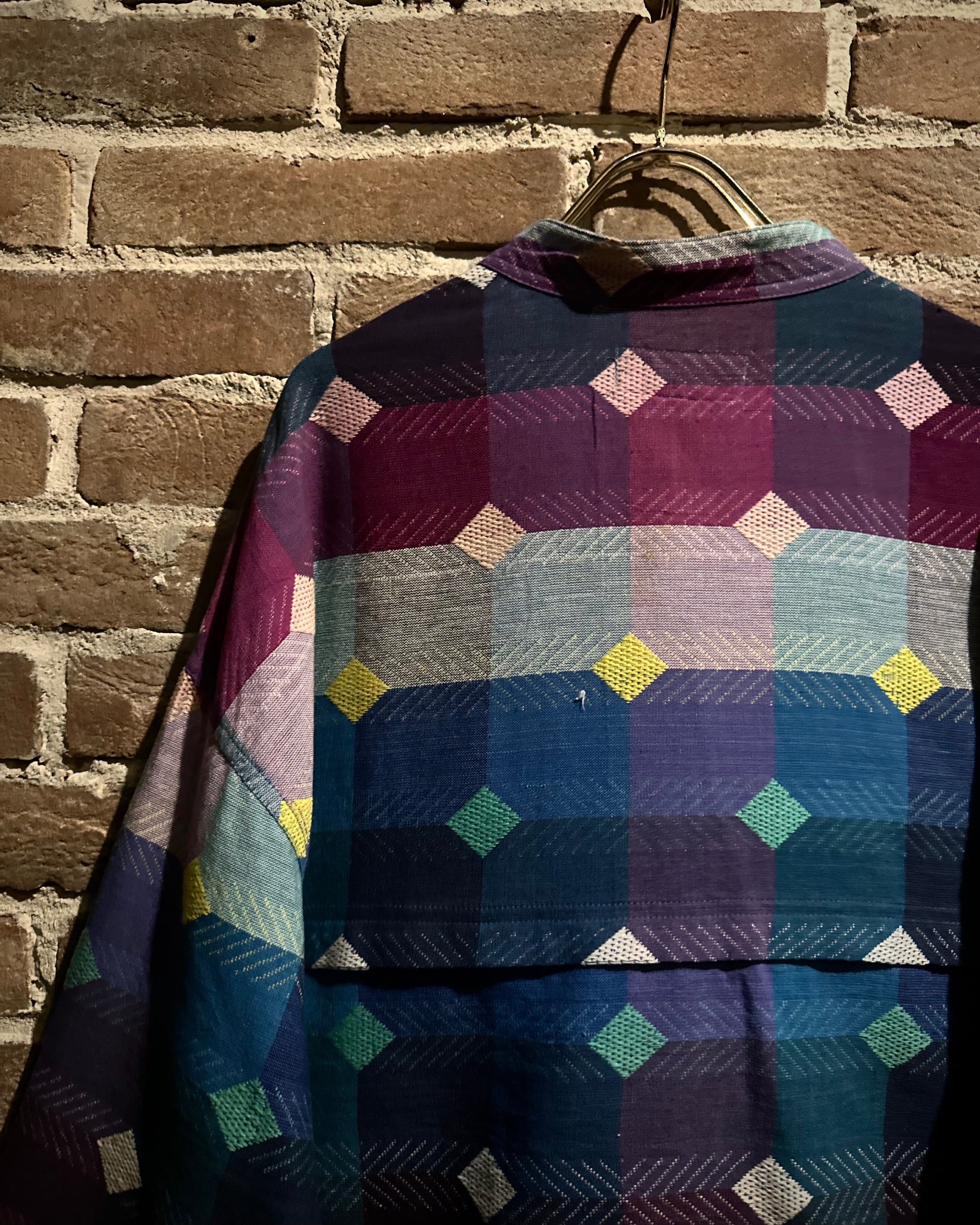 パープル、ブルー、ピンク、グリーン、イエローといった鮮やかな色彩が交差した、幾何学的なデザインのプルオーバー。