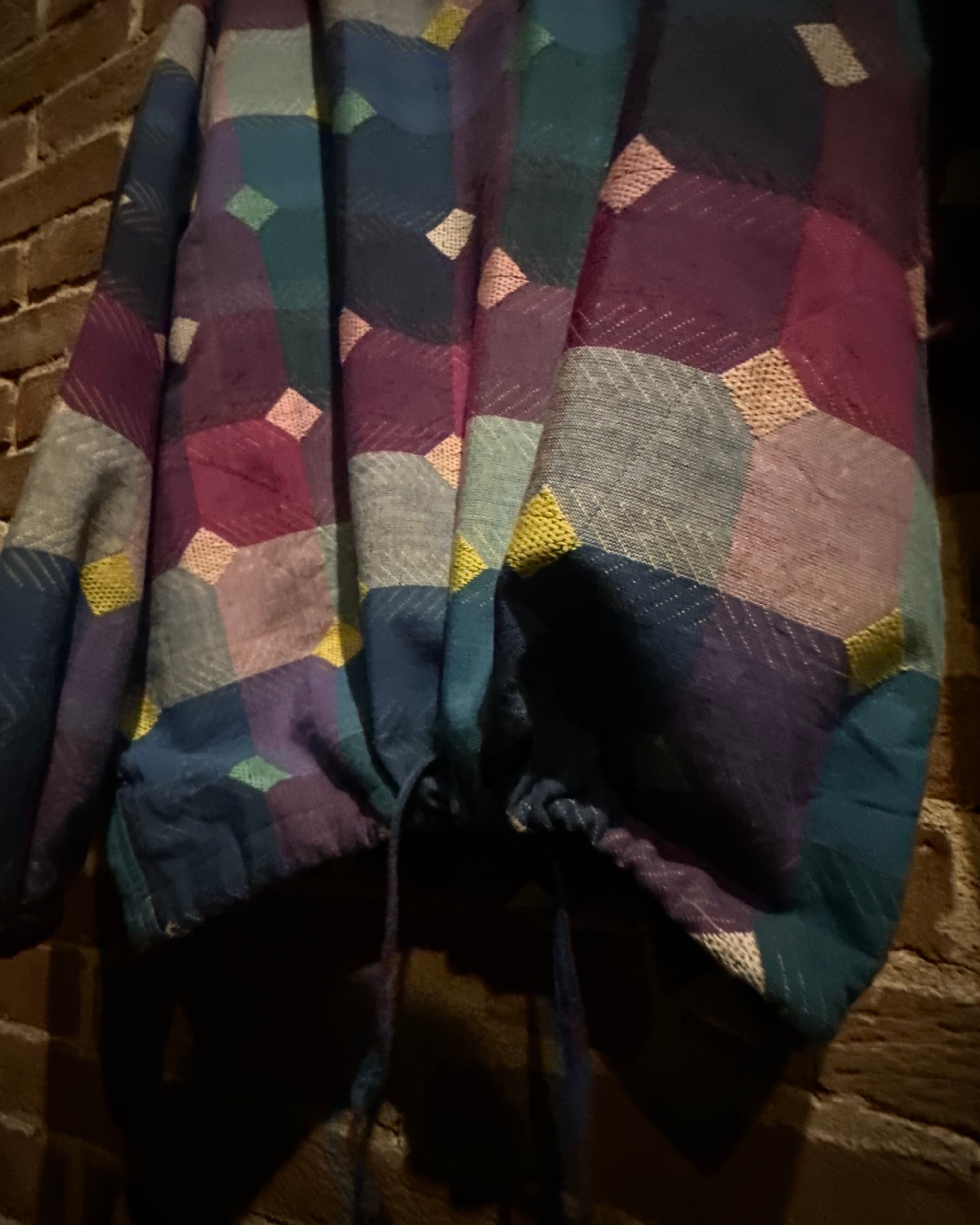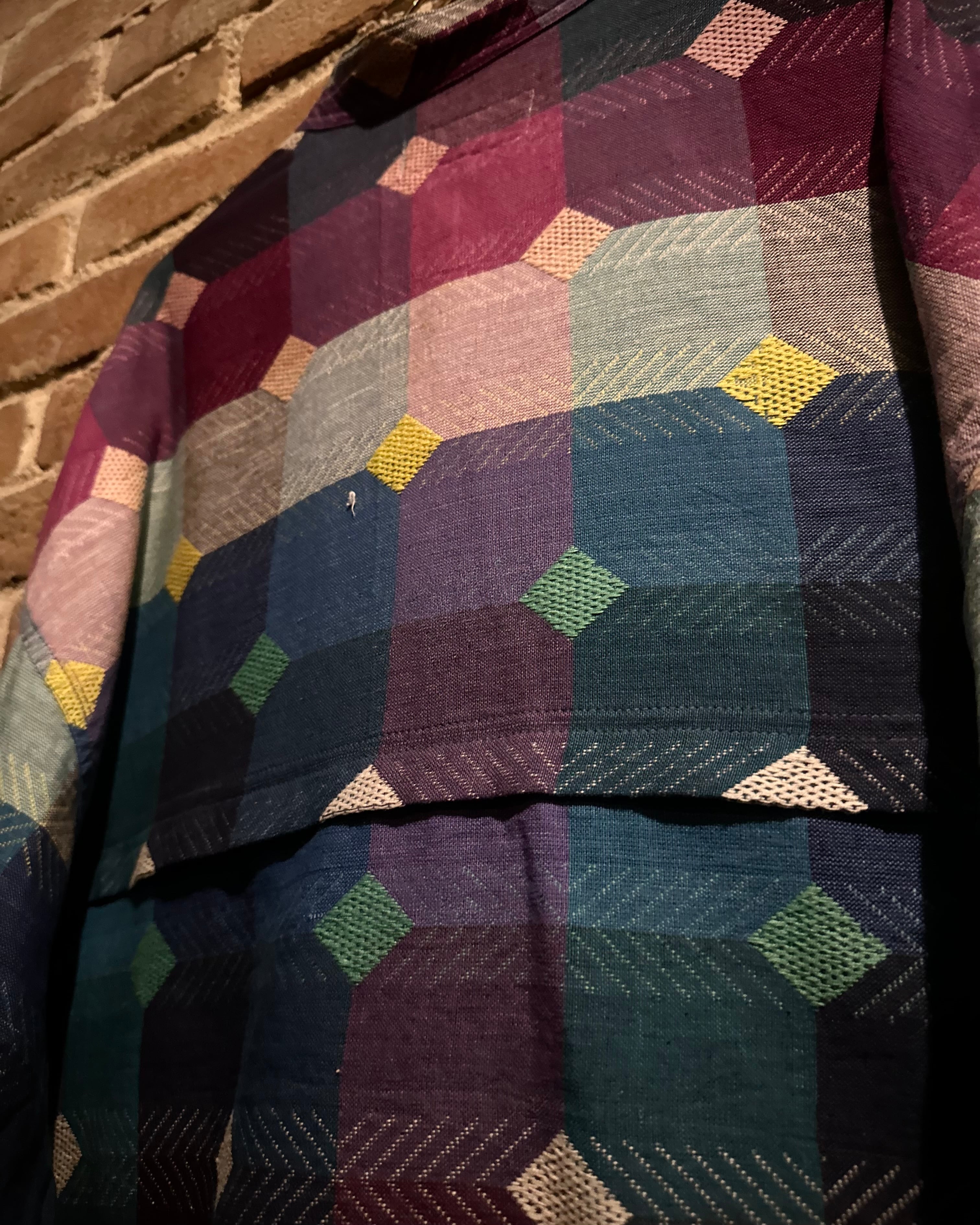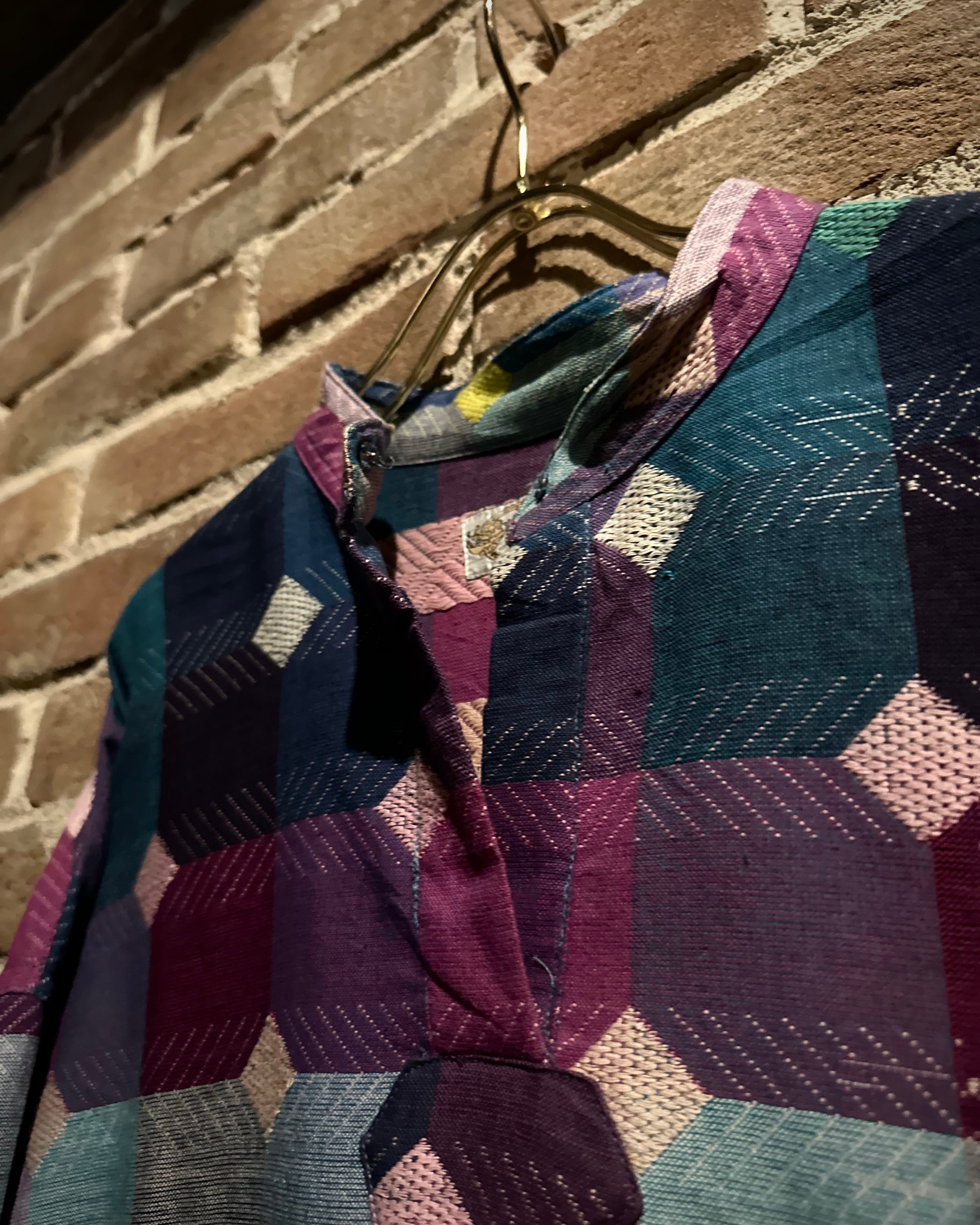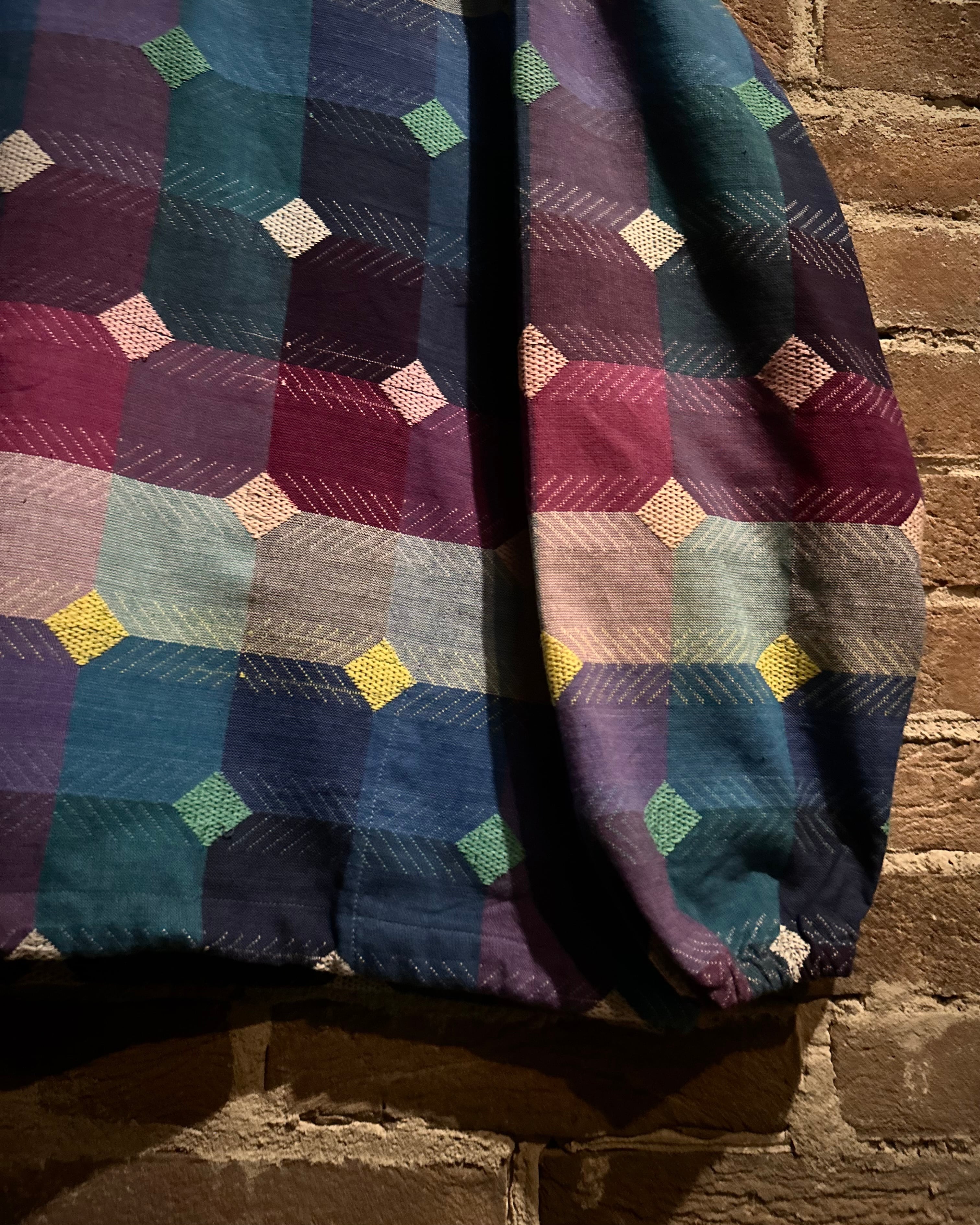 パープル、ブルー、ピンク、グリーン、イエローといった鮮やかな色彩が交差した、幾何学的なデザインのプルオーバー。