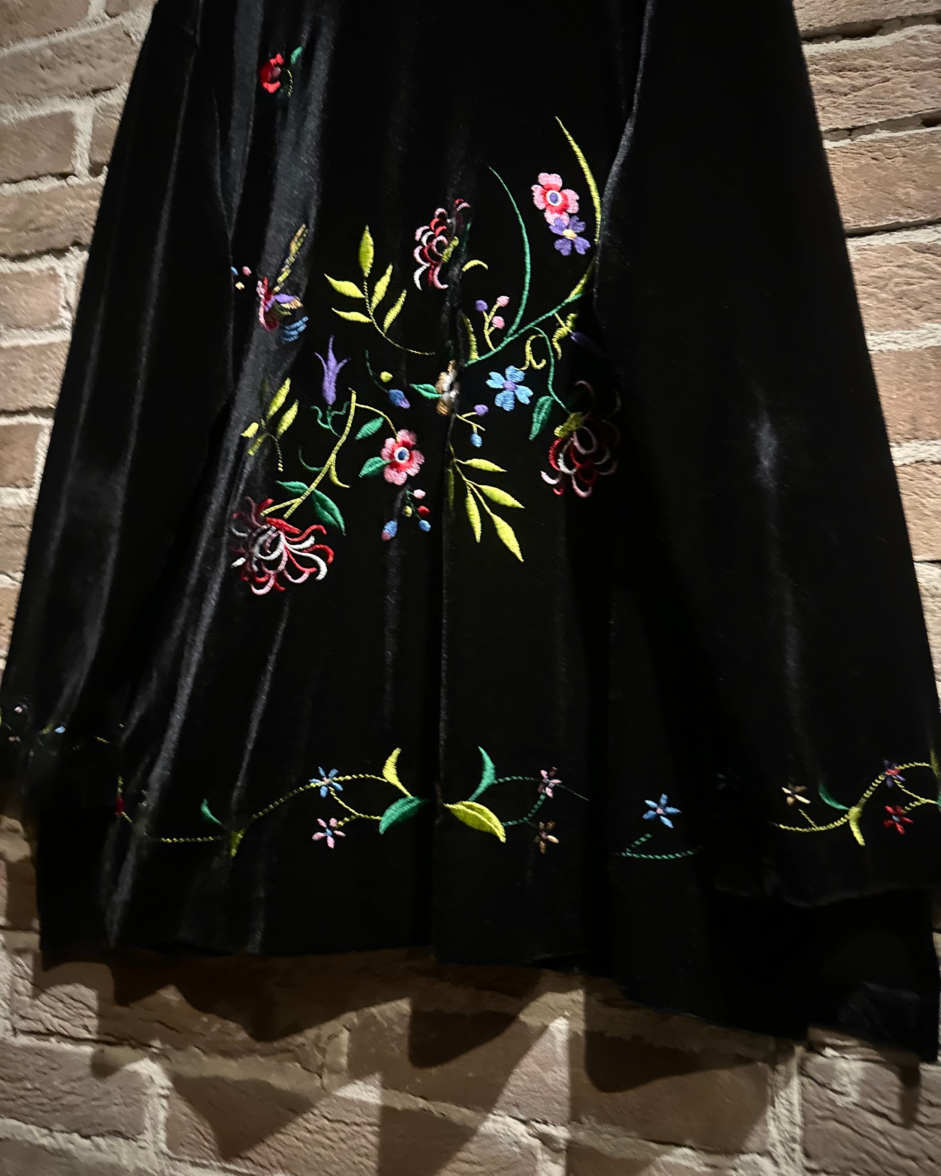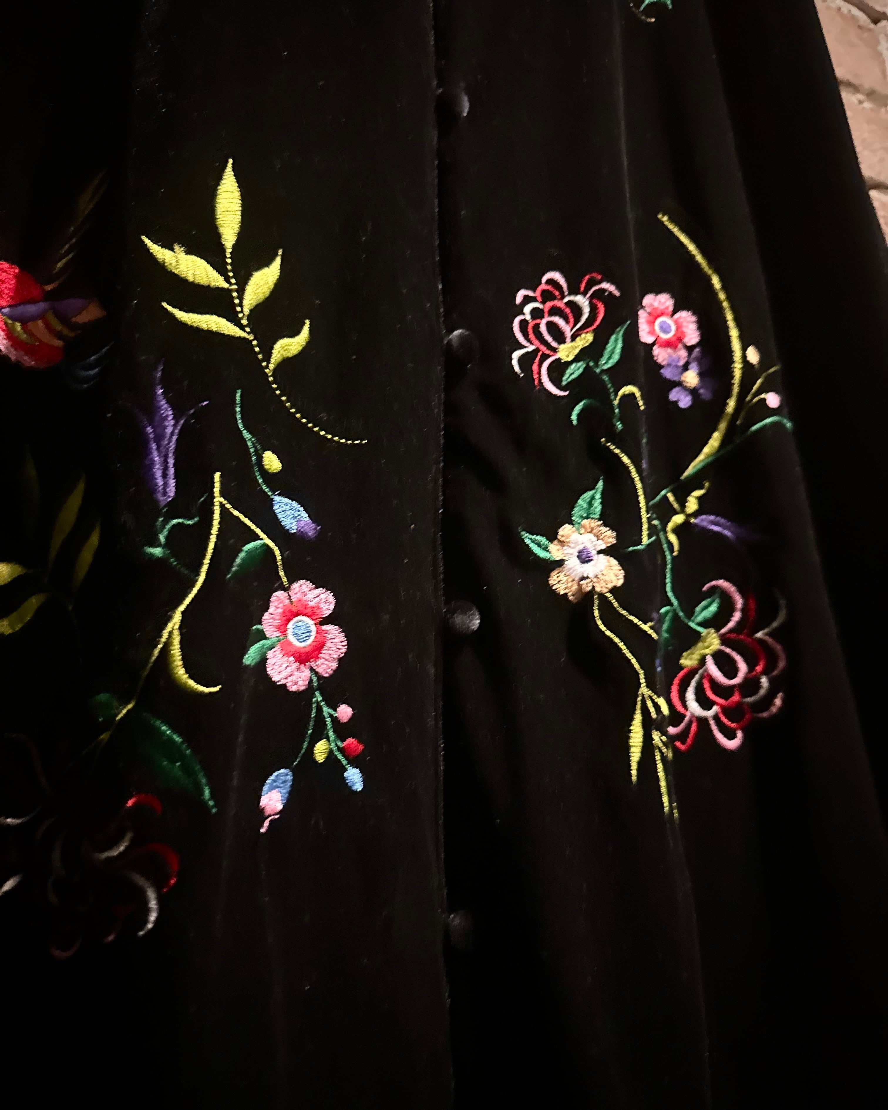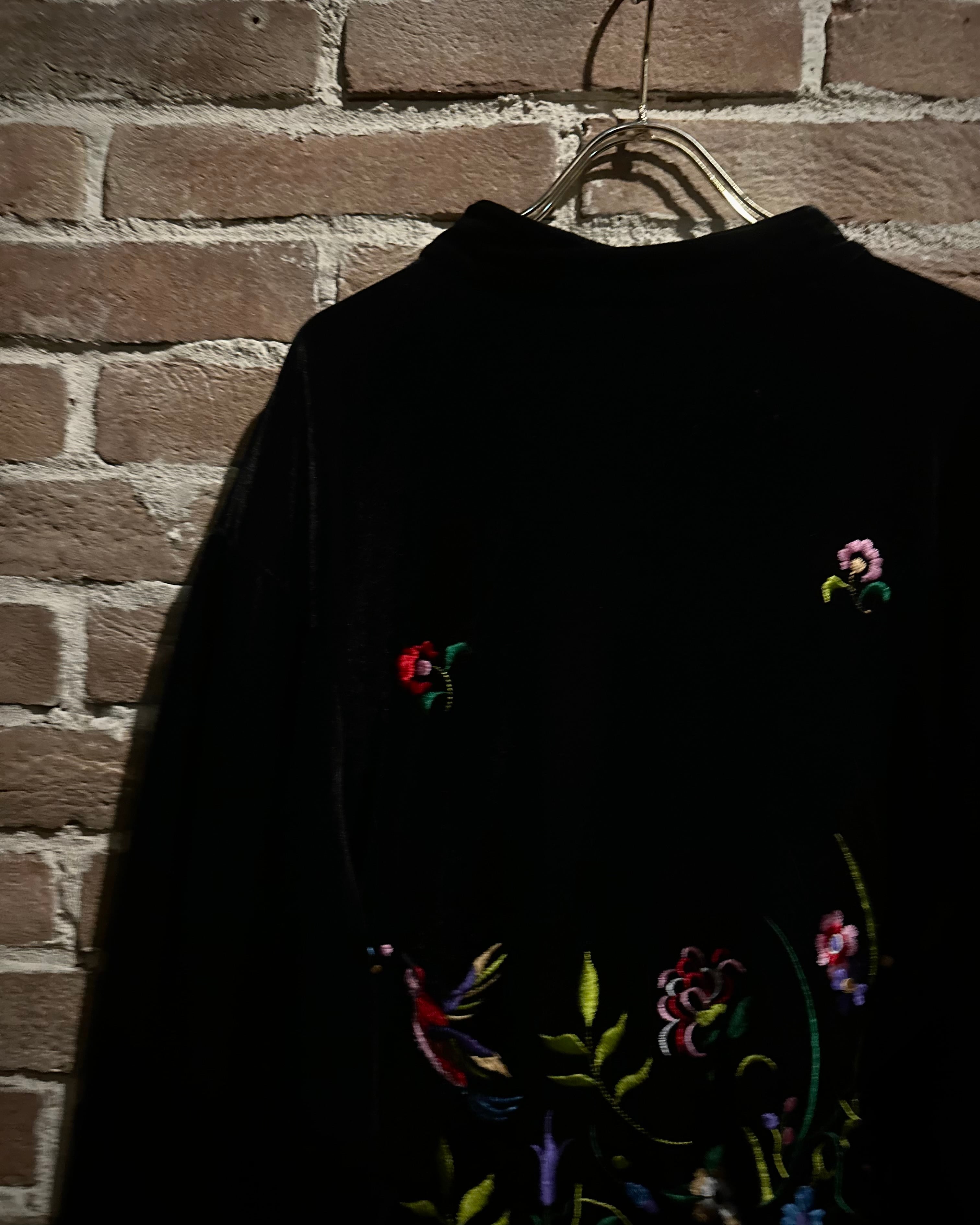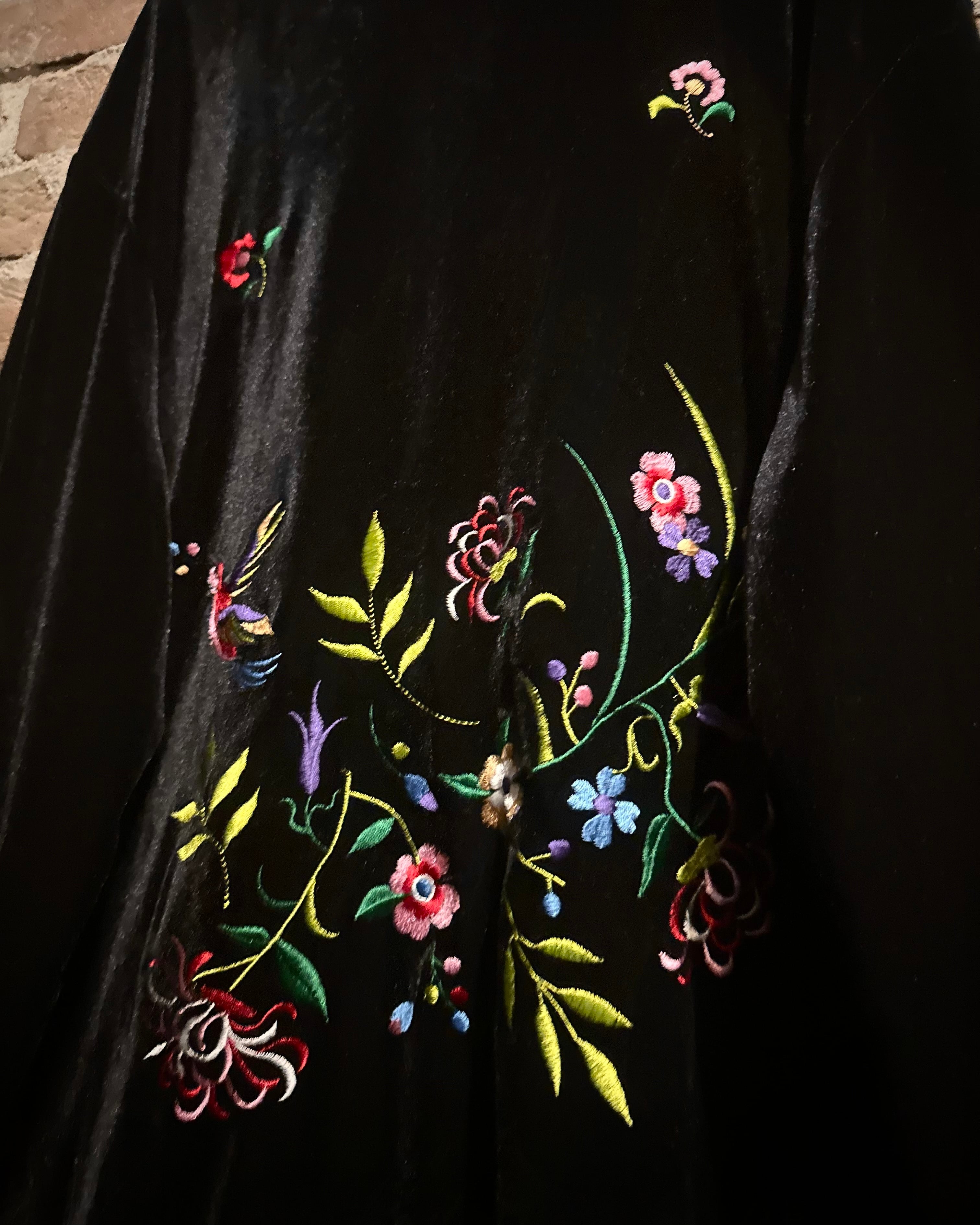 深みのある漆黒のベースに、色鮮やかな花々や鳥の刺繍が随所に施され、まるで絵画のような立体感を表現。刺繍糸特有の艶やかな光沢が角度によって煌めき、重厚なベロア生地とのコントラストが圧倒的な存在感を放ちます。