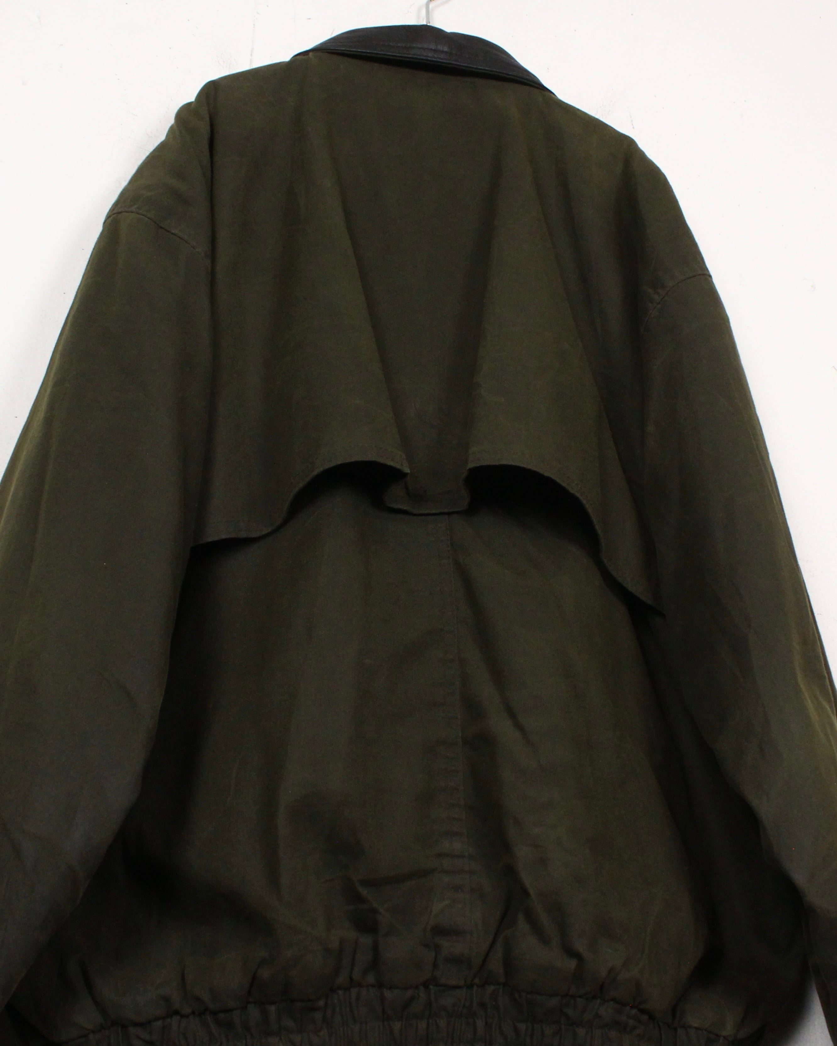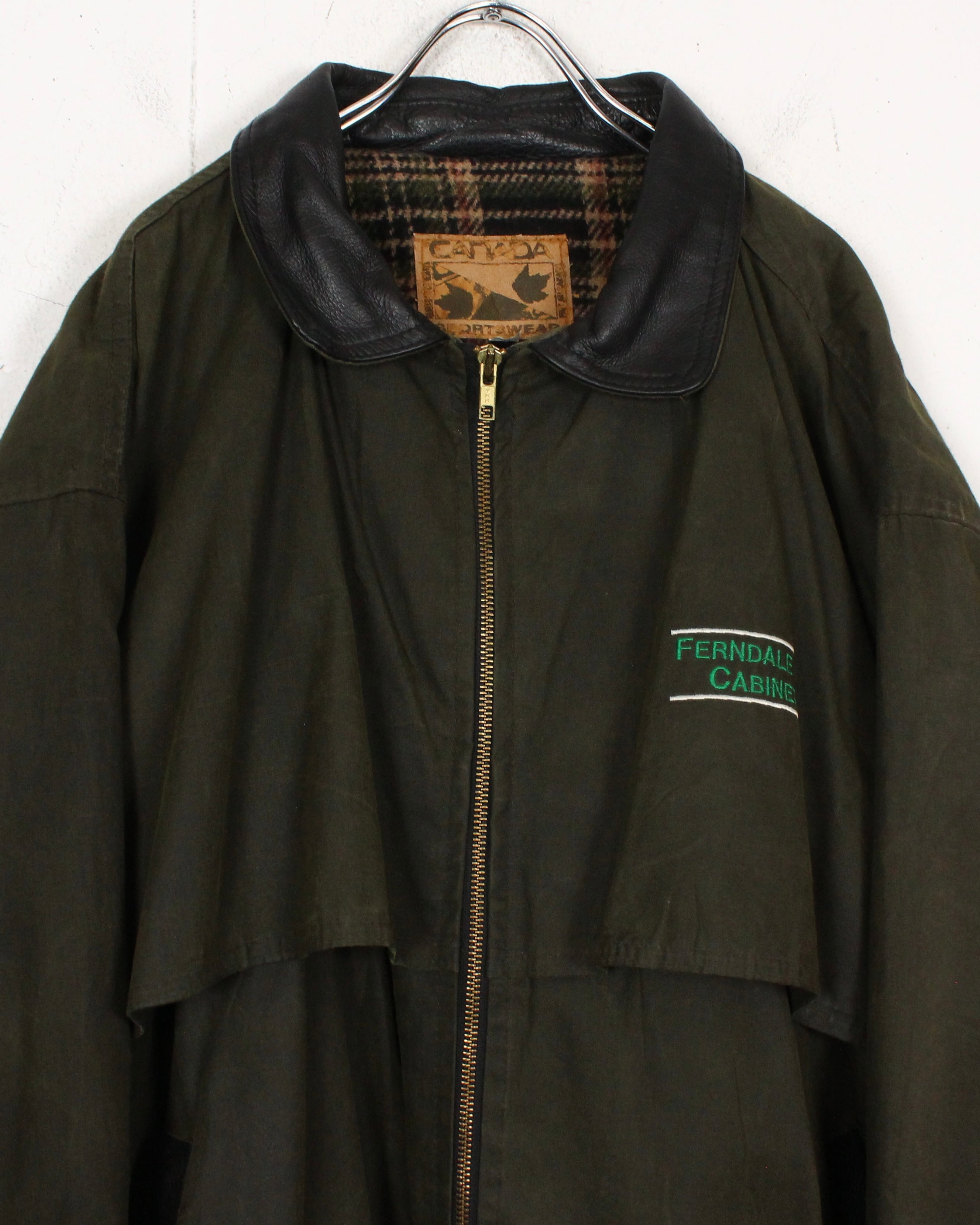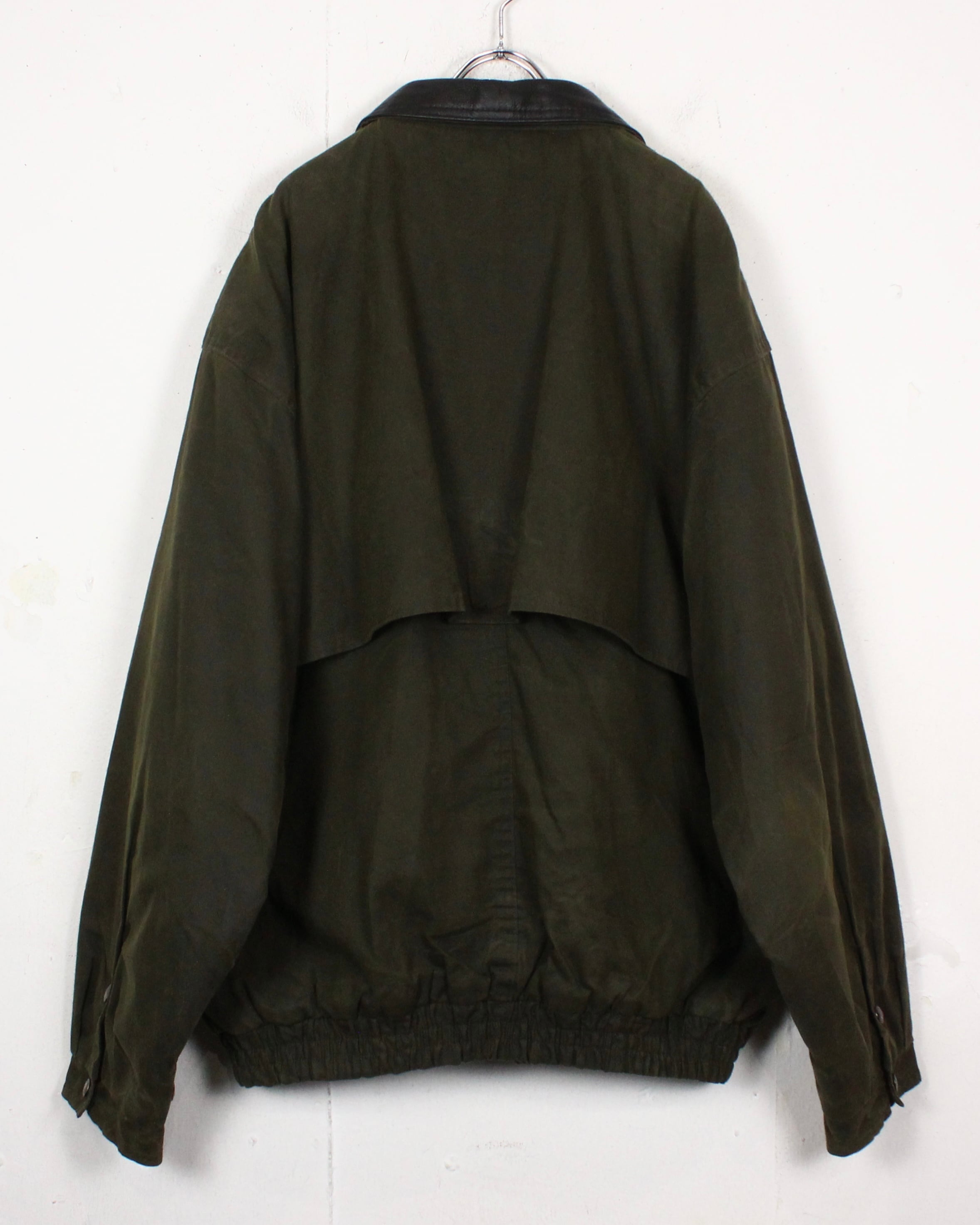 無骨で実用的な表情を見せる、レザーを切り替えたダック生地のオイルドジャケット。
