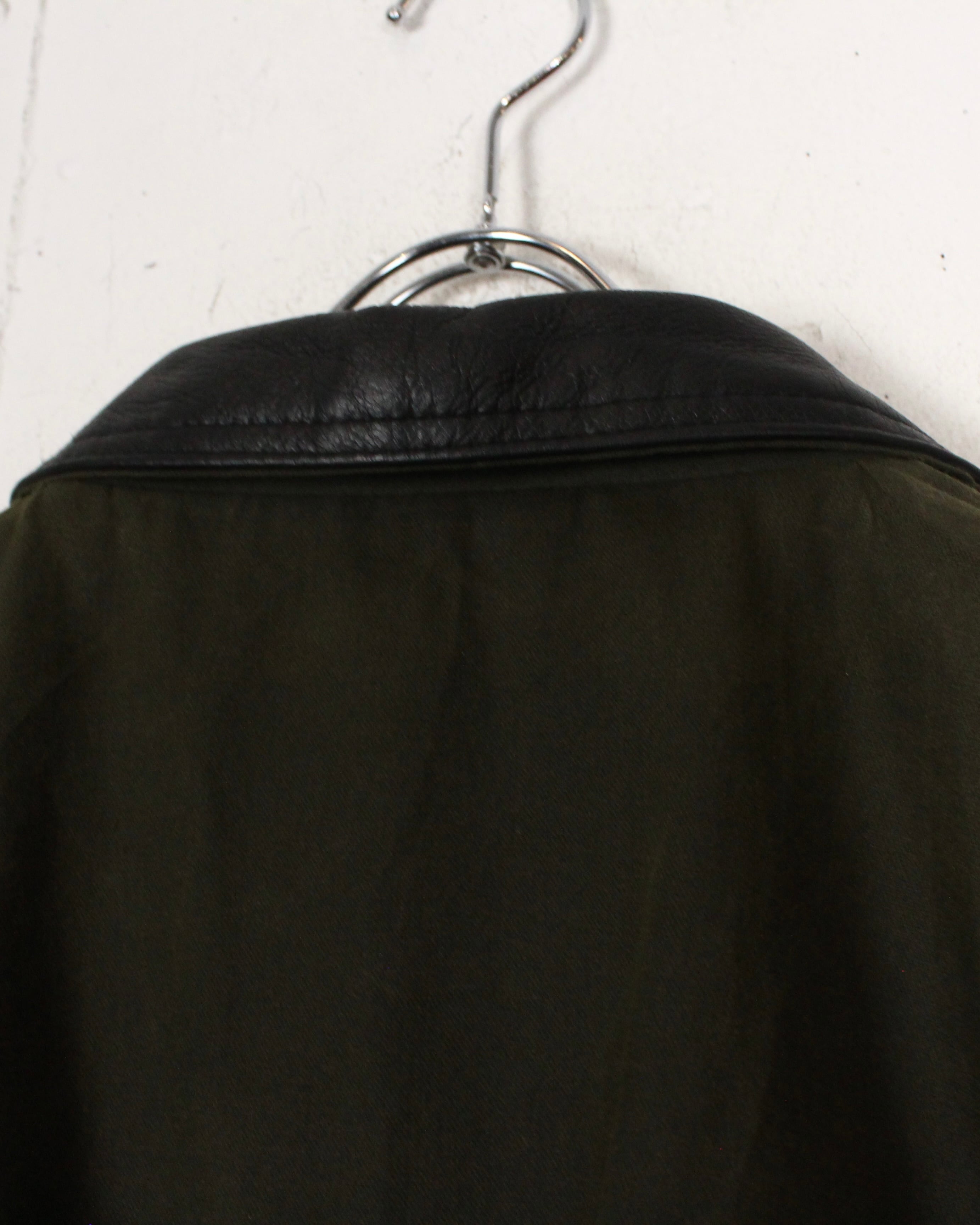 襟やポケット口には艶やかなブラックレザーを贅沢にあしらい、無骨なボディとのコントラストが秀逸。素材の切り替えによる立体感が、シンプルなデザインに奥行きを与えています。