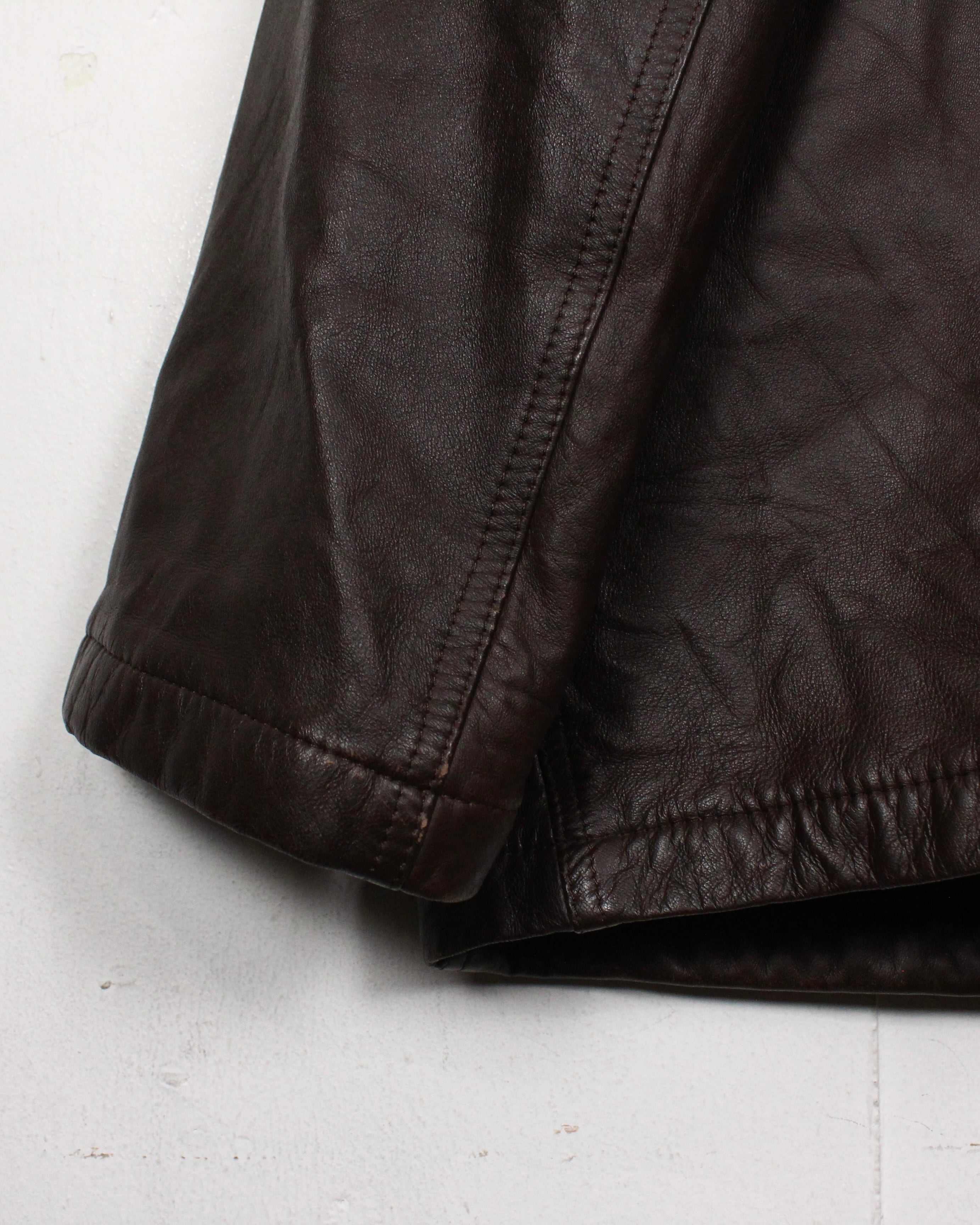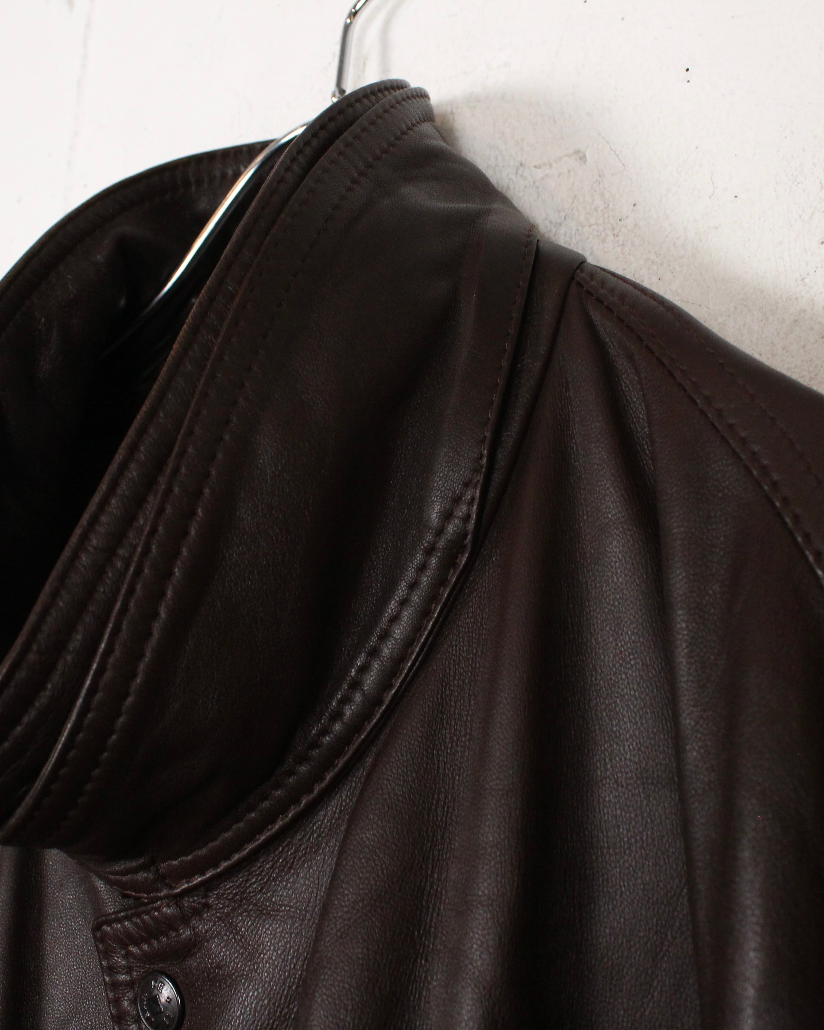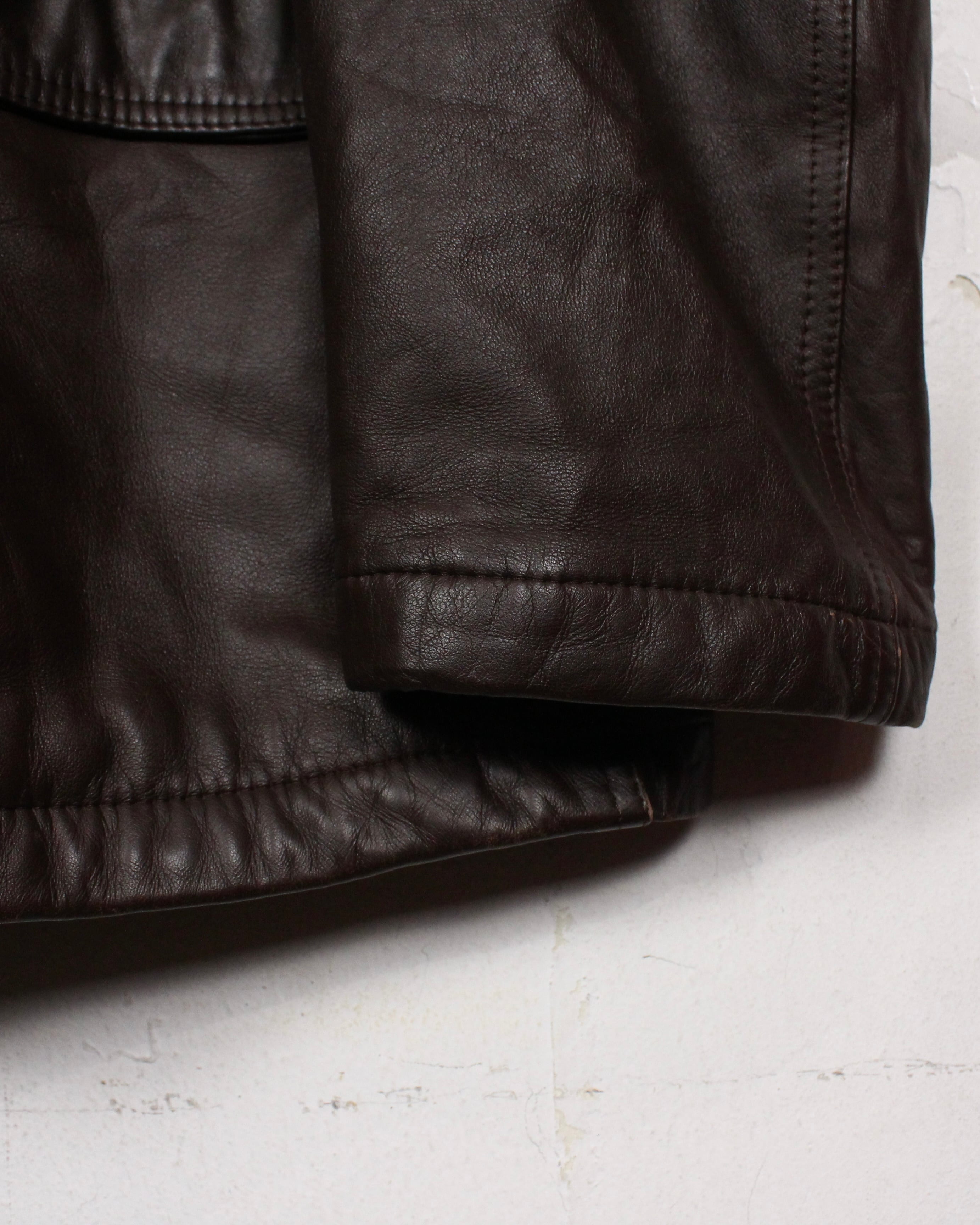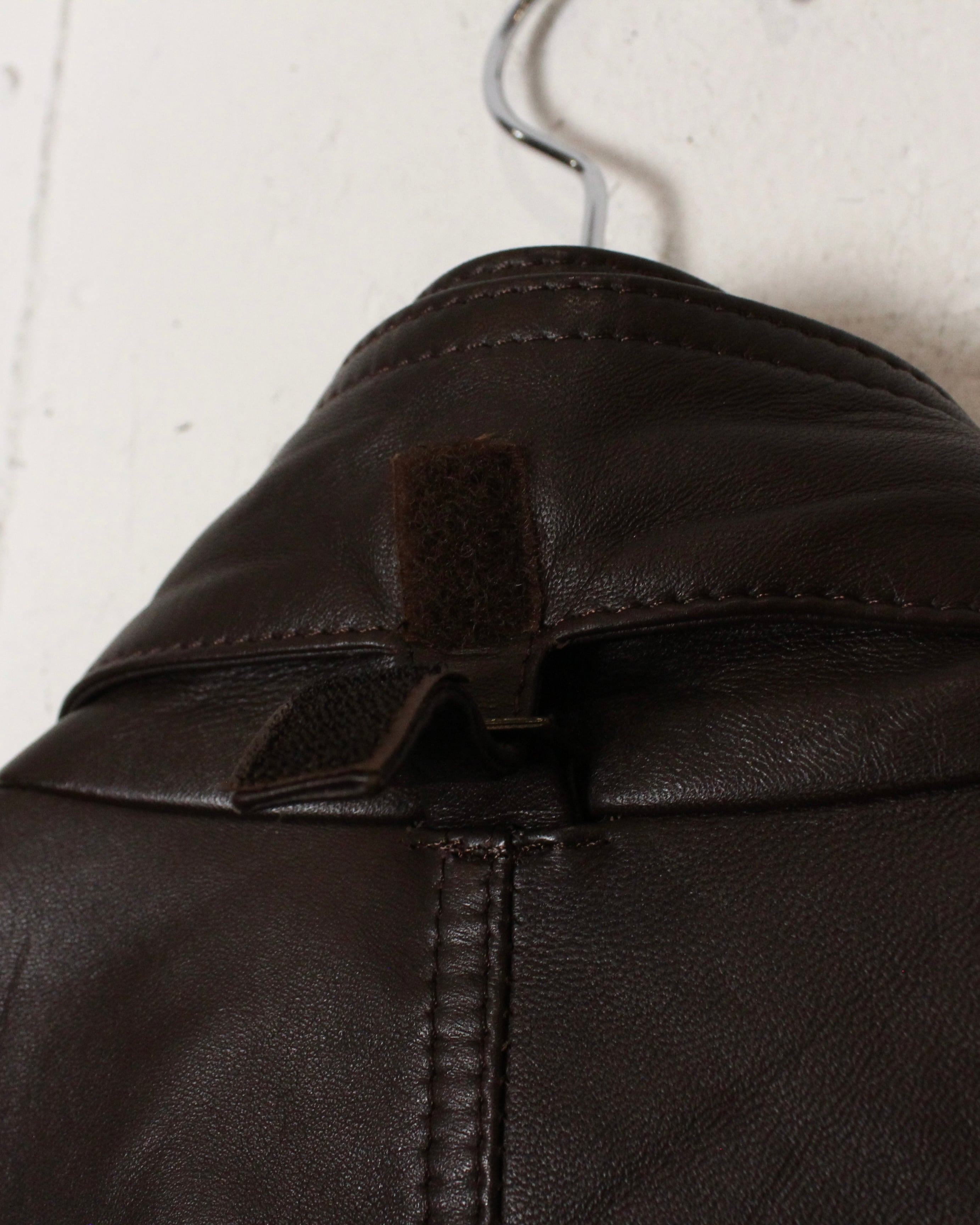深みのあるダークブラウンのラムレザーは、手に取った瞬間に伝わる重厚感と柔らかさを併せ持ち、リアルレザーならではの経年変化を存分に味わえる極上の質感。光の加減で浮かび上がる鈍い光沢は、フェイクには再現できない奥行きを放ち、着込むほどに身体に馴染み、唯一無二の表情に育ててくれます。