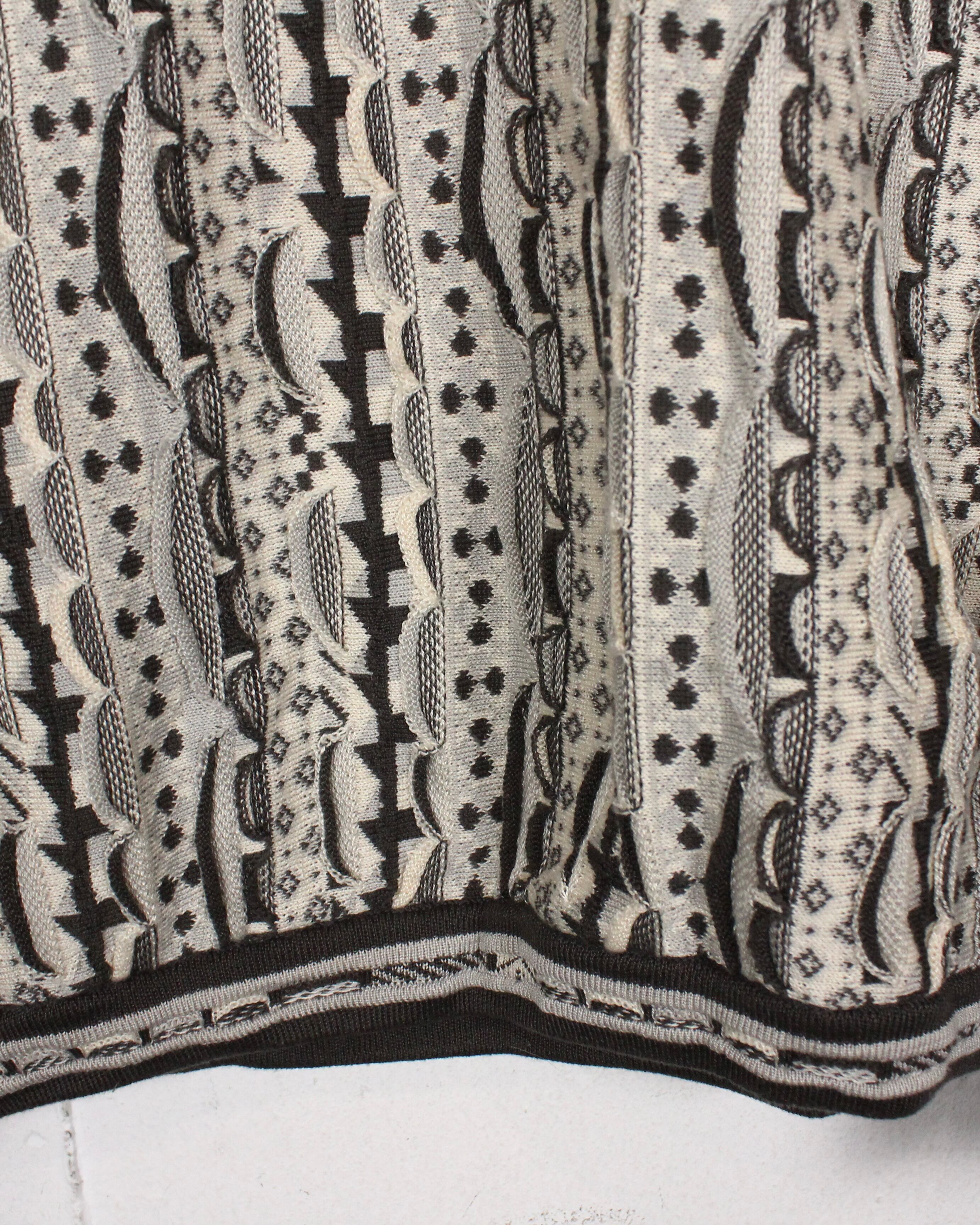 ブラック、グレー、ホワイトで構成された、稀有なモノトーンの配色の逸品。派手さを抑えたトーンながら、立体的な編み模様と凹凸のある織り柄が陰影を際立たせ、シックでありながら抜群の存在感を放ちます。