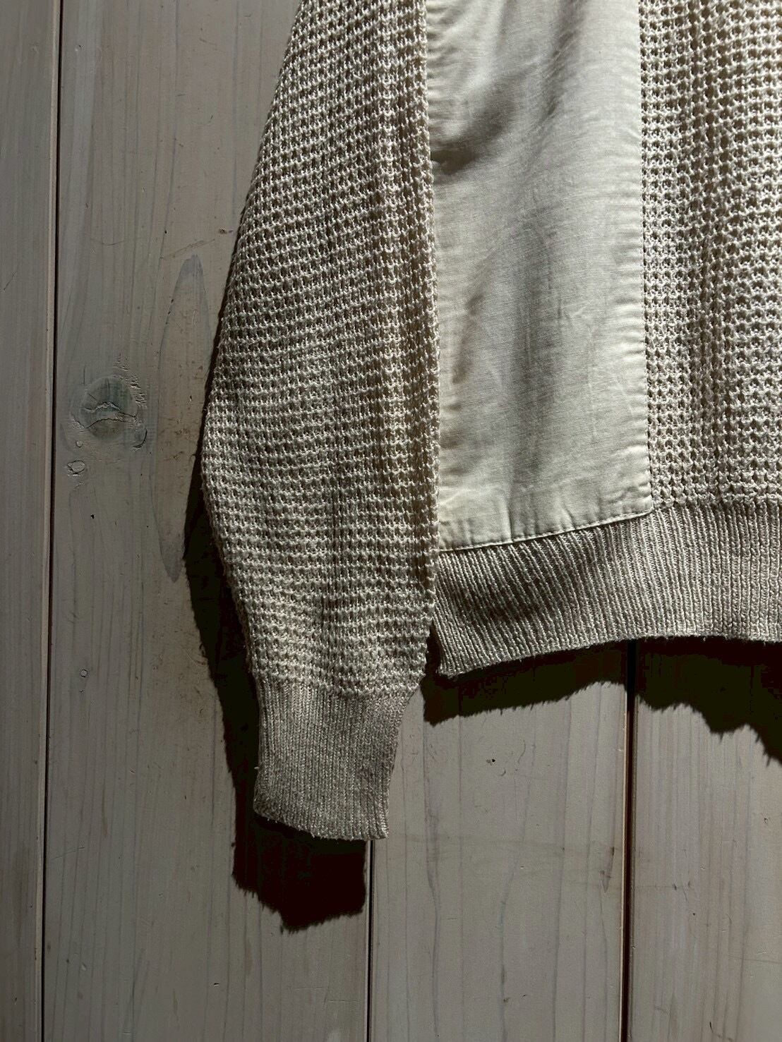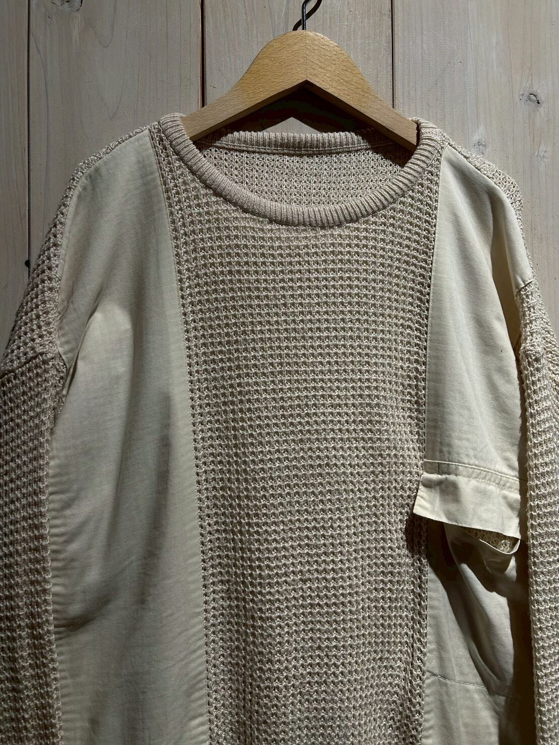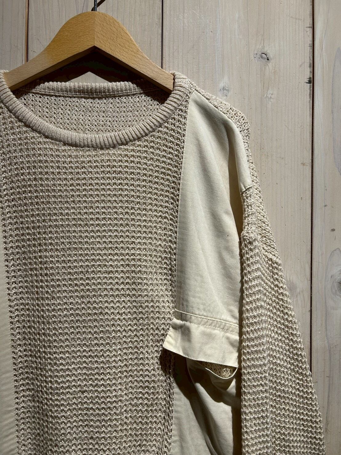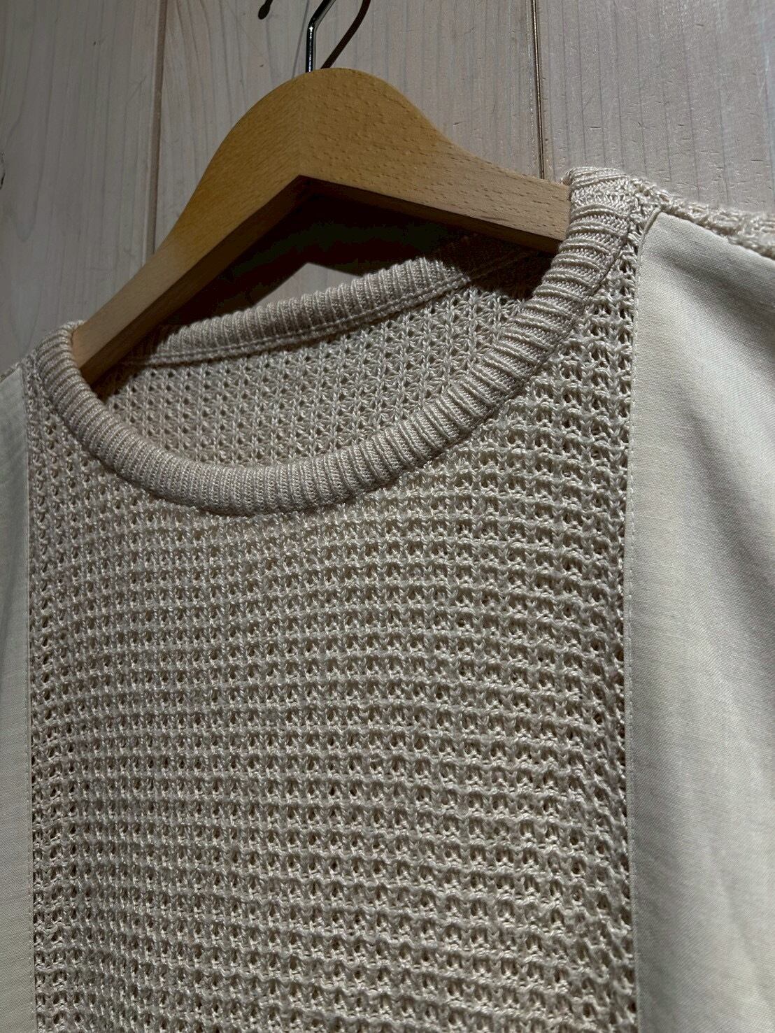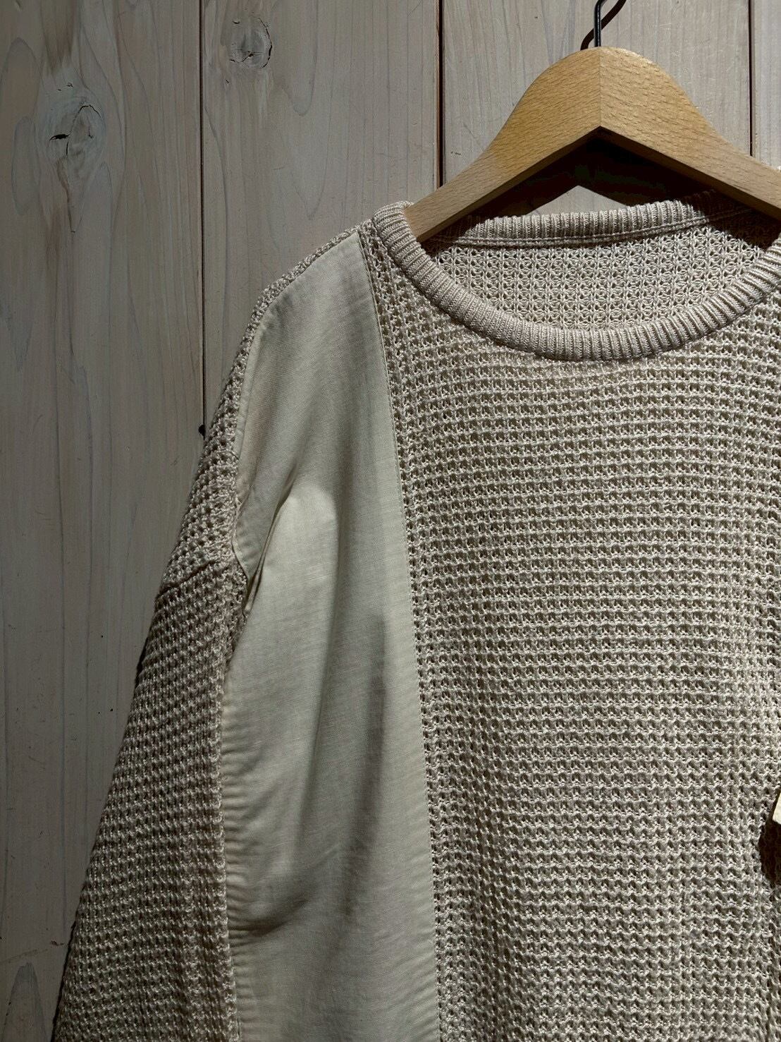ワッフル編みのボディをベースに、フロントにはコットン地を切り替え、異素材を組み合わせることで立体的な表情を生み出したニット。