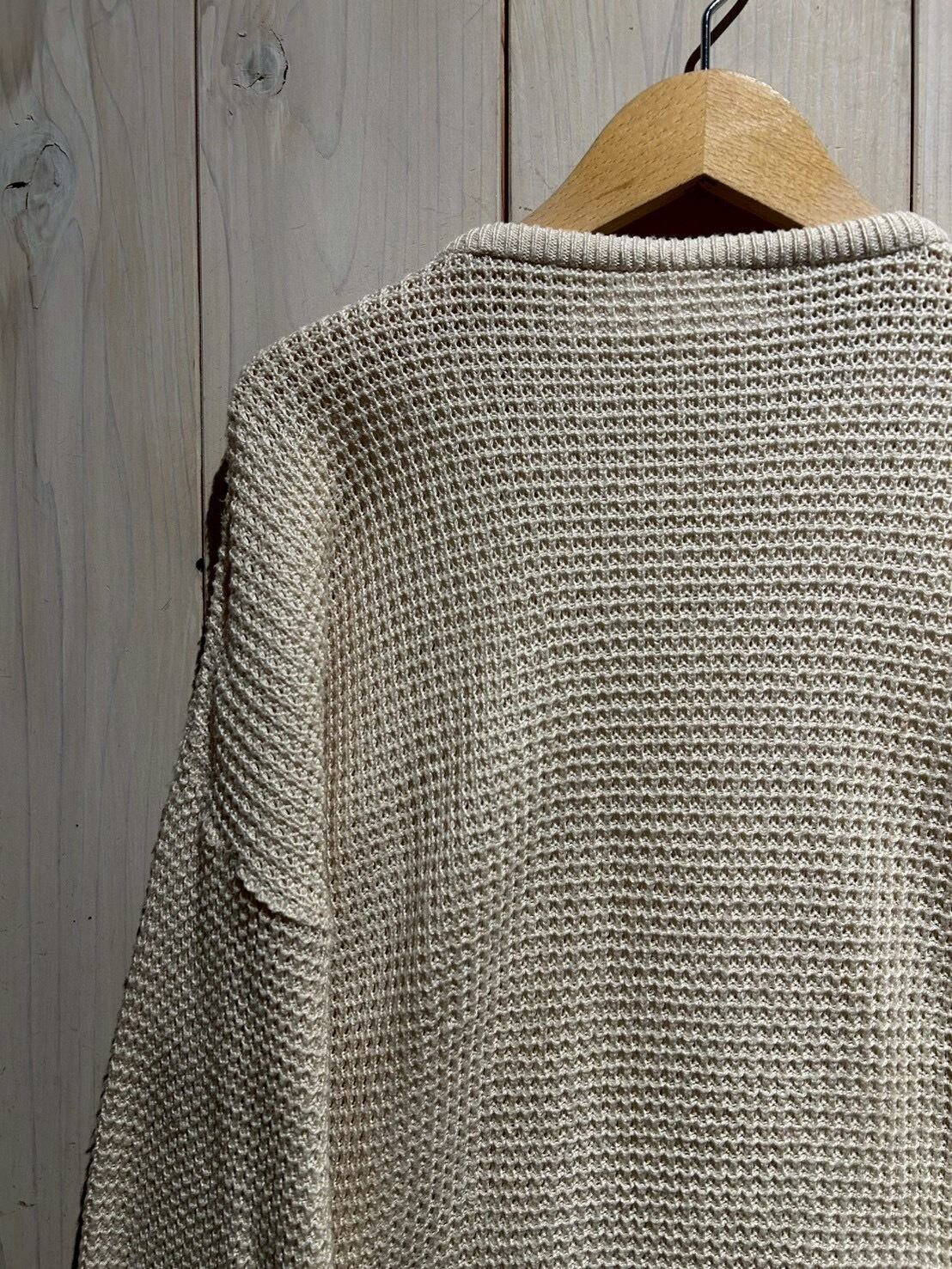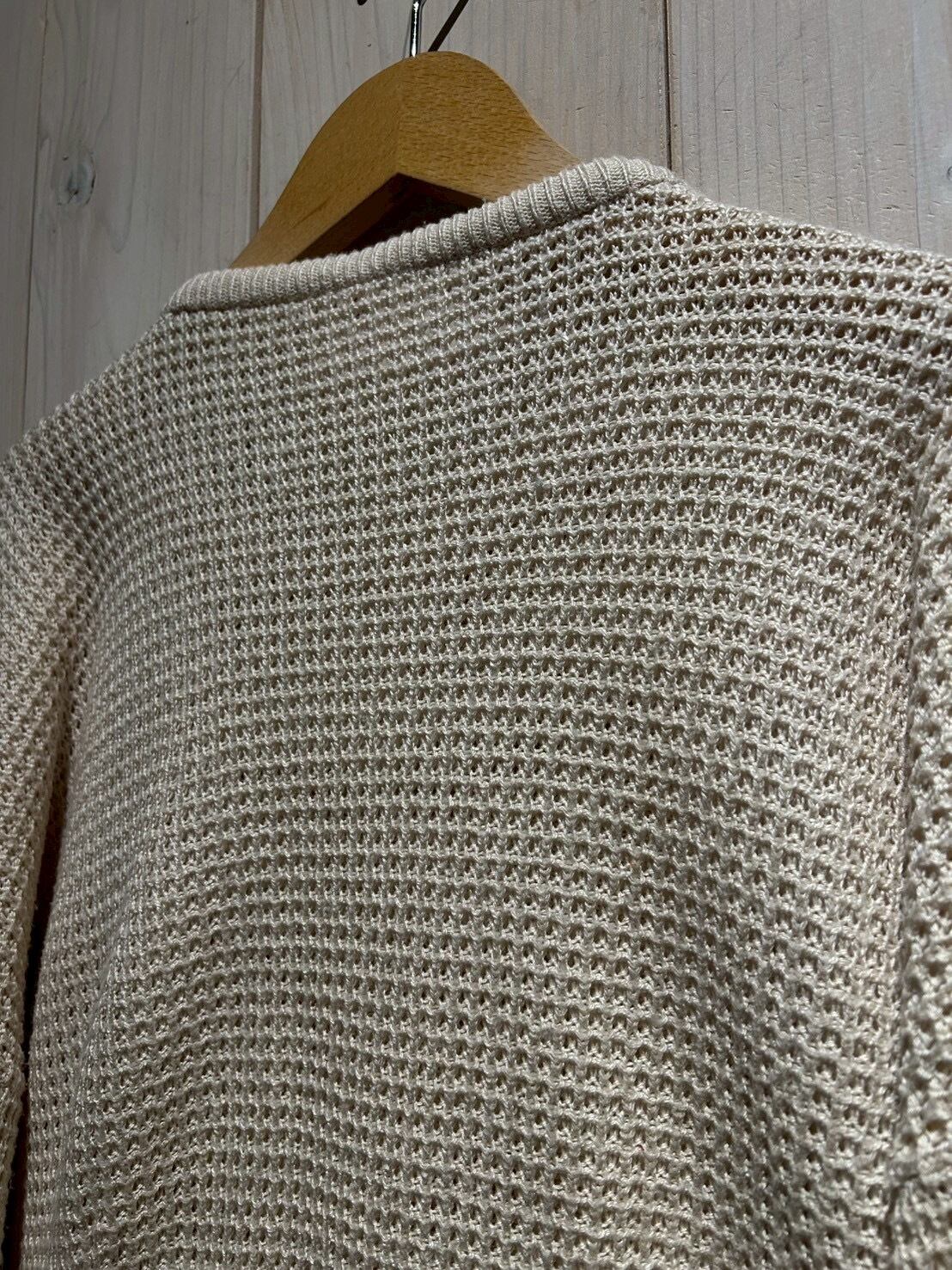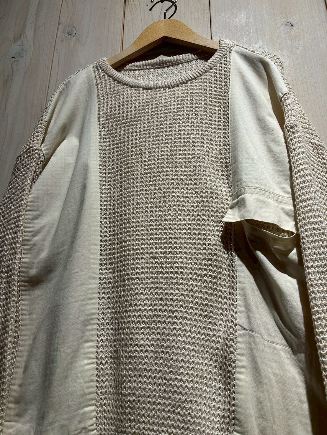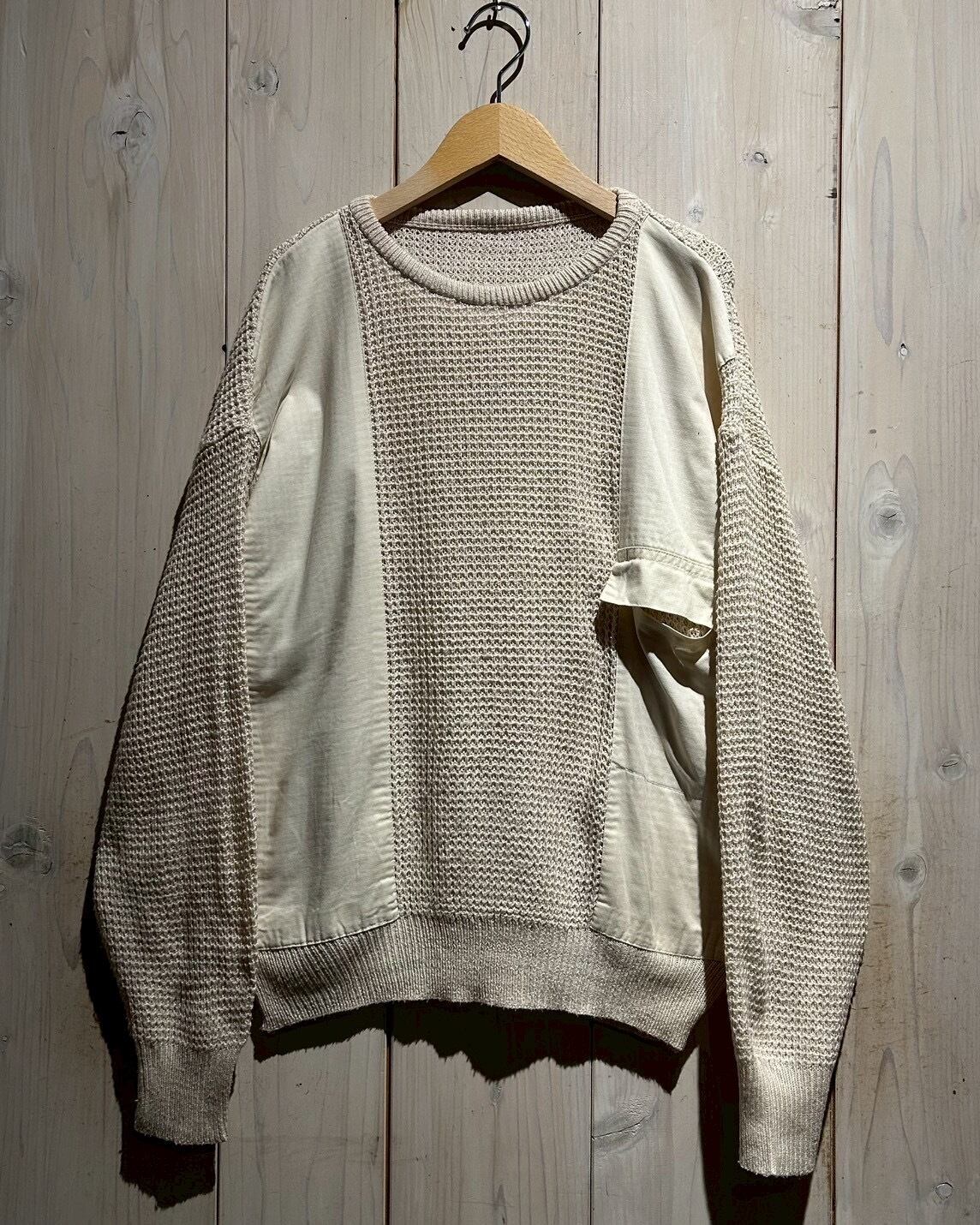 ワッフル編みのボディをベースに、フロントにはコットン地を切り替え、異素材を組み合わせることで立体的な表情を生み出したニット。