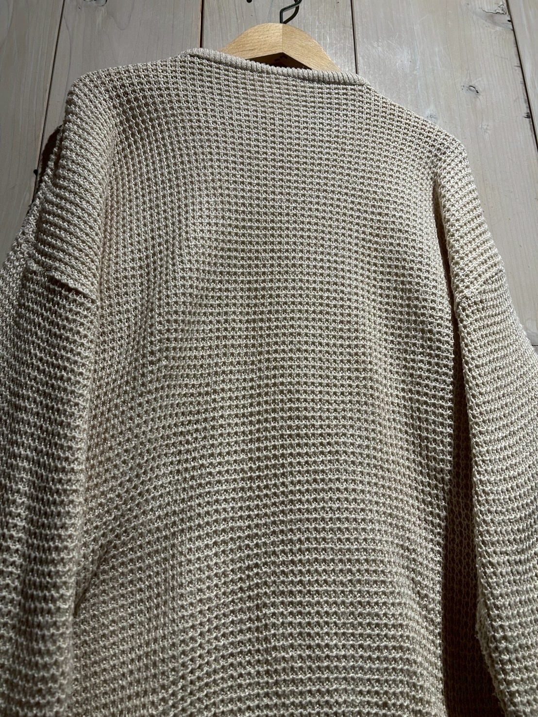 軽やかな素材感で、素肌に触れても心地よい着用感。ワッフルニット特有の凹凸が空気を含み、保温性を確保しながらも蒸れにくいのが嬉しいポイントです。リラックスしたサイジングで、一枚でもインナー使いでも活躍し、幅広いスタイリングに対応。
