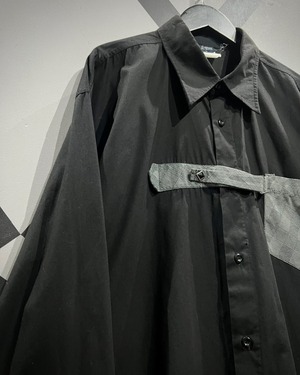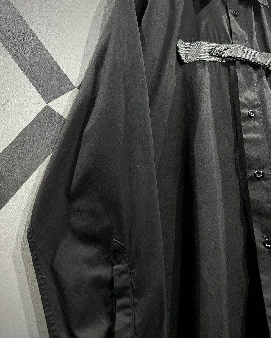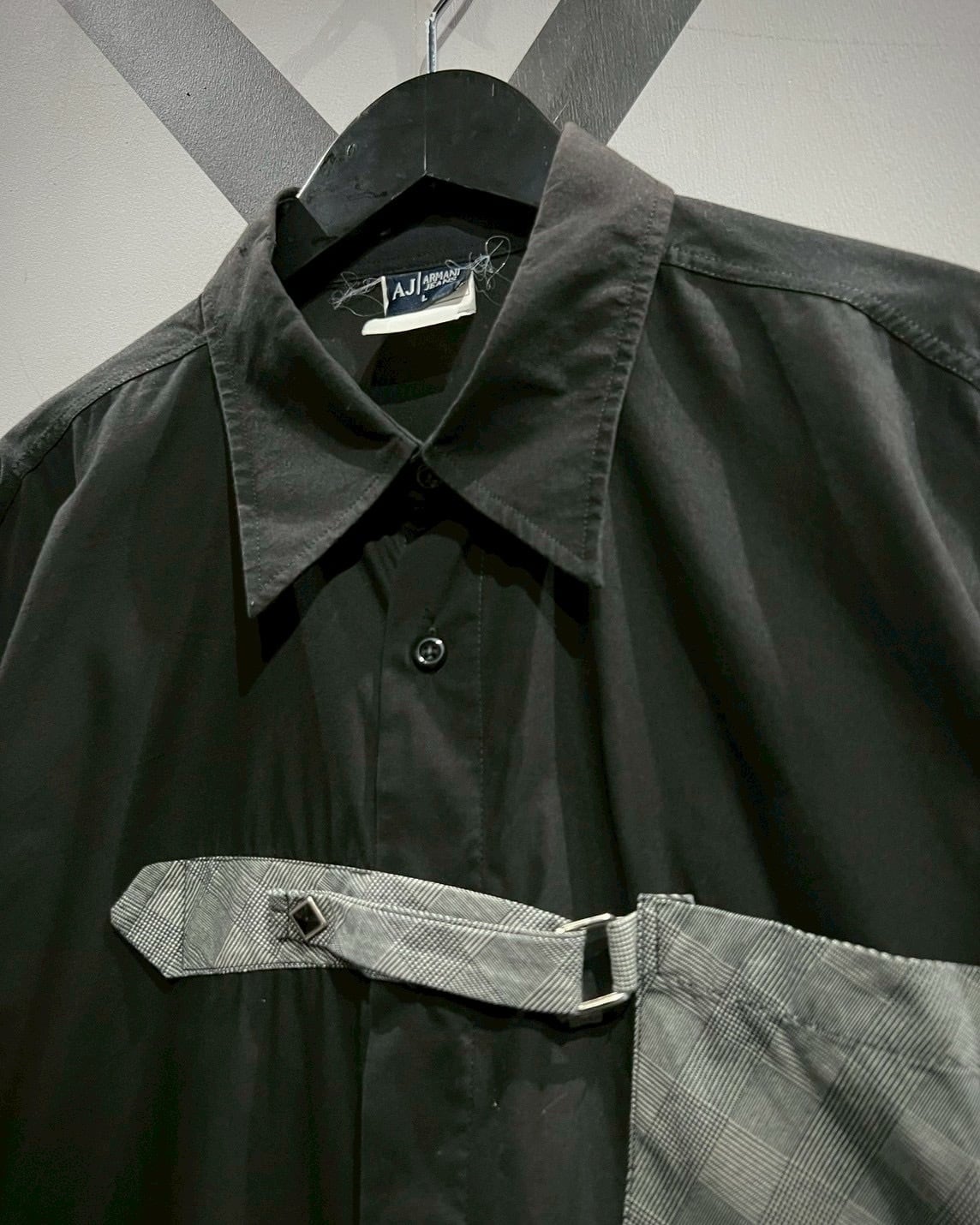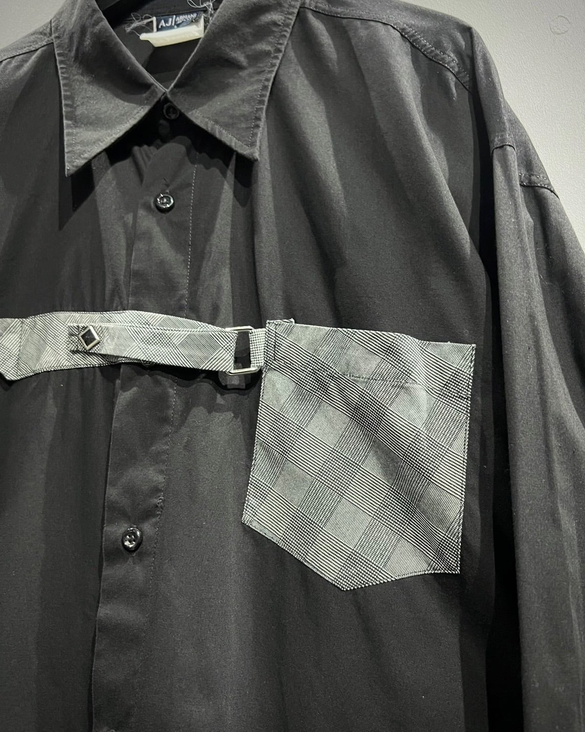 ブラックのシャツ生地をベースに、左胸にはグレンチェックのパッチポケット、さらにフロントにベルトギミックを走らせたアヴァンギャルドな1着。