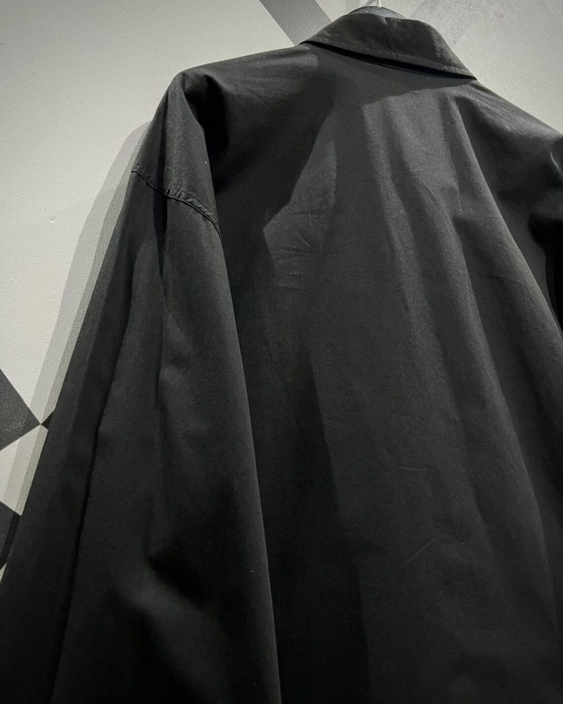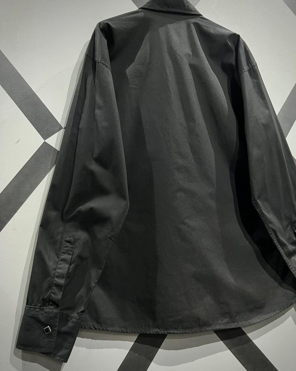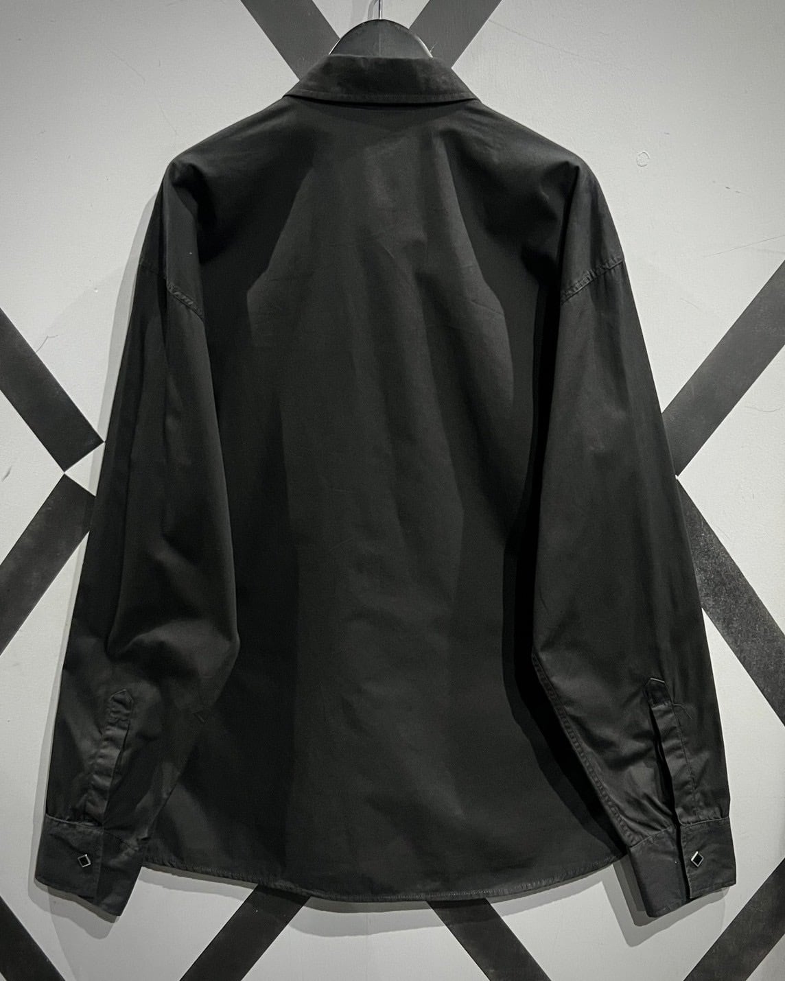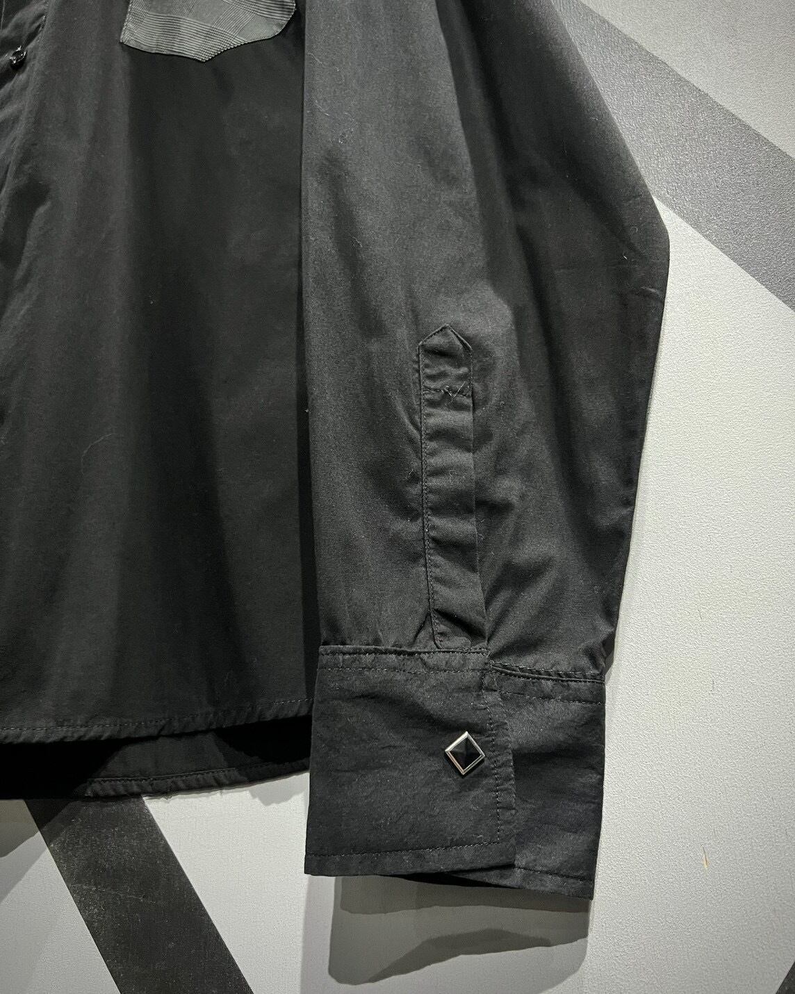 ブラックのシャツ生地をベースに、左胸にはグレンチェックのパッチポケット、さらにフロントにベルトギミックを走らせたアヴァンギャルドな1着。