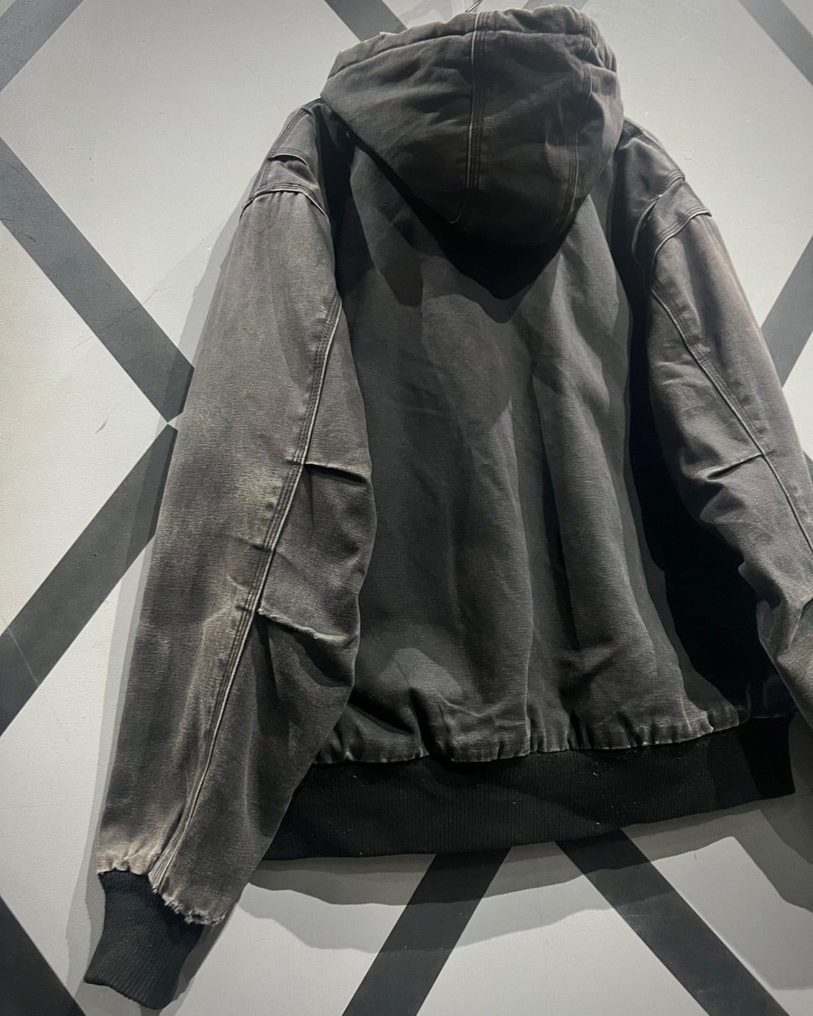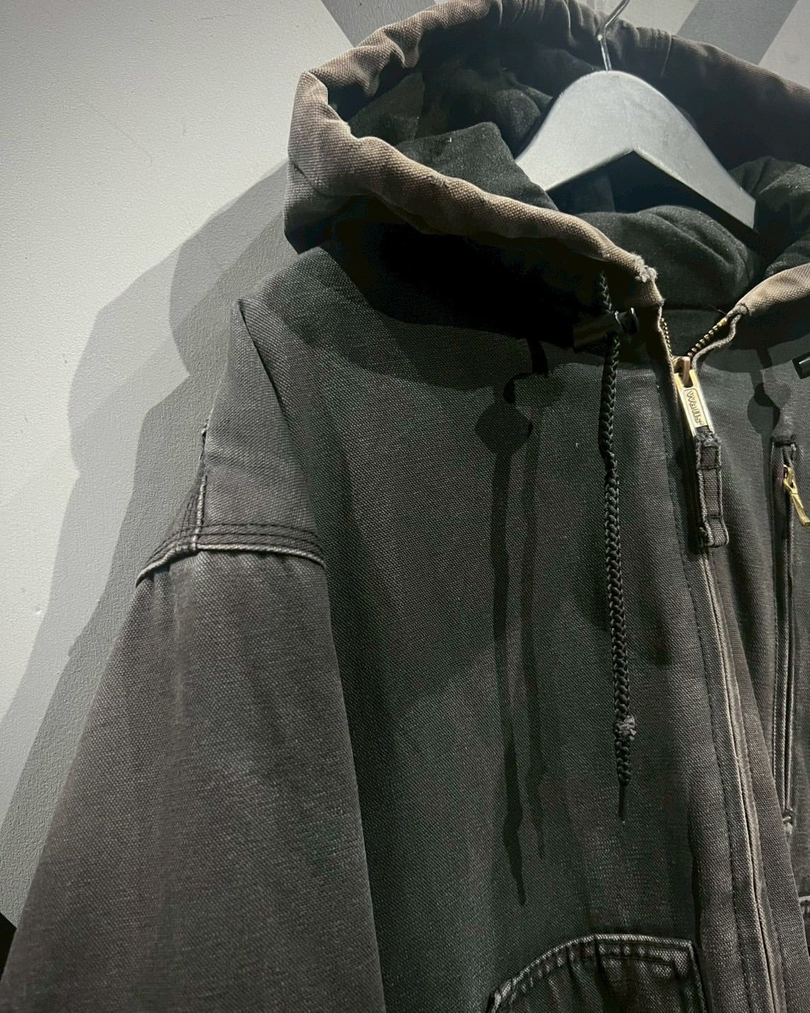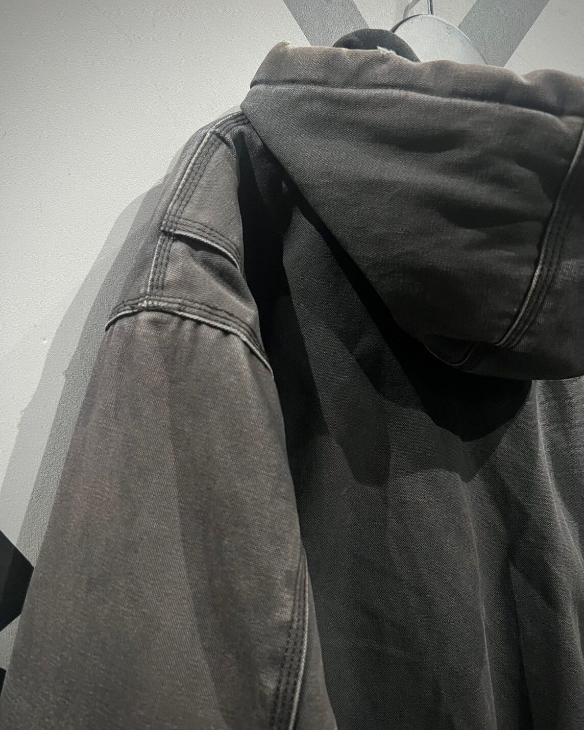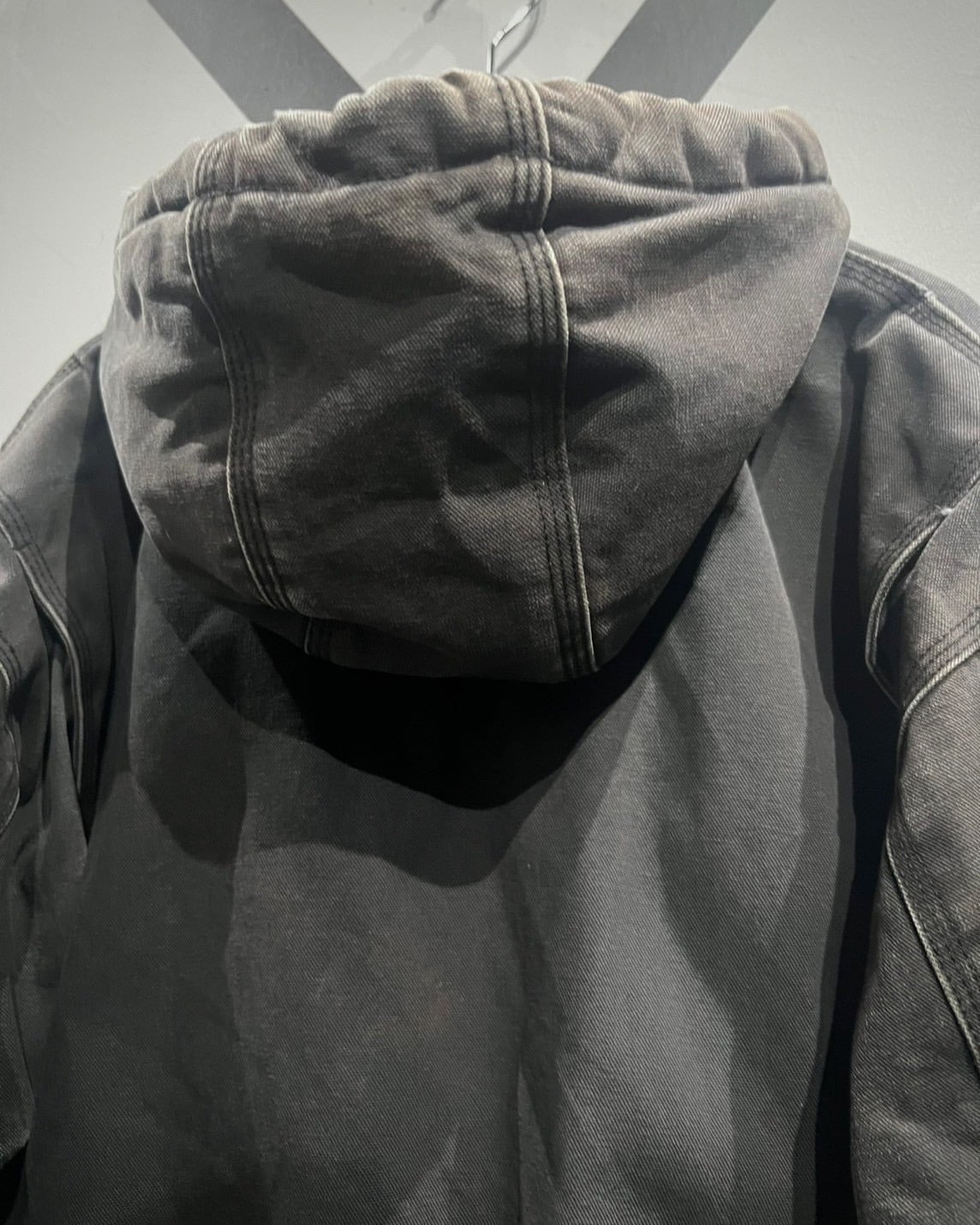 フードは肉厚に仕上げられ、ドローコードによってフィット感を調整可能。裏地は起毛感のあるファブリックを採用しており、保温性を確保しつつ快適な着心地を提供します。袖と裾のリブはワークジャケットらしいタフさを残しながらも程よく馴染み、シルエットをしっかりとキープ。ルーズなサイジングで仕入れたため、現代的なオーバーサイズスタイルとの相性も抜群です。