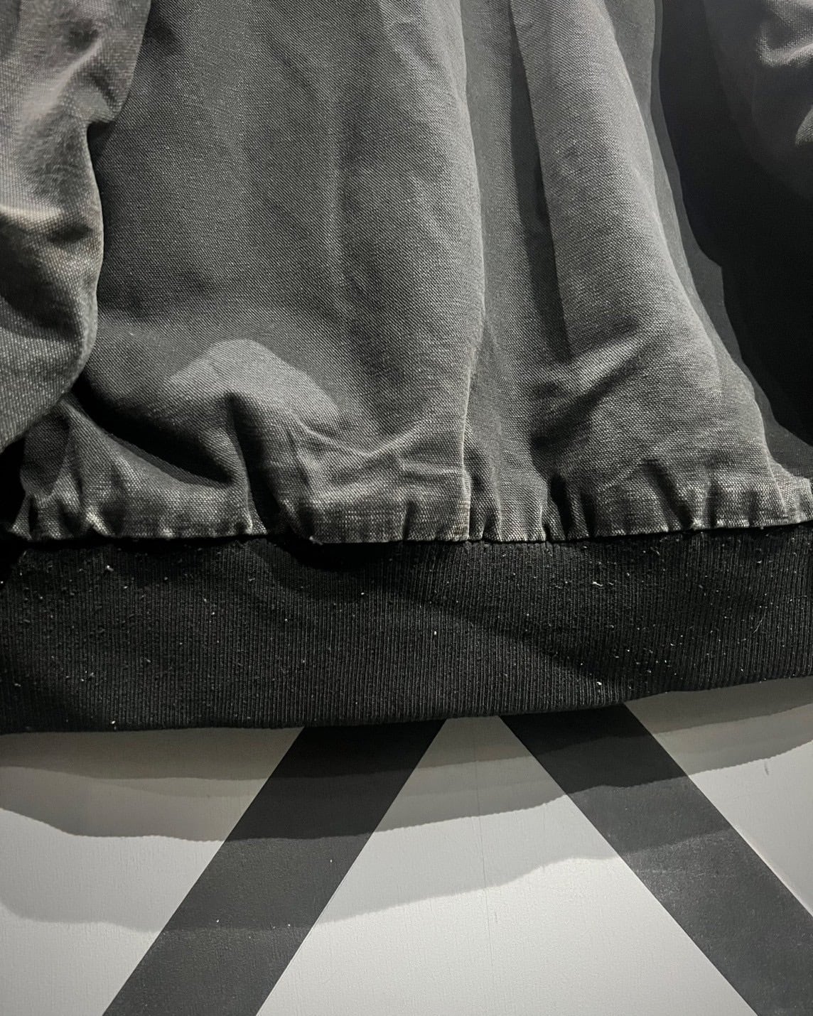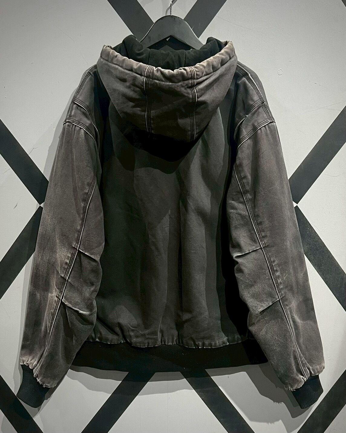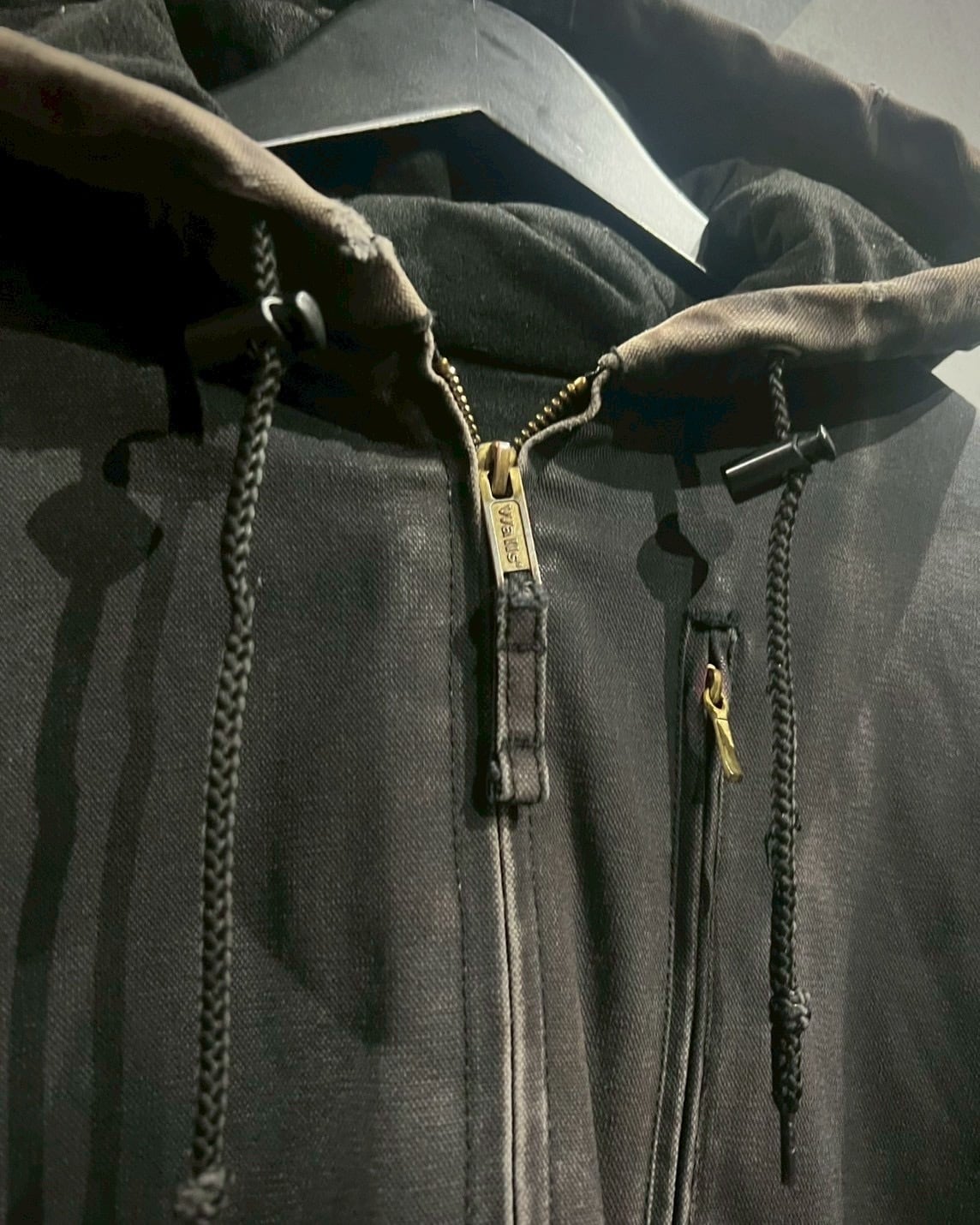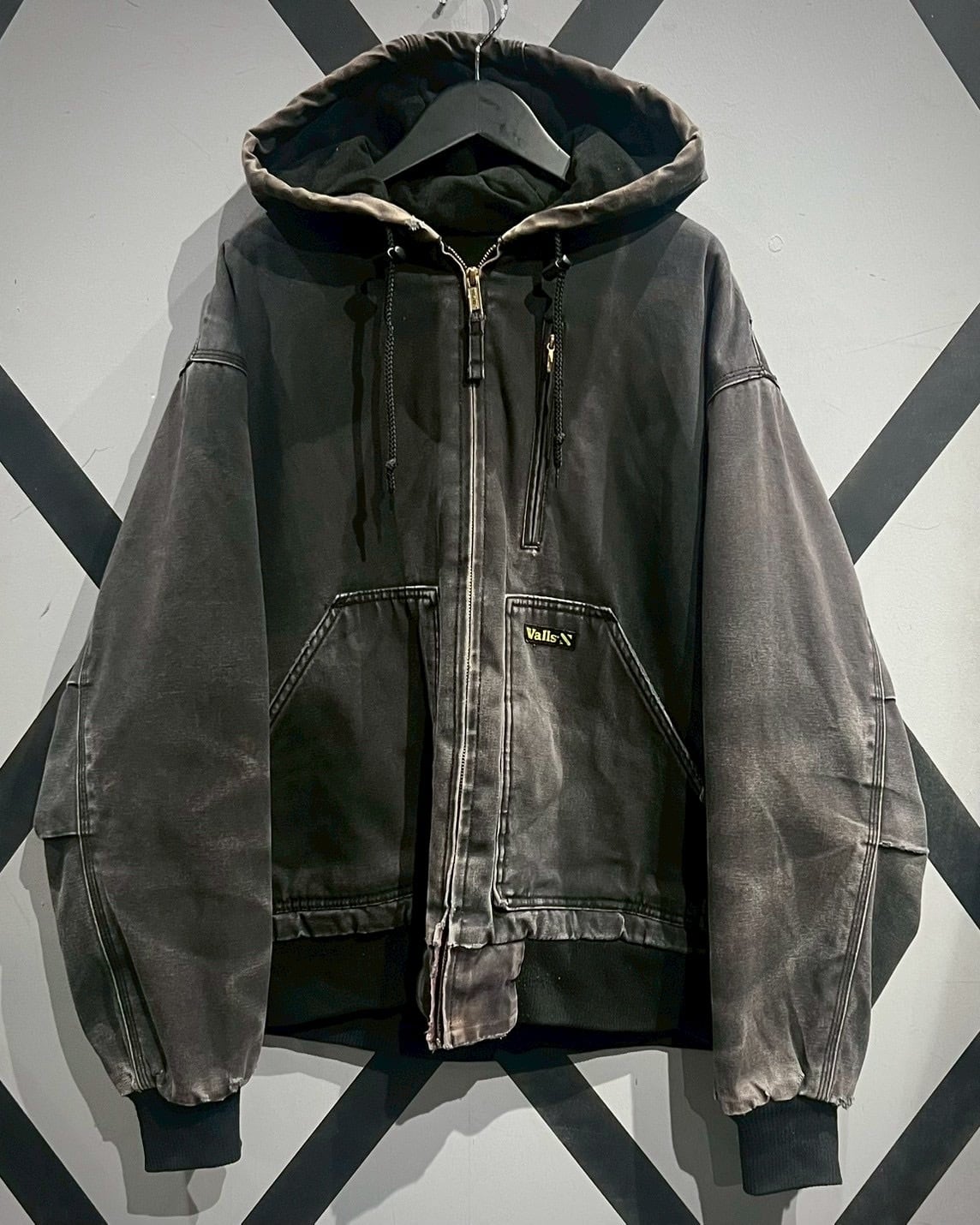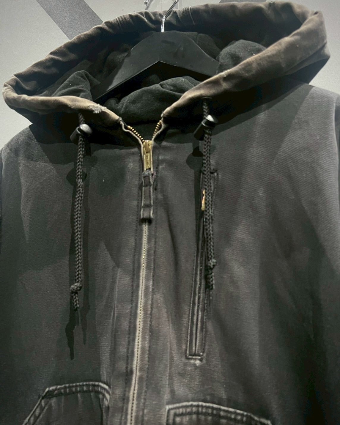 フードは肉厚に仕上げられ、ドローコードによってフィット感を調整可能。裏地は起毛感のあるファブリックを採用しており、保温性を確保しつつ快適な着心地を提供します。袖と裾のリブはワークジャケットらしいタフさを残しながらも程よく馴染み、シルエットをしっかりとキープ。ルーズなサイジングで仕入れたため、現代的なオーバーサイズスタイルとの相性も抜群です。