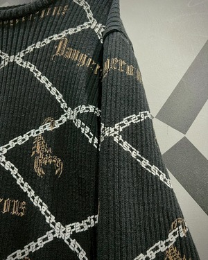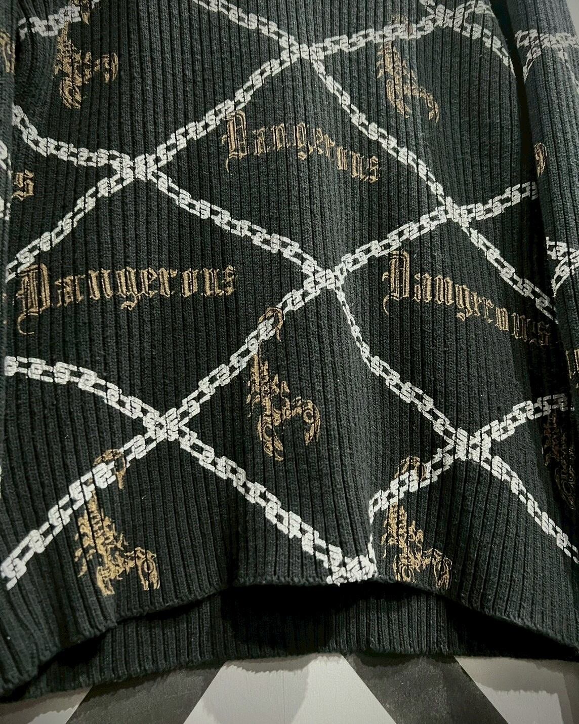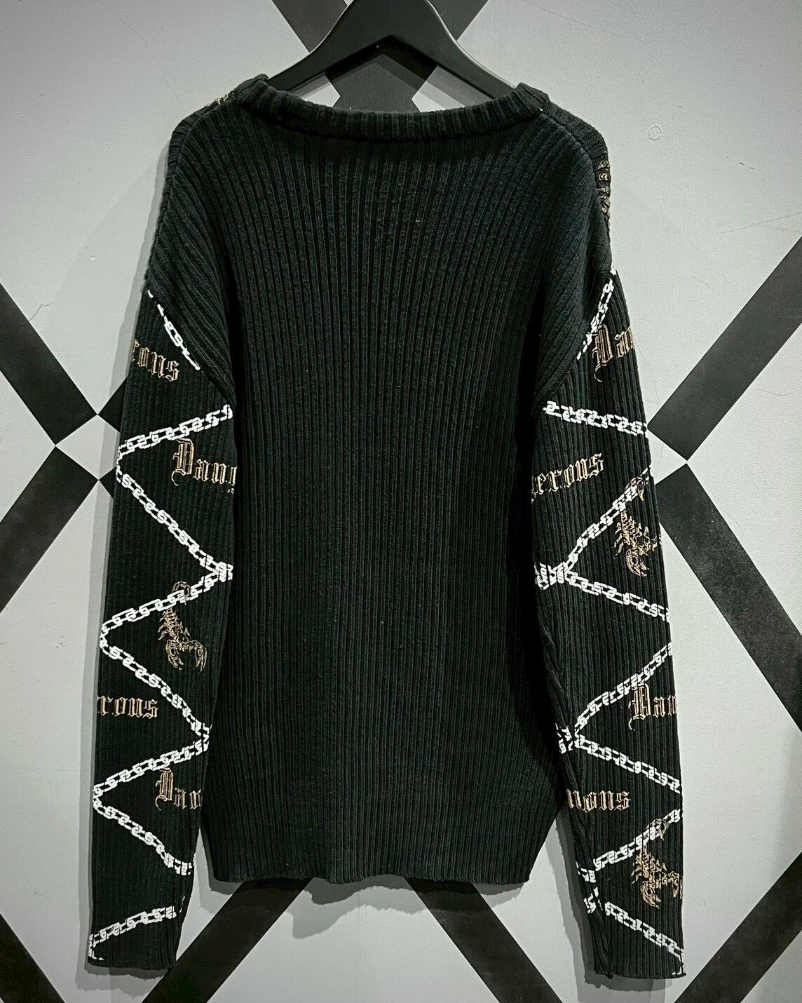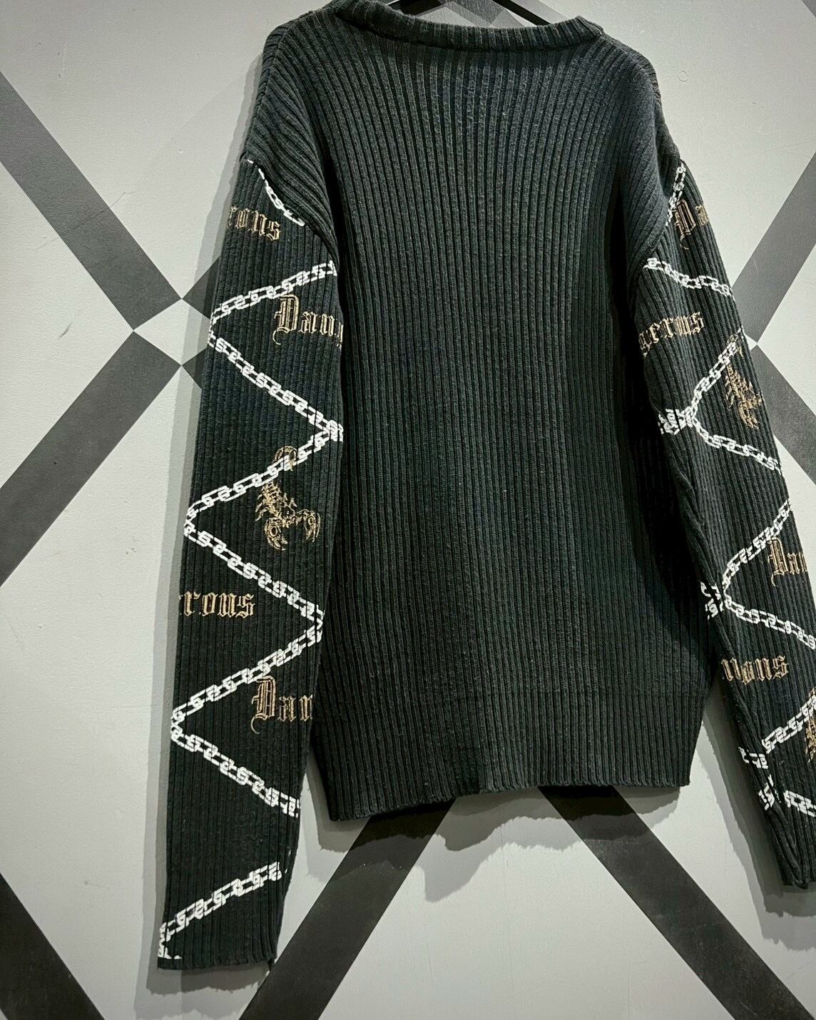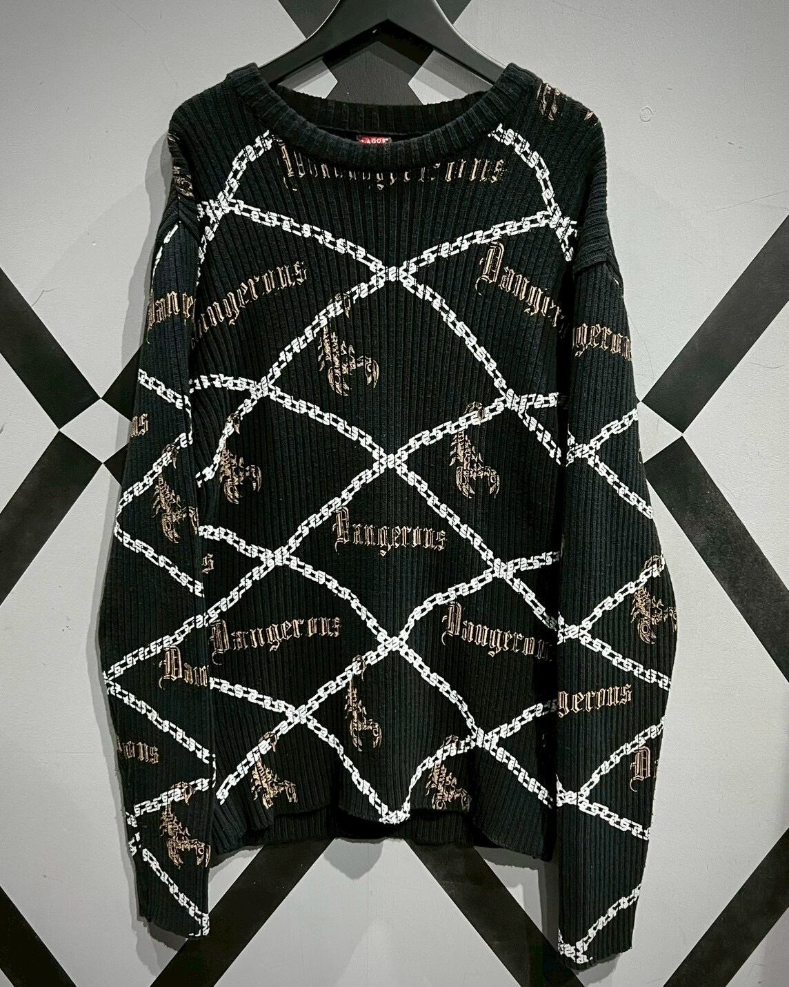 ゴシックフォントの「Dangerous」テキストとスコーピオンモチーフと、ホワイトのチェーンパターンが縦横無尽に走り抜ける、圧倒的な存在感を放つニット。