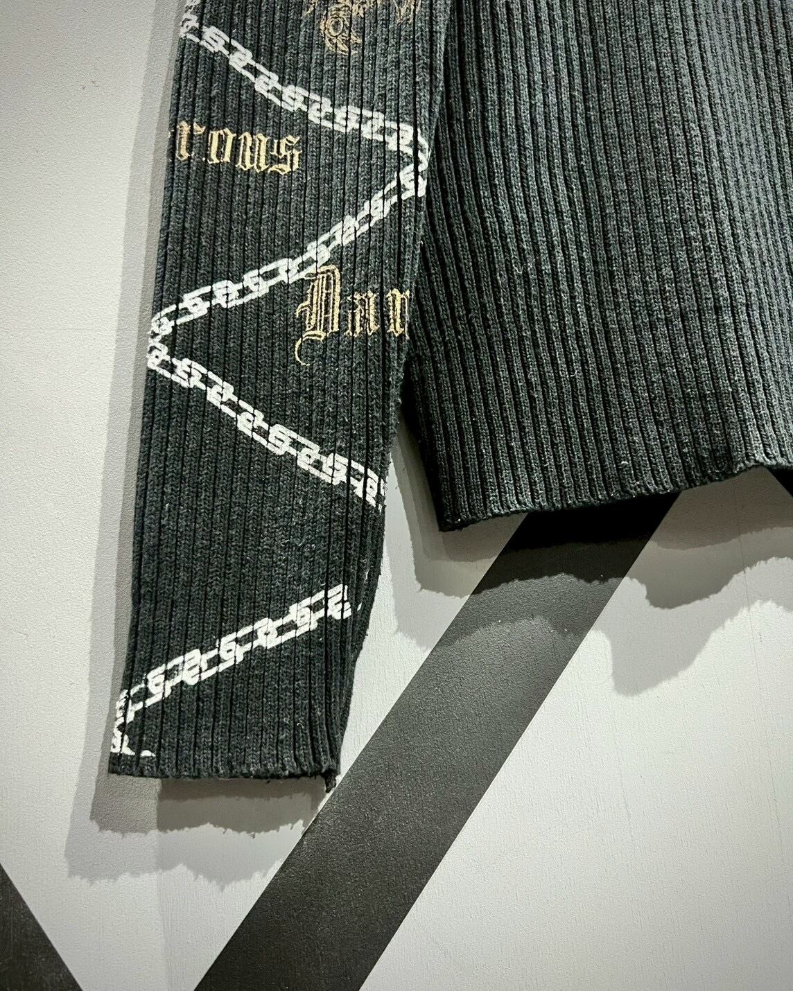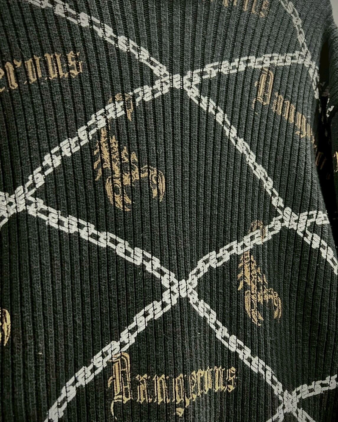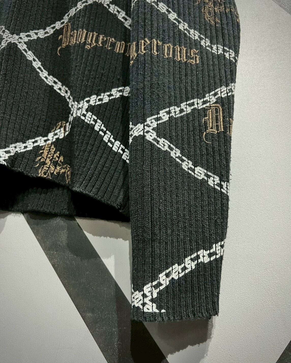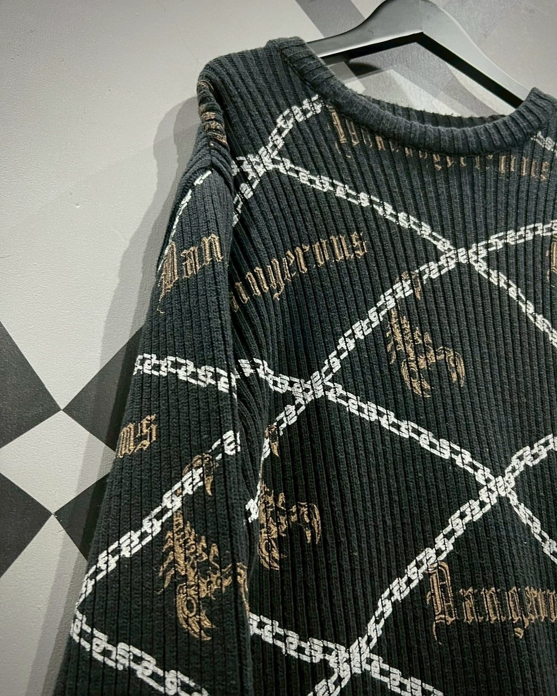 ゴシックフォントの「Dangerous」テキストとスコーピオンモチーフと、ホワイトのチェーンパターンが縦横無尽に走り抜ける、圧倒的な存在感を放つニット。