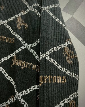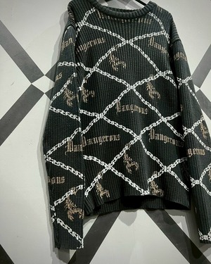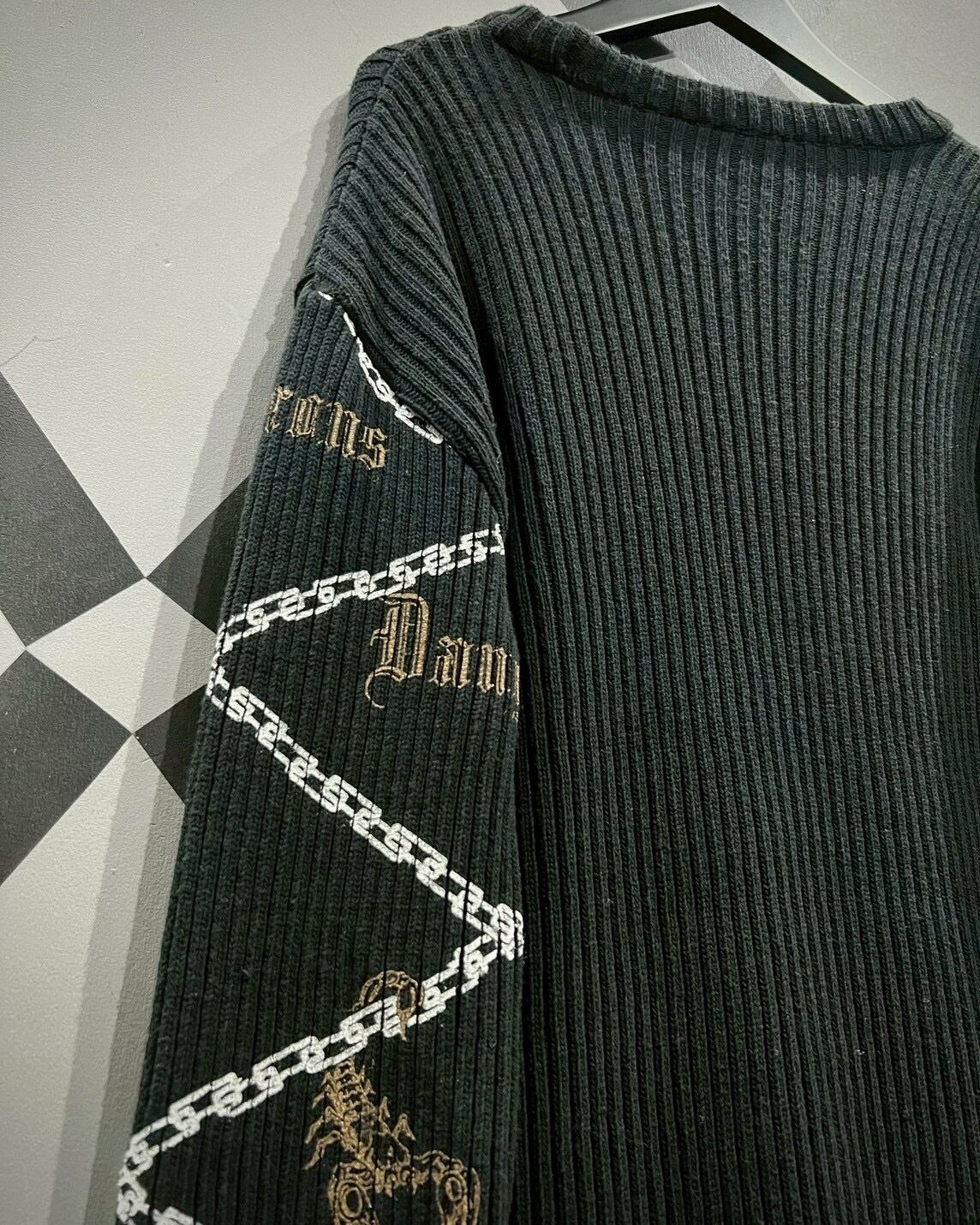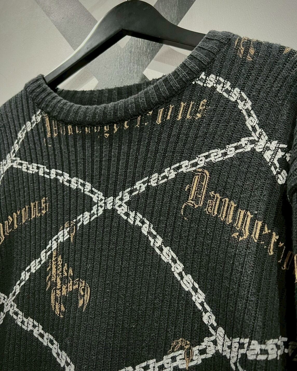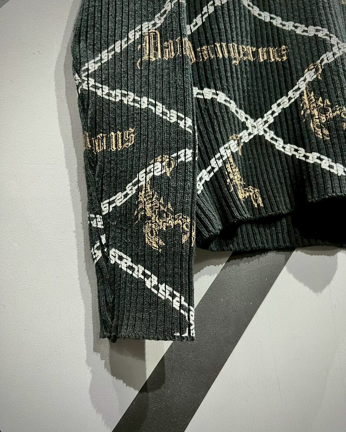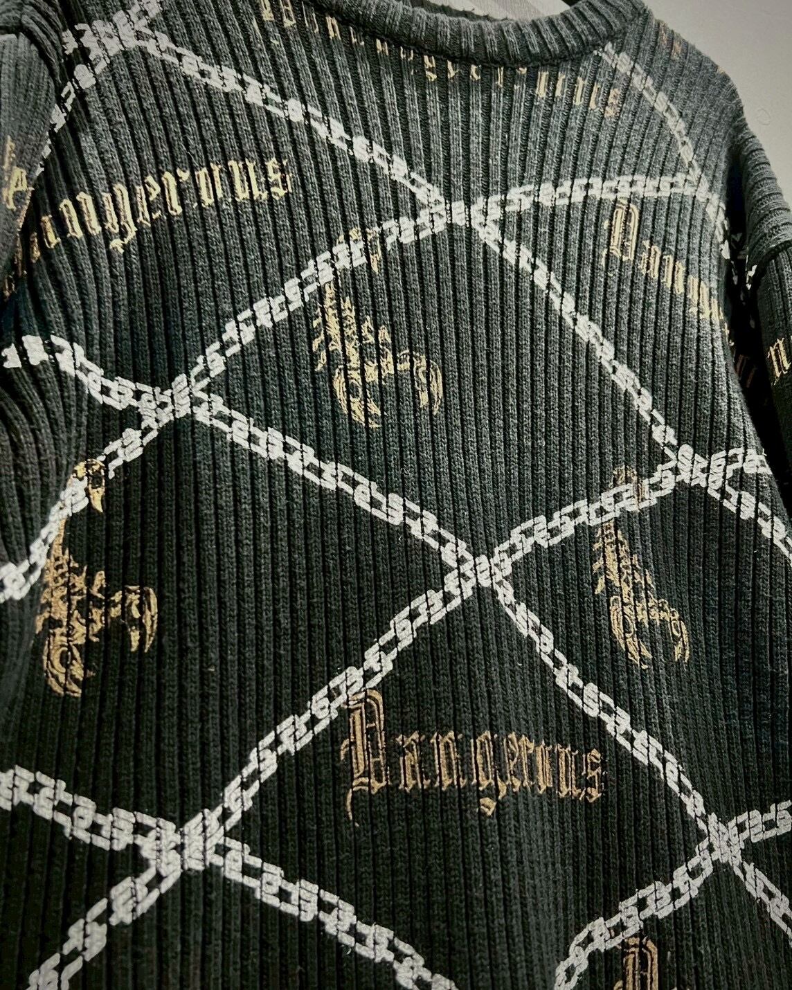 ゴシックフォントの「Dangerous」テキストとスコーピオンモチーフと、ホワイトのチェーンパターンが縦横無尽に走り抜ける、圧倒的な存在感を放つニット。