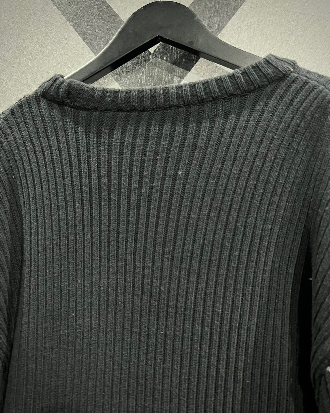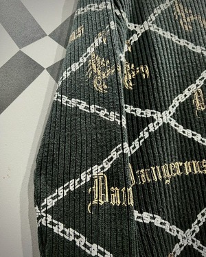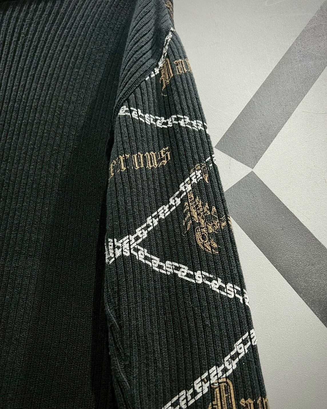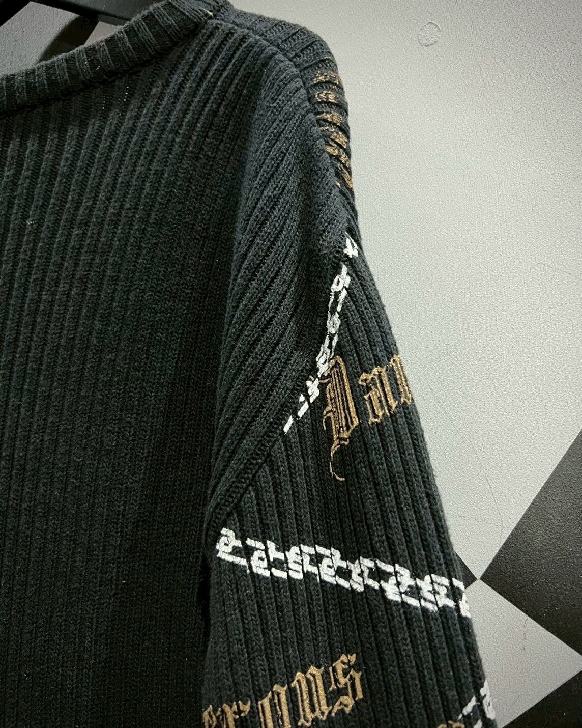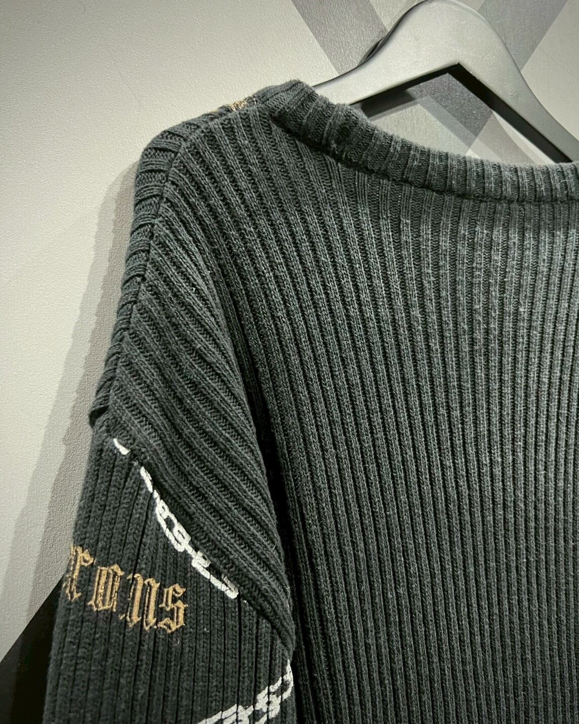 ゴシックフォントの「Dangerous」テキストとスコーピオンモチーフと、ホワイトのチェーンパターンが縦横無尽に走り抜ける、圧倒的な存在感を放つニット。