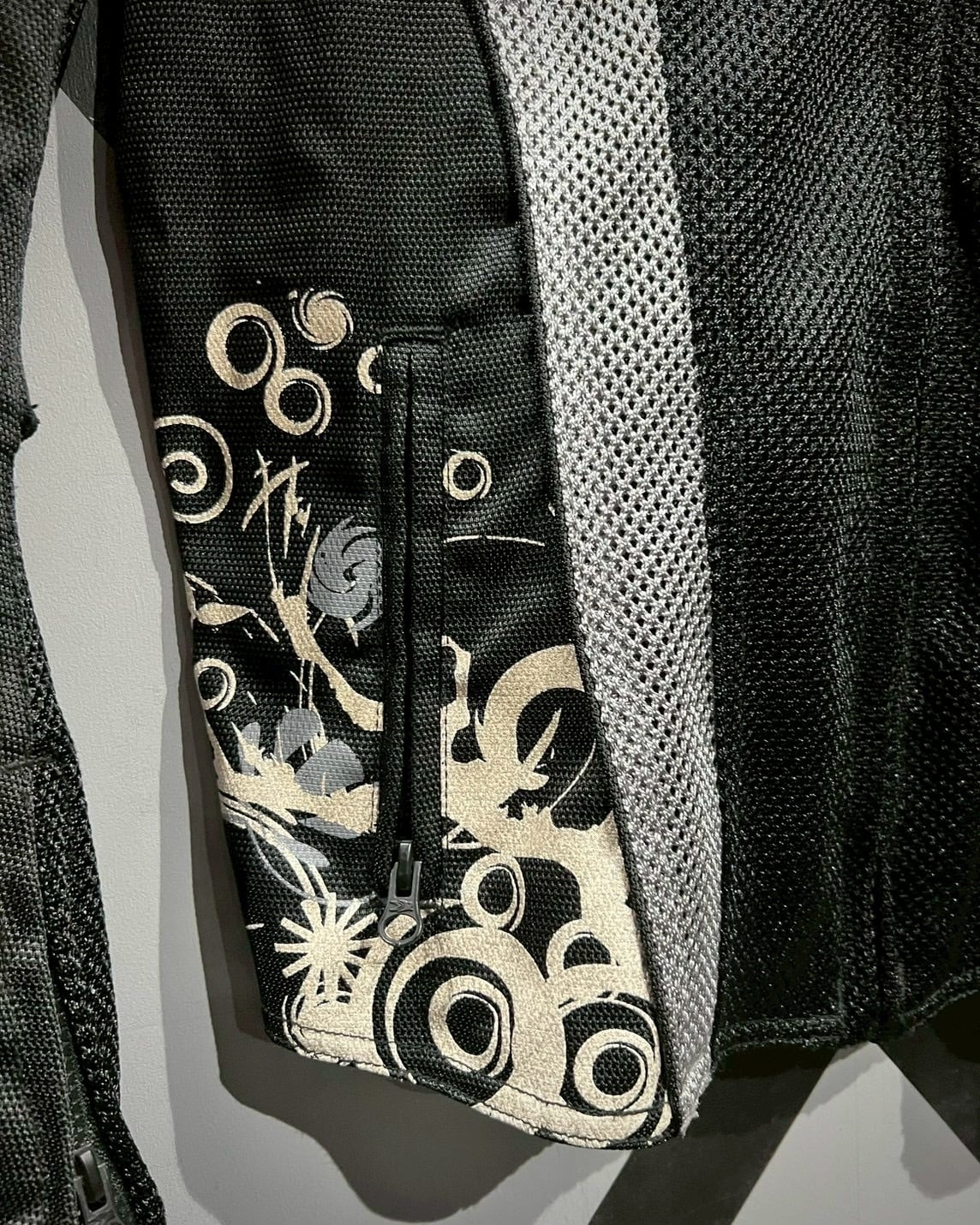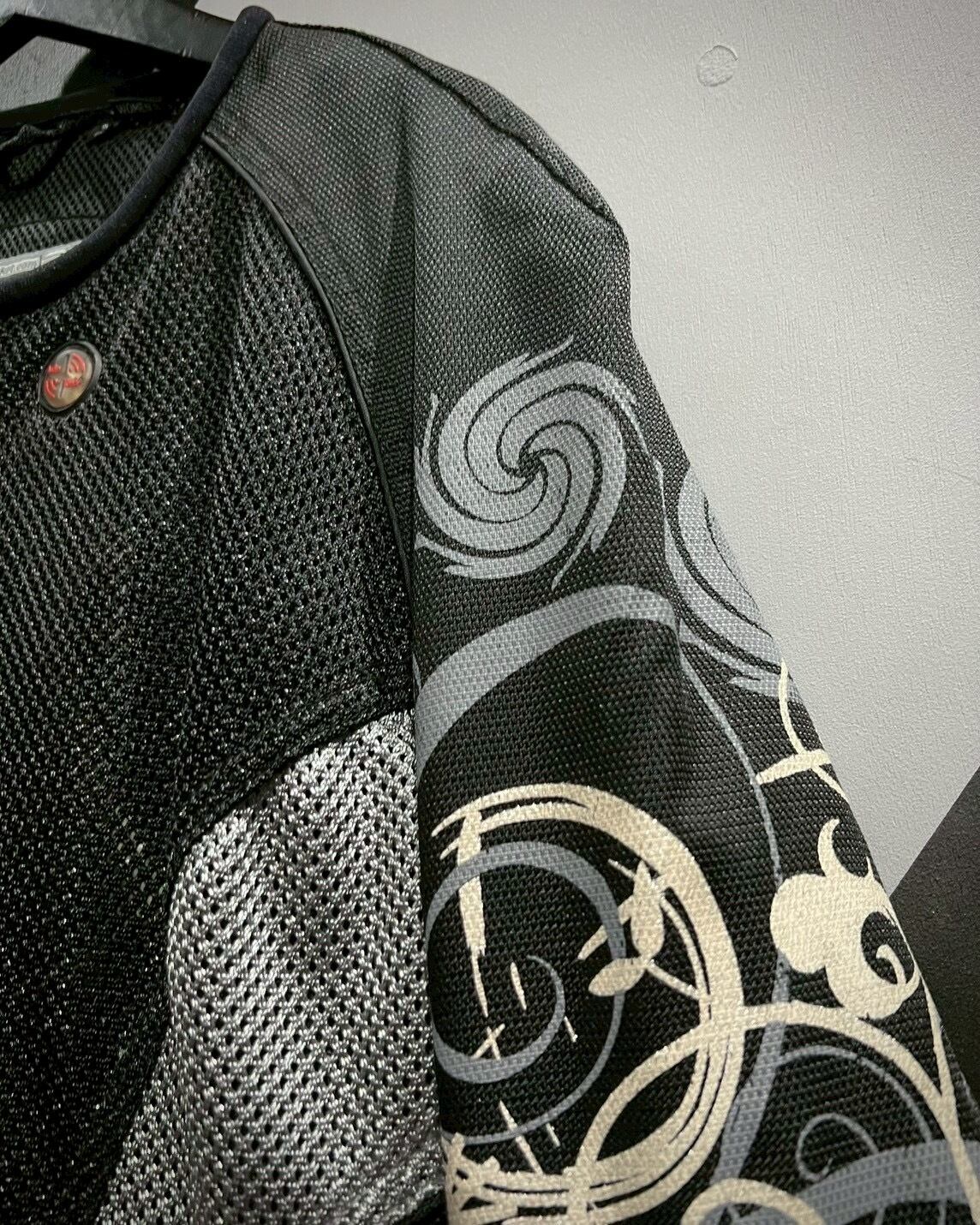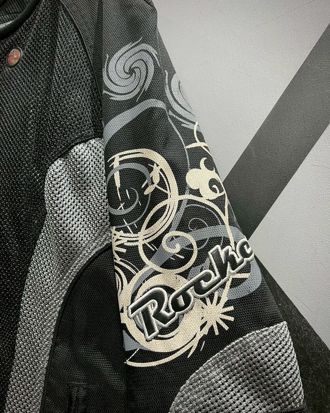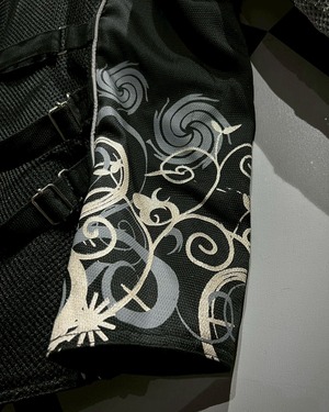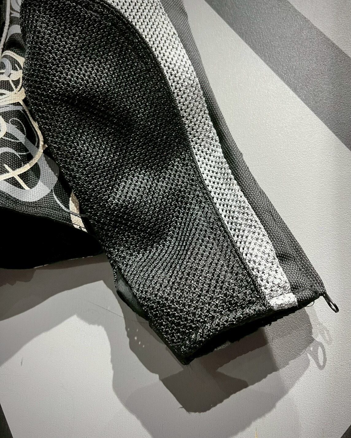 ハリのあるメッシュ素材をベースに採用し、袖から身頃にかけて流れるように配された抽象的なグラフィックと、ブランドロゴの刺繍を大胆にレイアウトした1着。