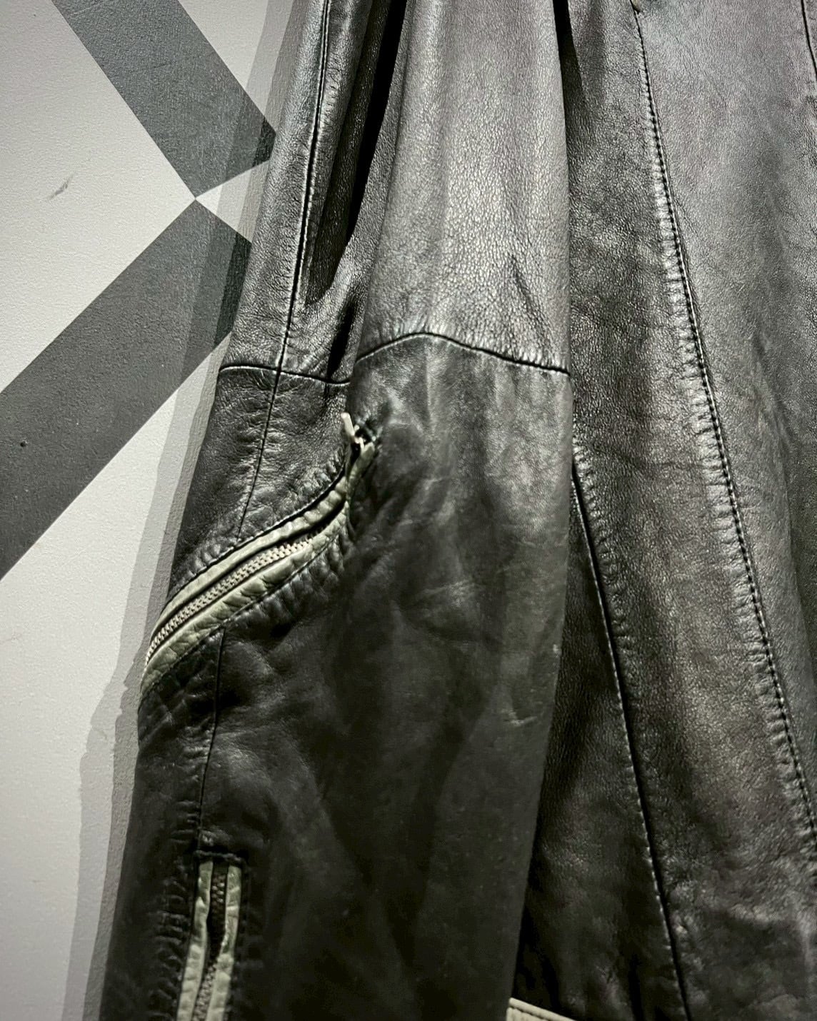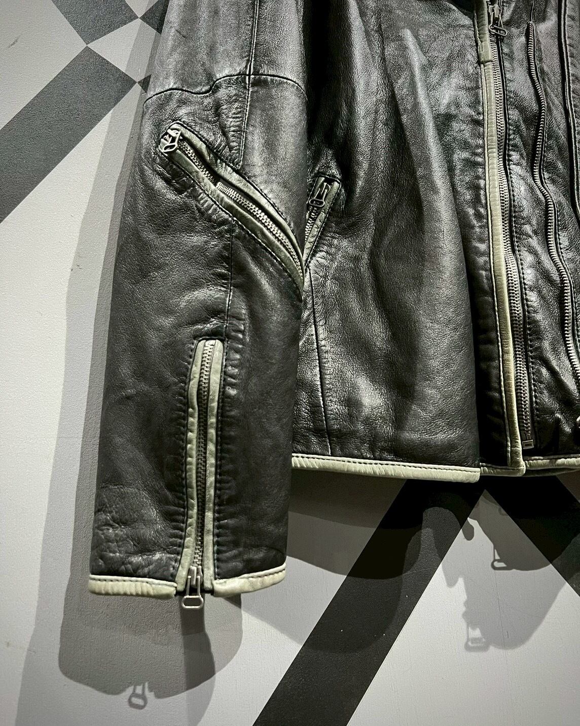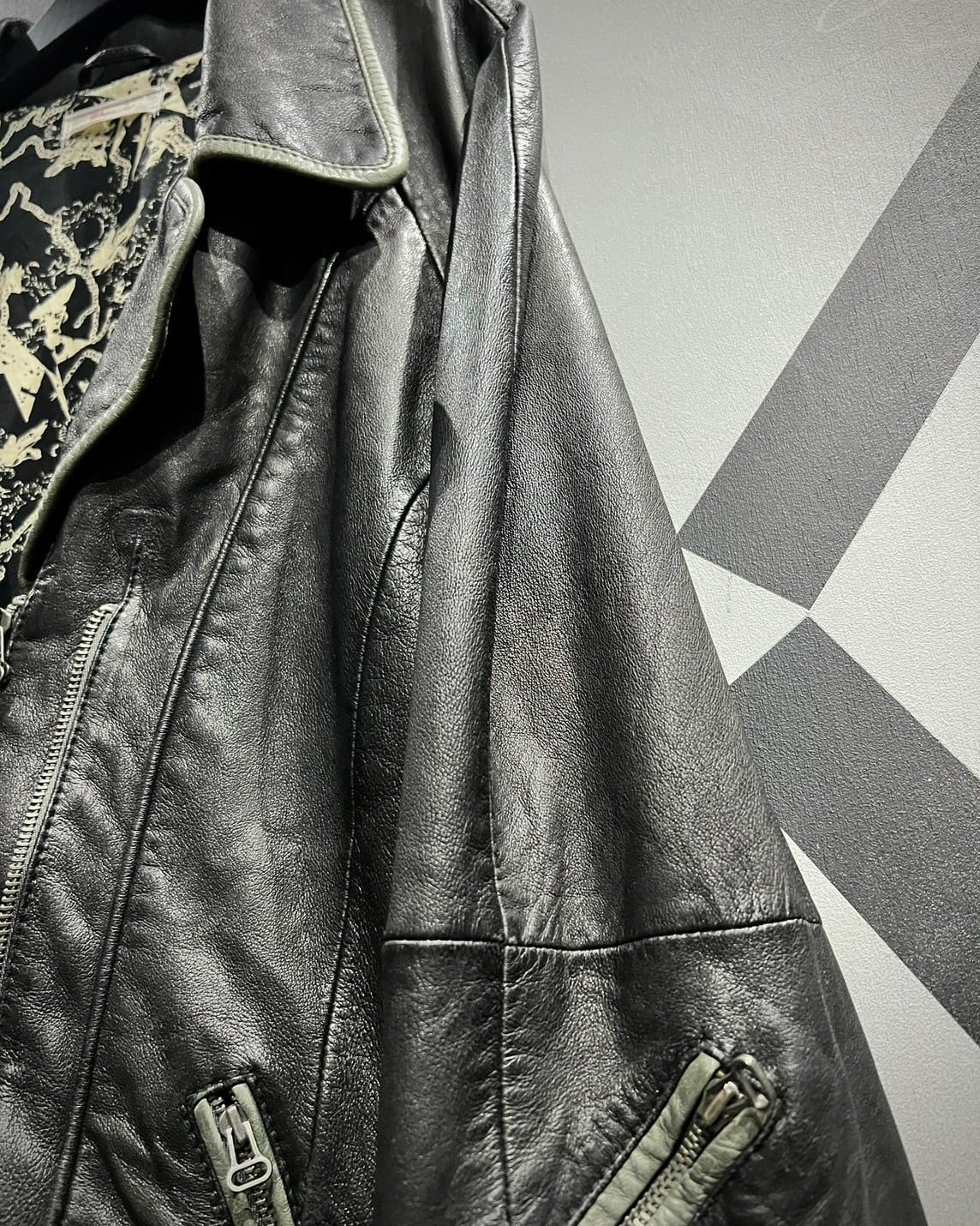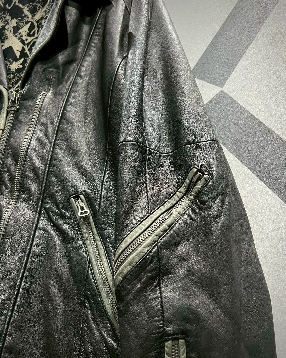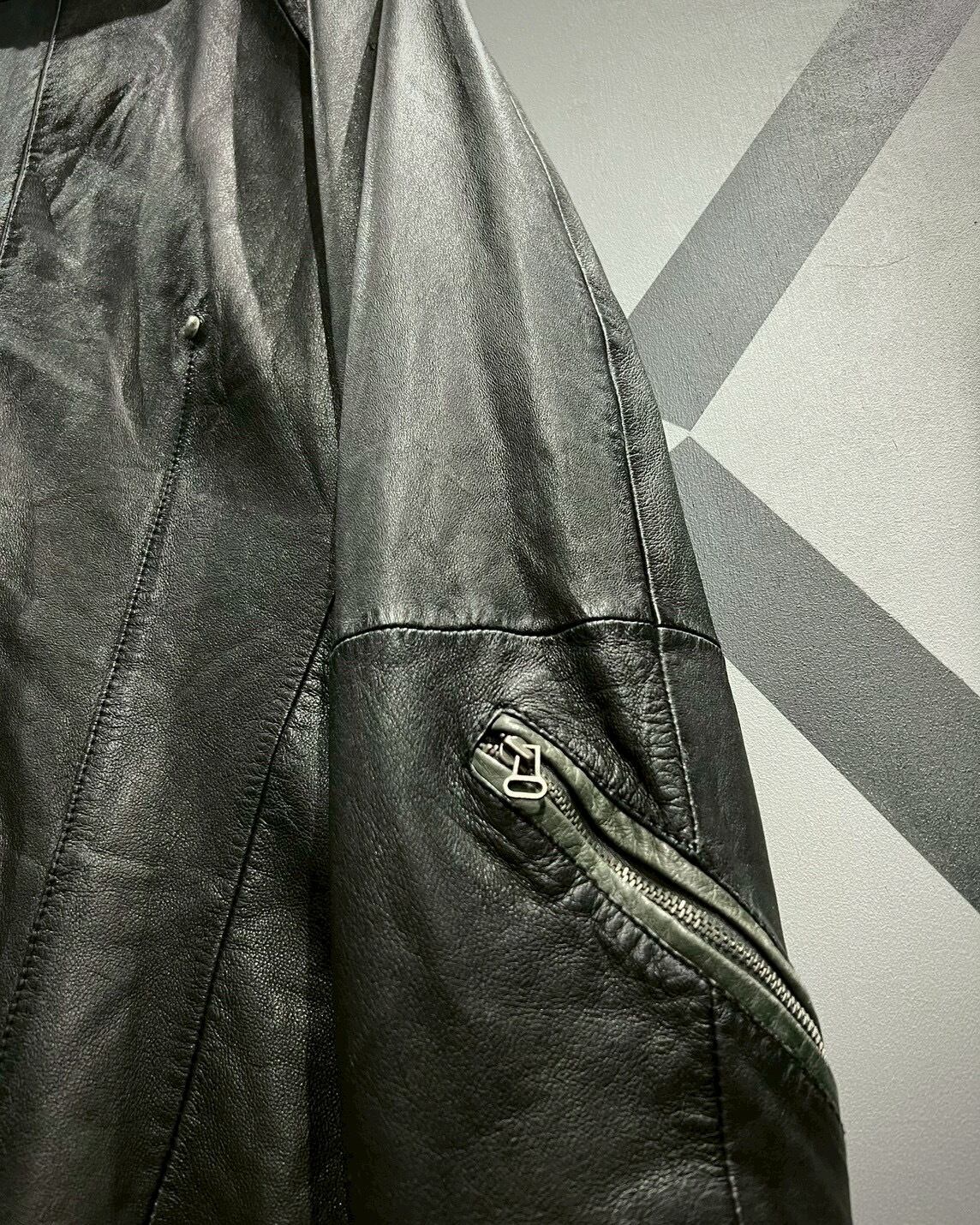 スリーブやフロントには複数のジップポケットを備え、機能性と装飾性を兼備。縁取りに施されたグレイッシュなパイピングがボディの質感を際立たせ、無骨さの中に洗練されたコントラストを生み出しています。