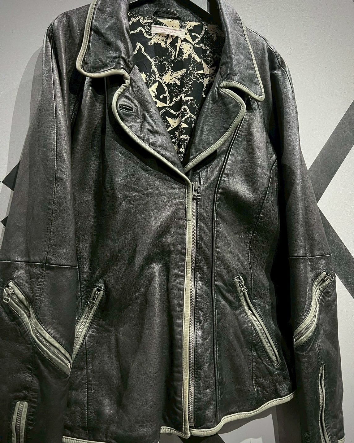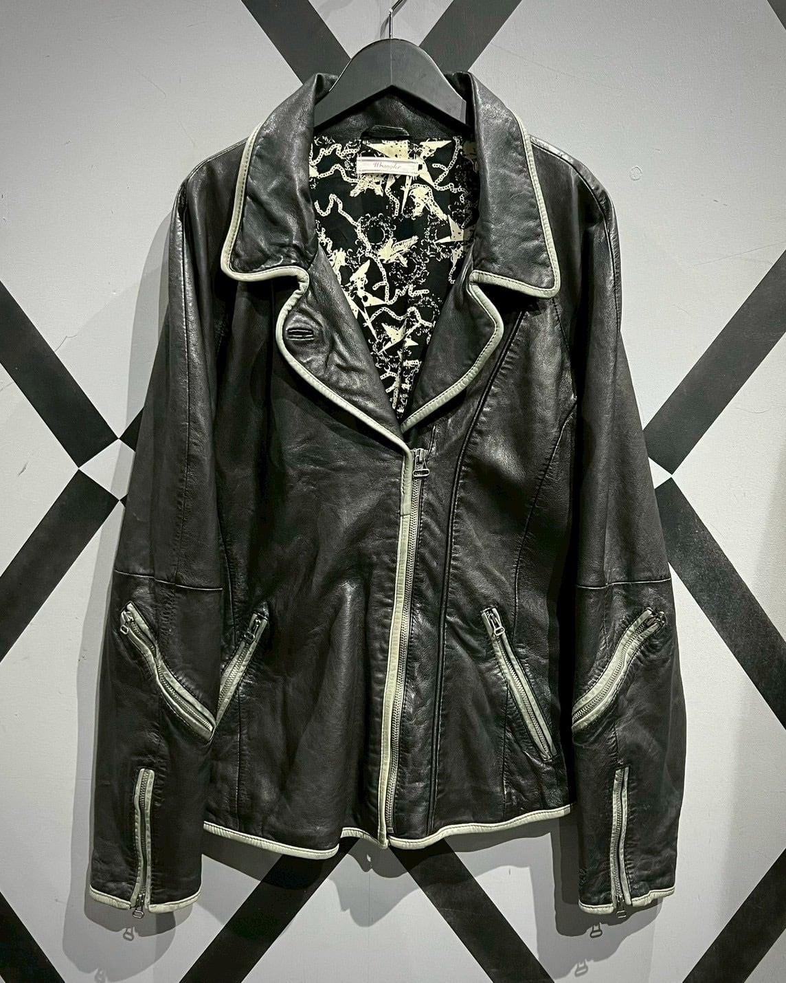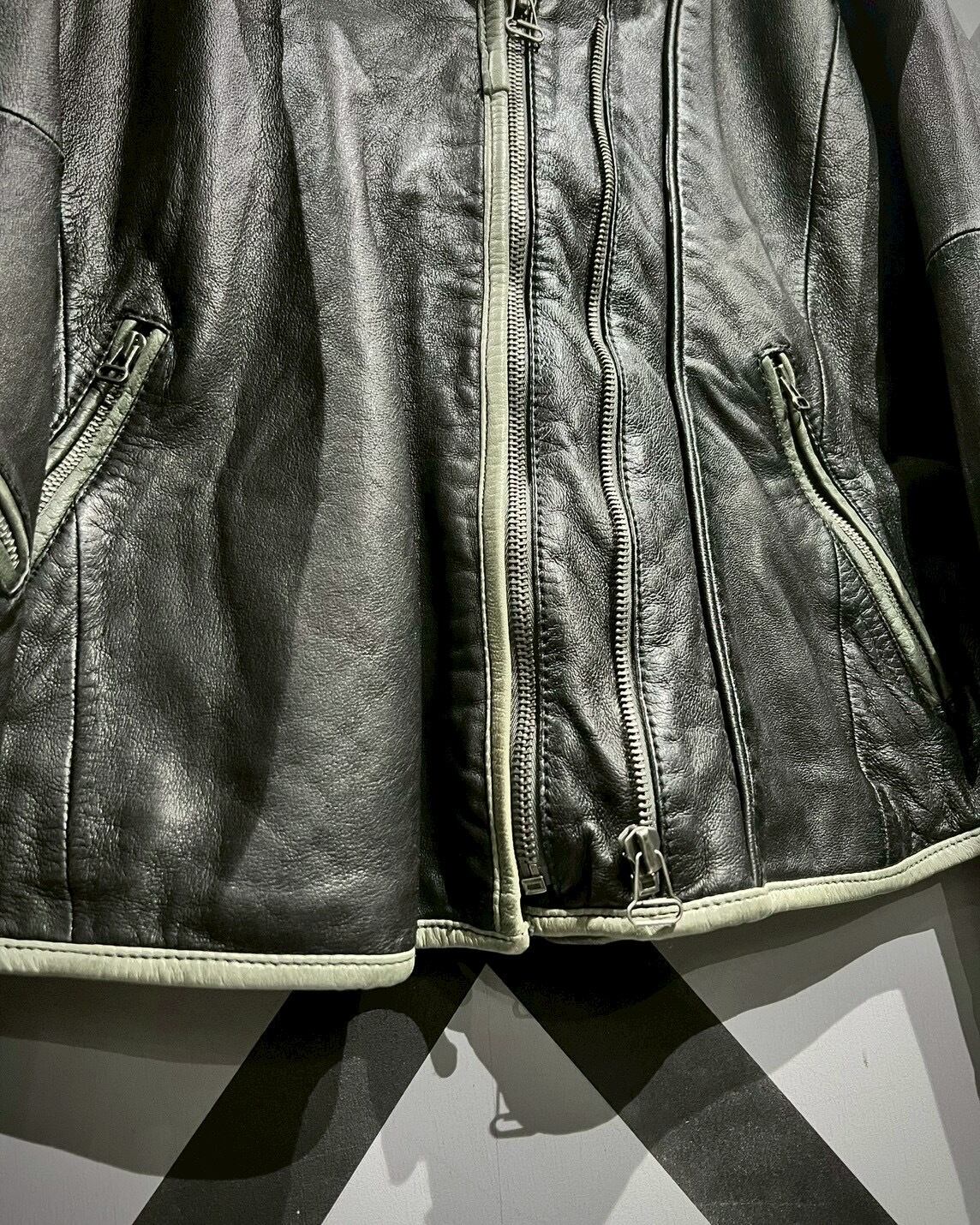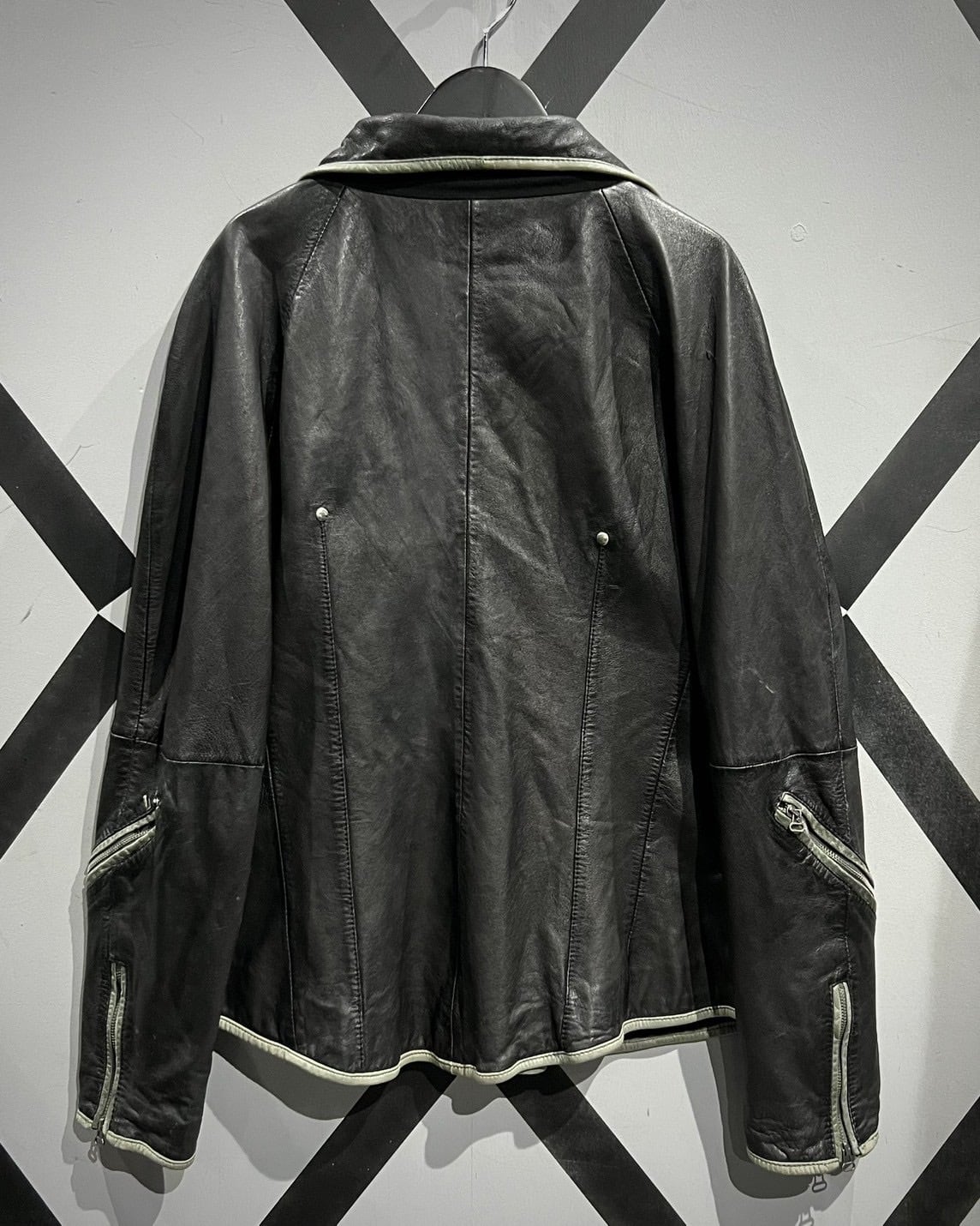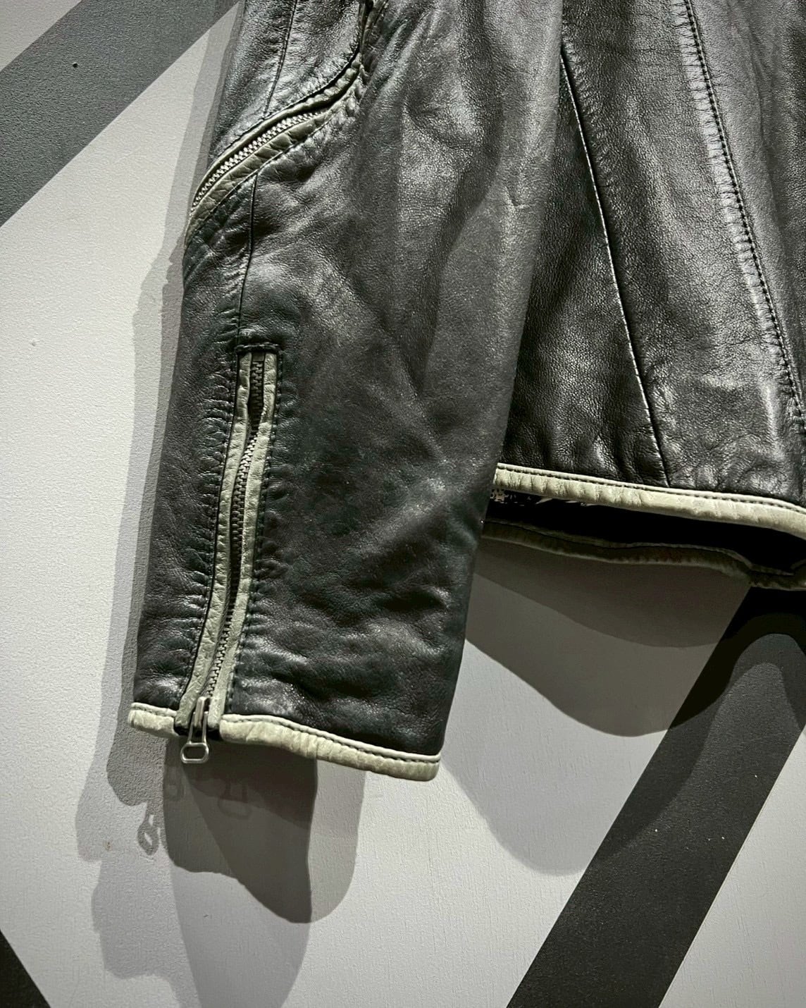 スリーブやフロントには複数のジップポケットを備え、機能性と装飾性を兼備。縁取りに施されたグレイッシュなパイピングがボディの質感を際立たせ、無骨さの中に洗練されたコントラストを生み出しています。