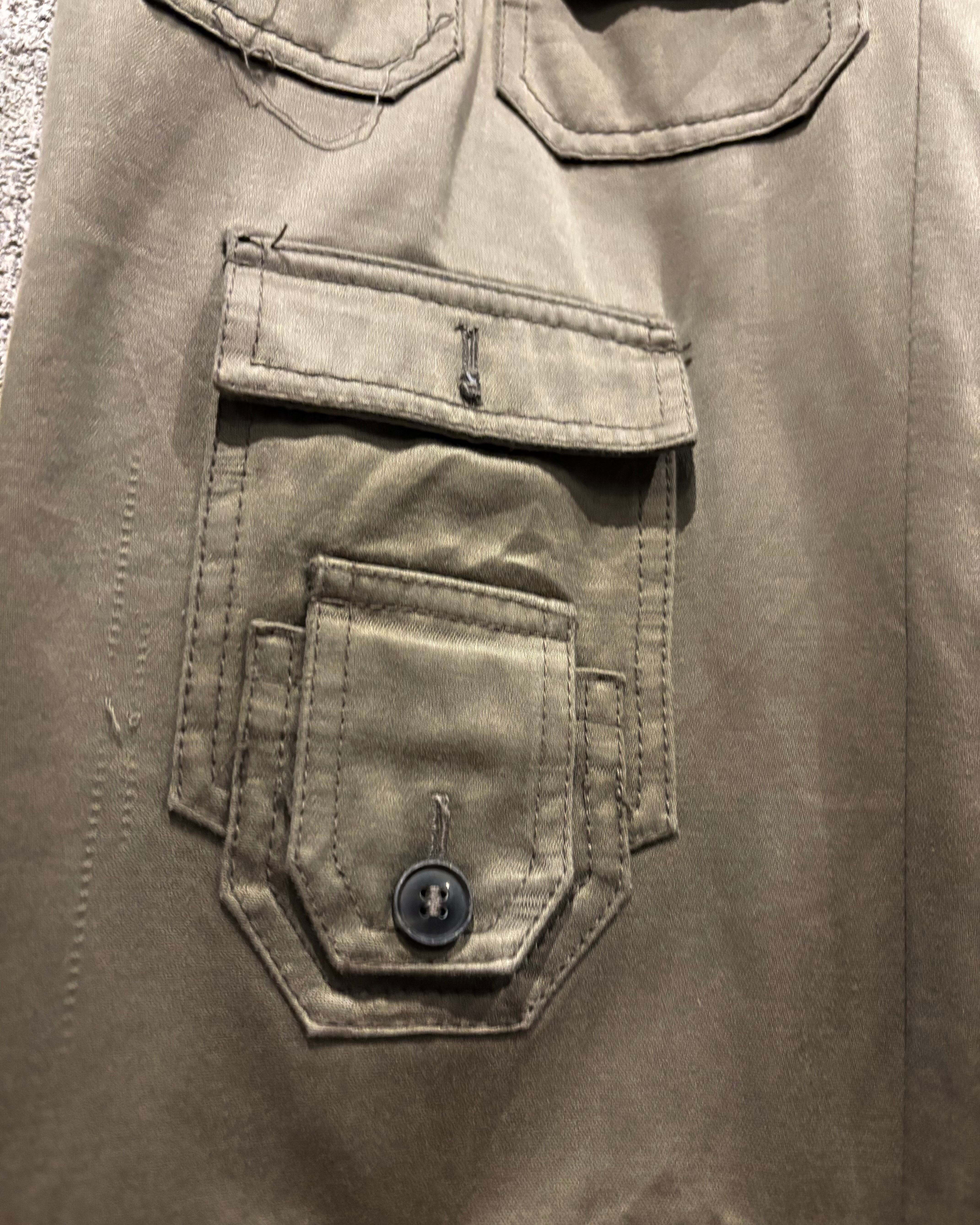 一目で視線を奪うのは、前後のレッグ全体にびっしりと配置された多数のフラップポケット。まるでアート作品のように構築的で、無骨なミリタリーパンツの要素をハイエンドなデザインへと昇華させています。均整の取れた配置とポケットのサイズのバリエーションが圧巻で、機能性と装飾性が高次元で融合。