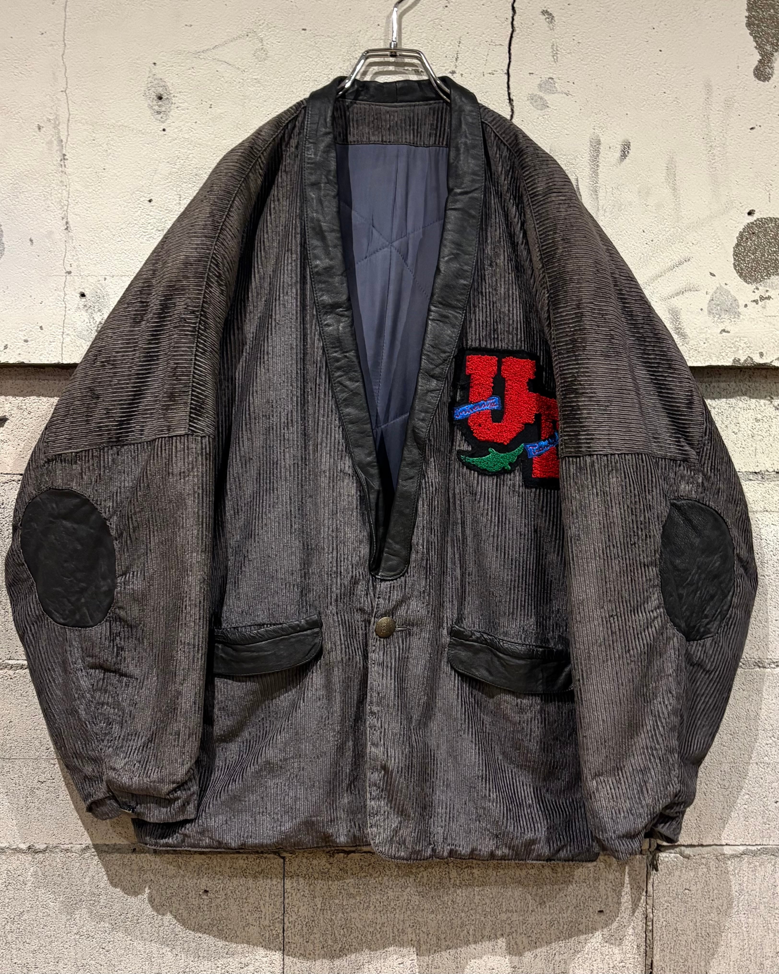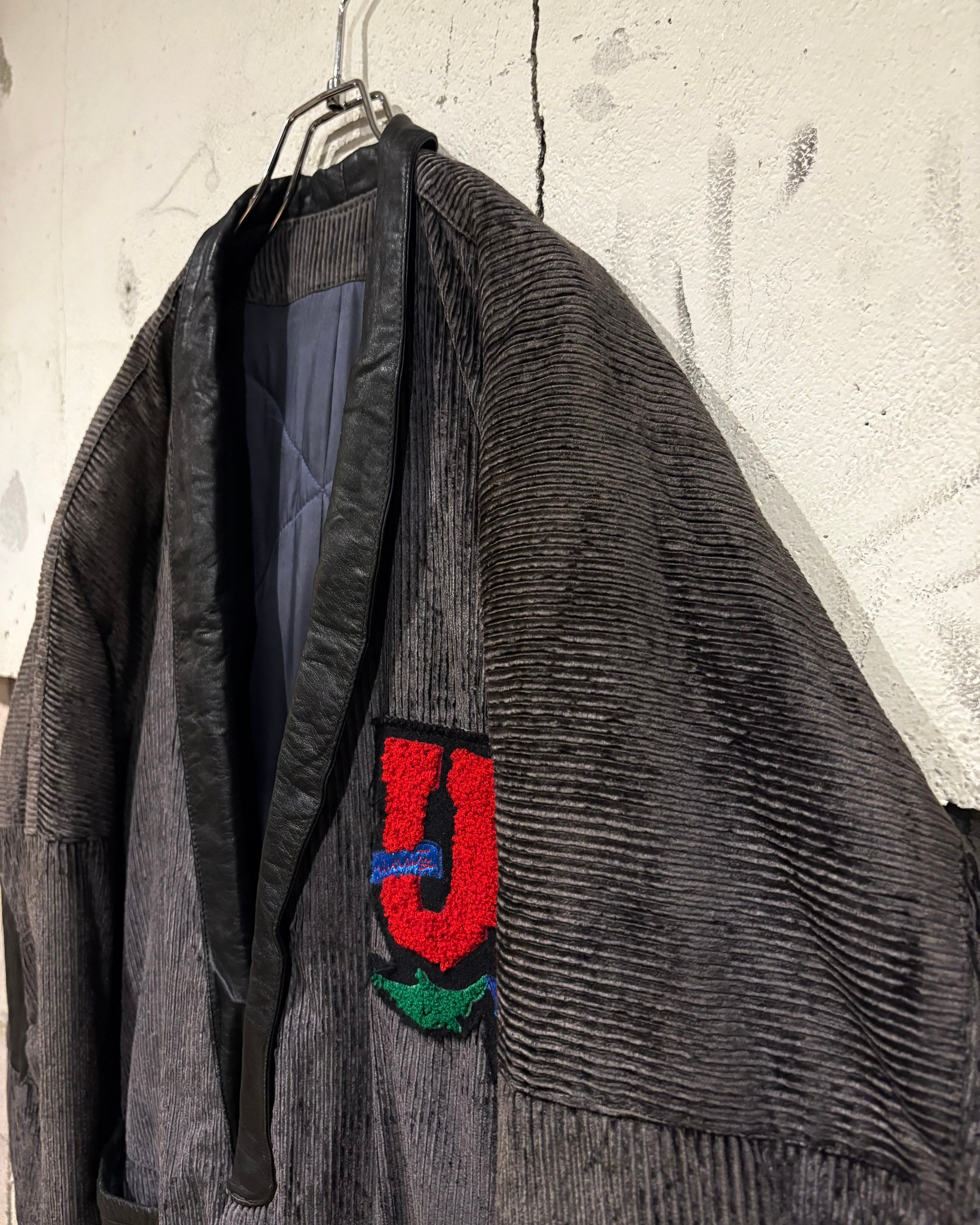 襟やポケットにはブラックのレザーの切り替えを配置。コーデュロイの柔らかな質感に対して重厚的なアクセントを加え、全体の印象をグッと引き締めています。胸元には存在感のある立体ワッペンが鎮座し、鮮やかなレッドとブルー、グリーンのコントラストが映えるデザイン。どこかカレッジやスポーツの空気を漂わせています。