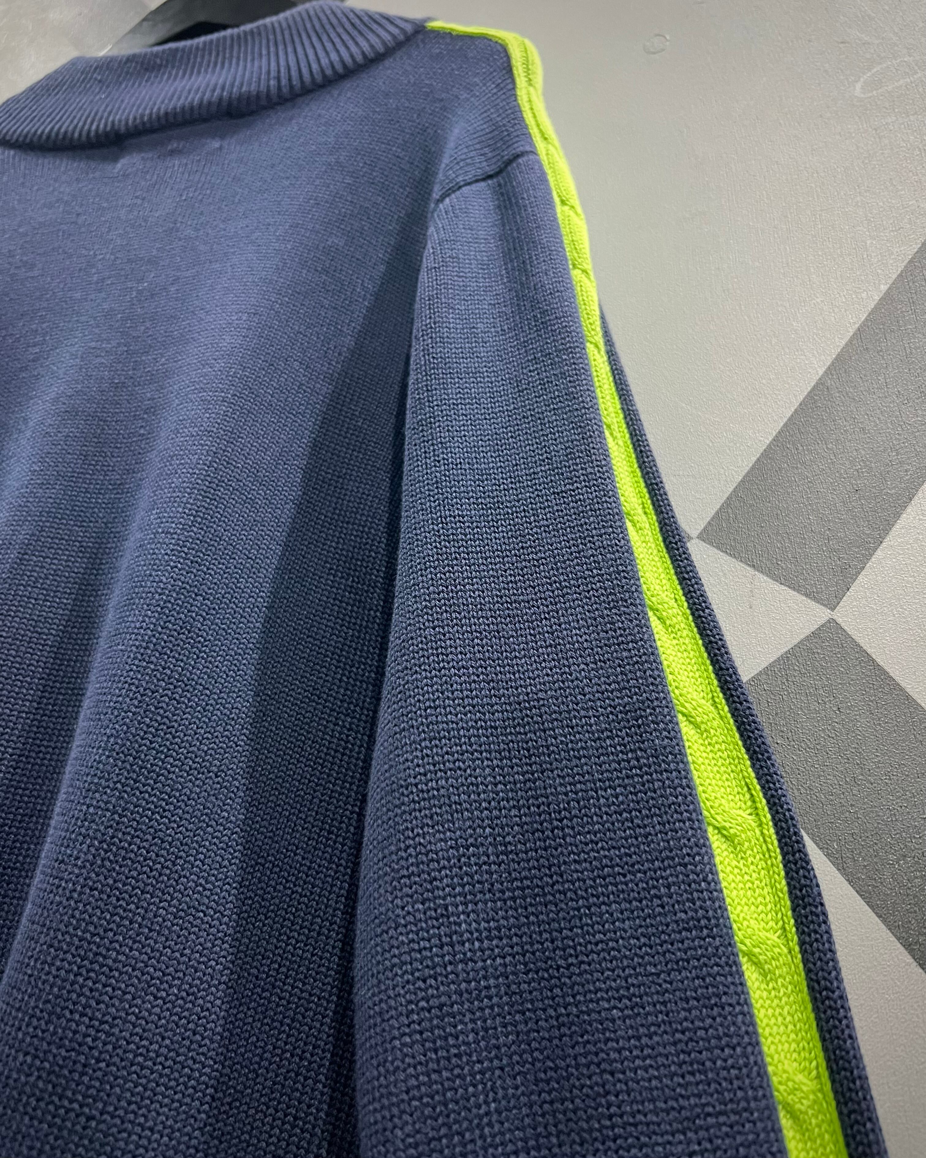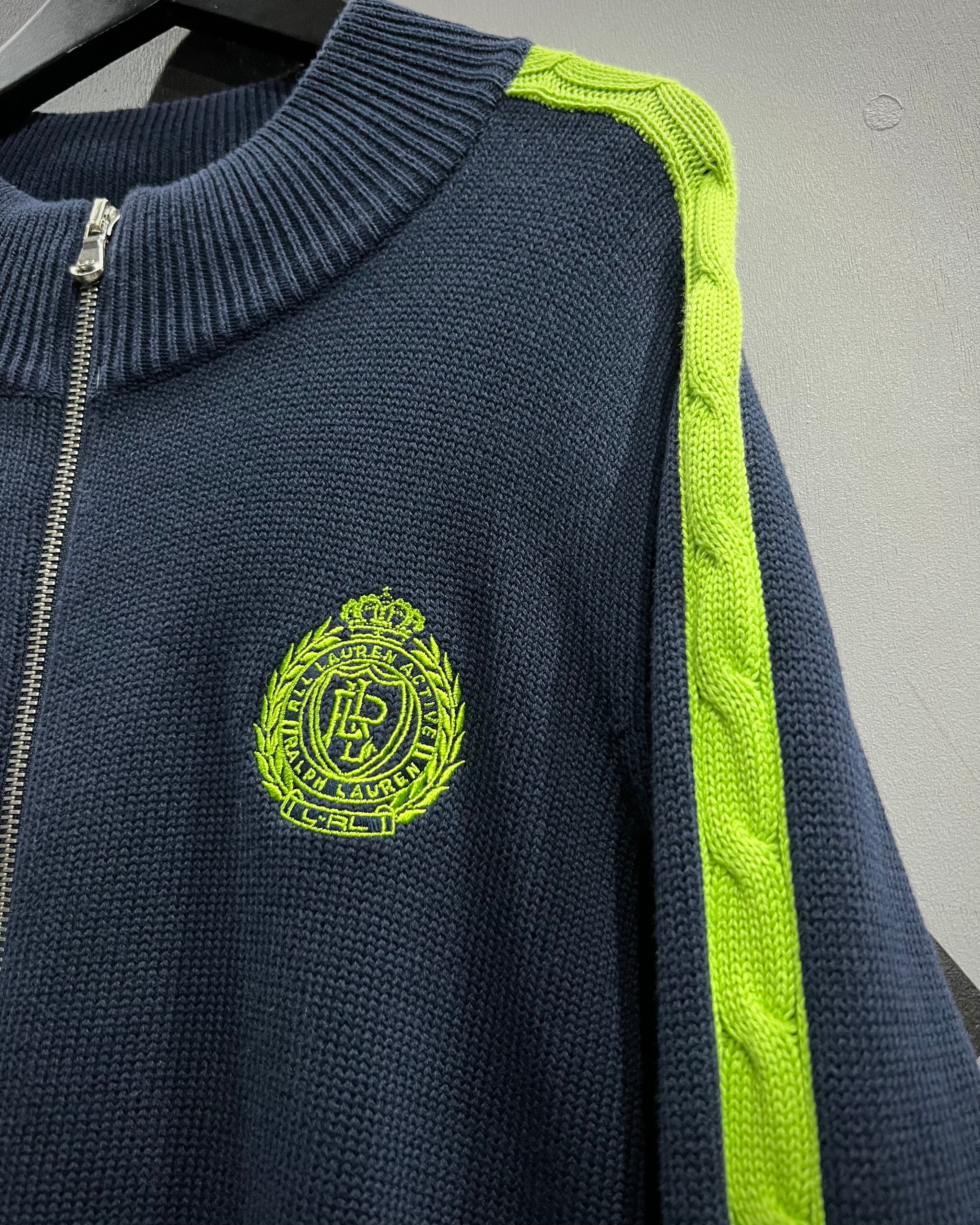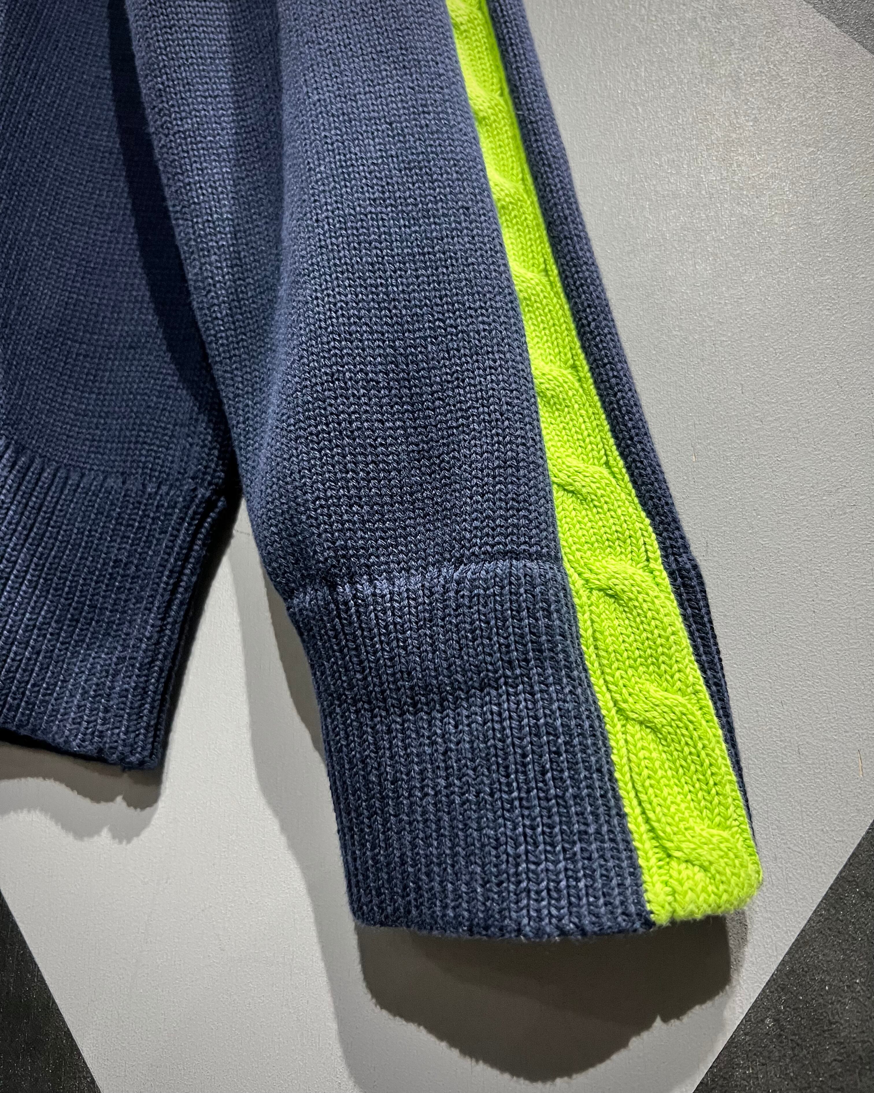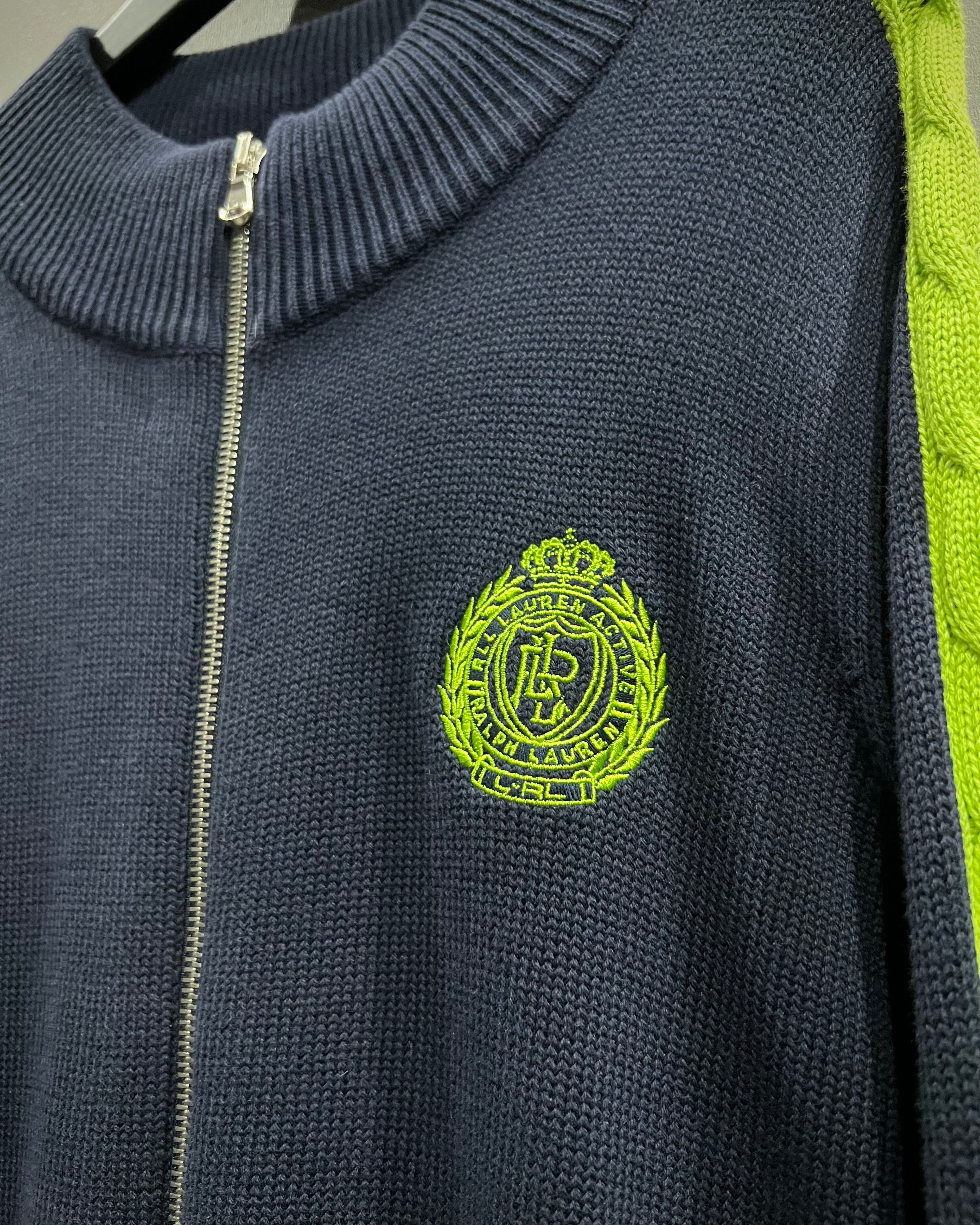 ベースはしっかりと編み立てられたコットンニットボディで、タフさと上品さを兼備。肩口からアームにかけての切り替え部分にはケーブルニットを採用しており、立体感のある編地がシンプルなシルエットに奥行きを与えています。さらに、蛍光ライムグリーンの発色が加わることで、アクティブな印象とモードな鮮烈さをプラス。フロント胸元にはクレスト刺繍が施され、プレッピーなラルフらしい気品が漂います。