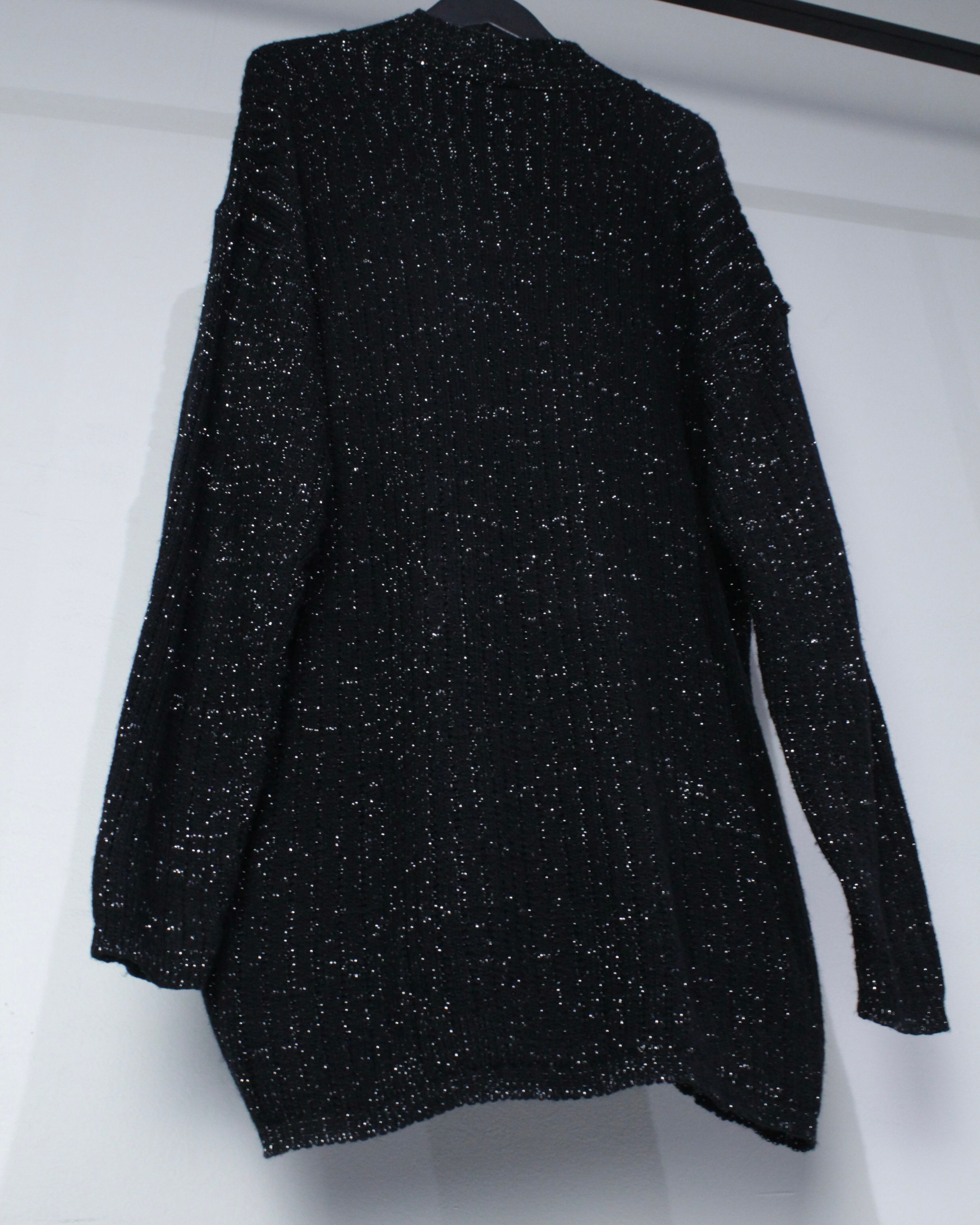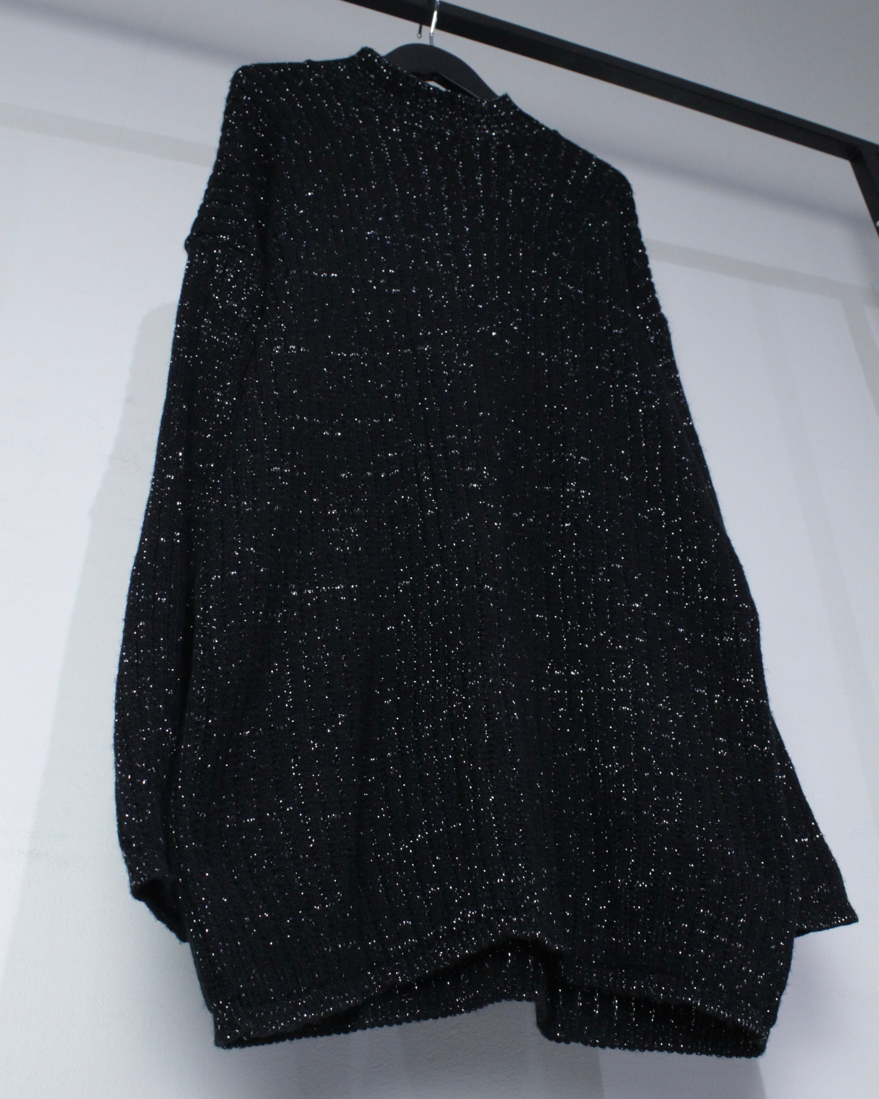 黒スラックスやレザーパンツでモノトーンにまとめ、シルバーアクセと合わせると一気にラグジュアリーな印象に。デニムやカーゴパンツにラフに合わせて、ラメ糸の煌めきを際立たせたストリートスタイルもおすすめです。