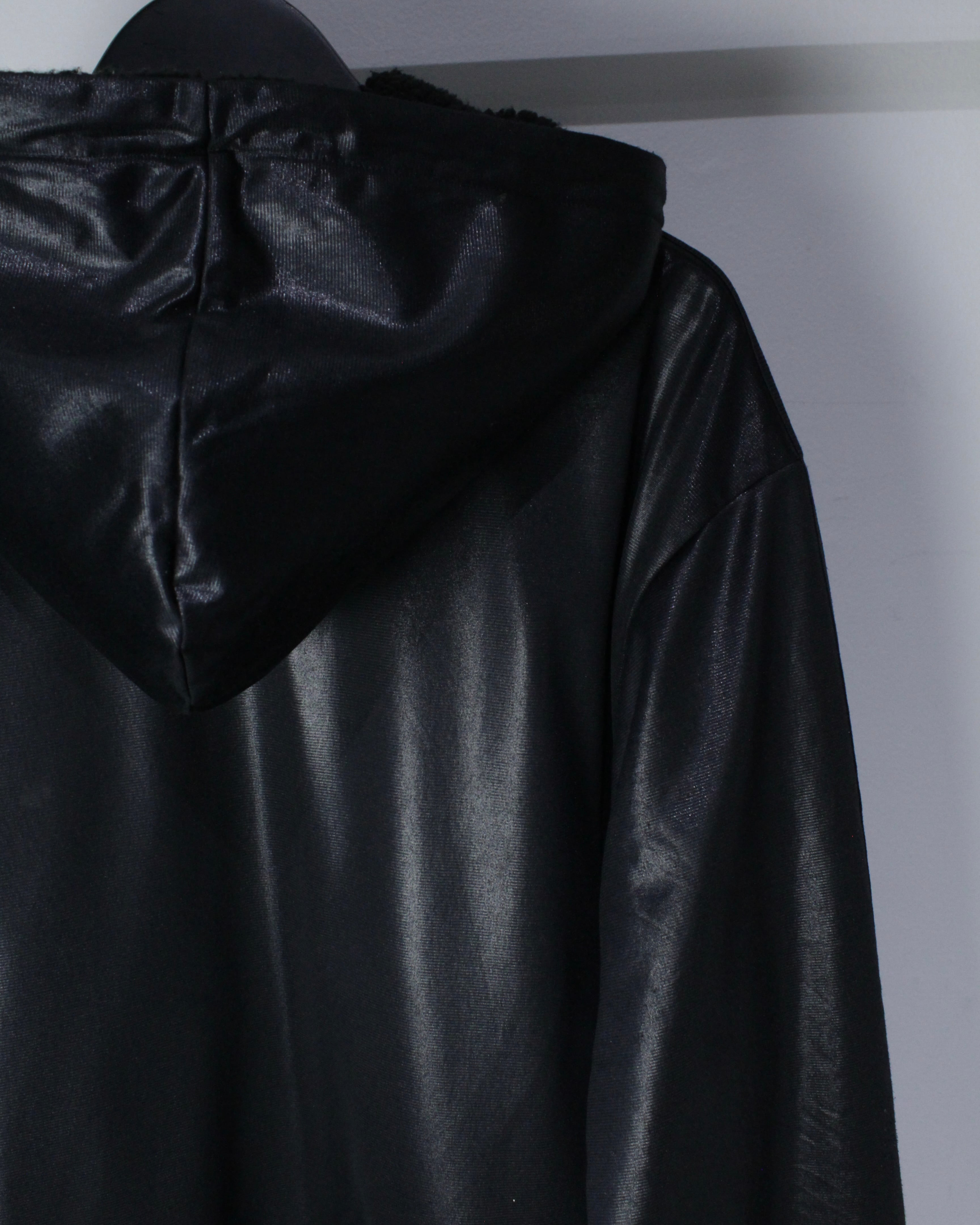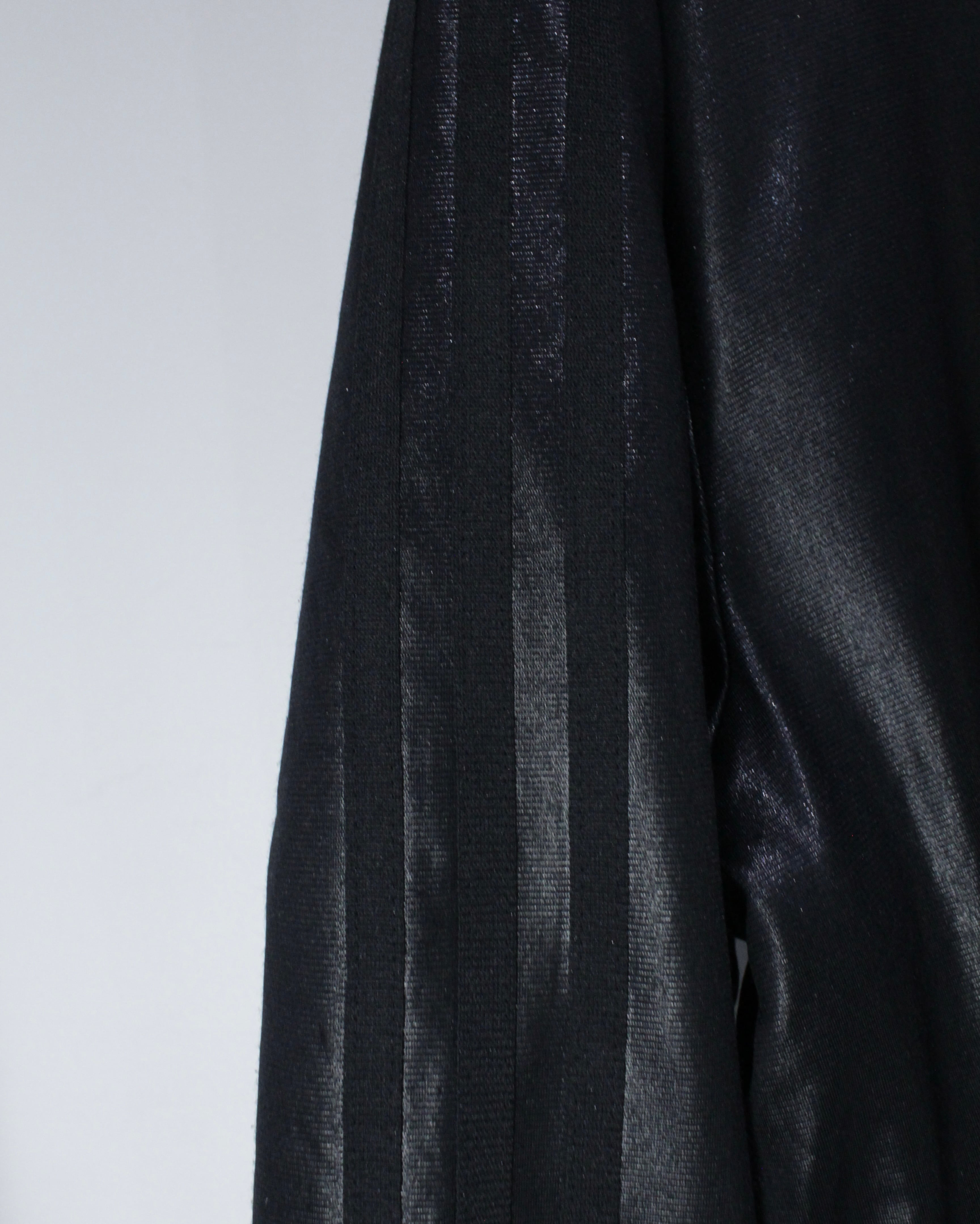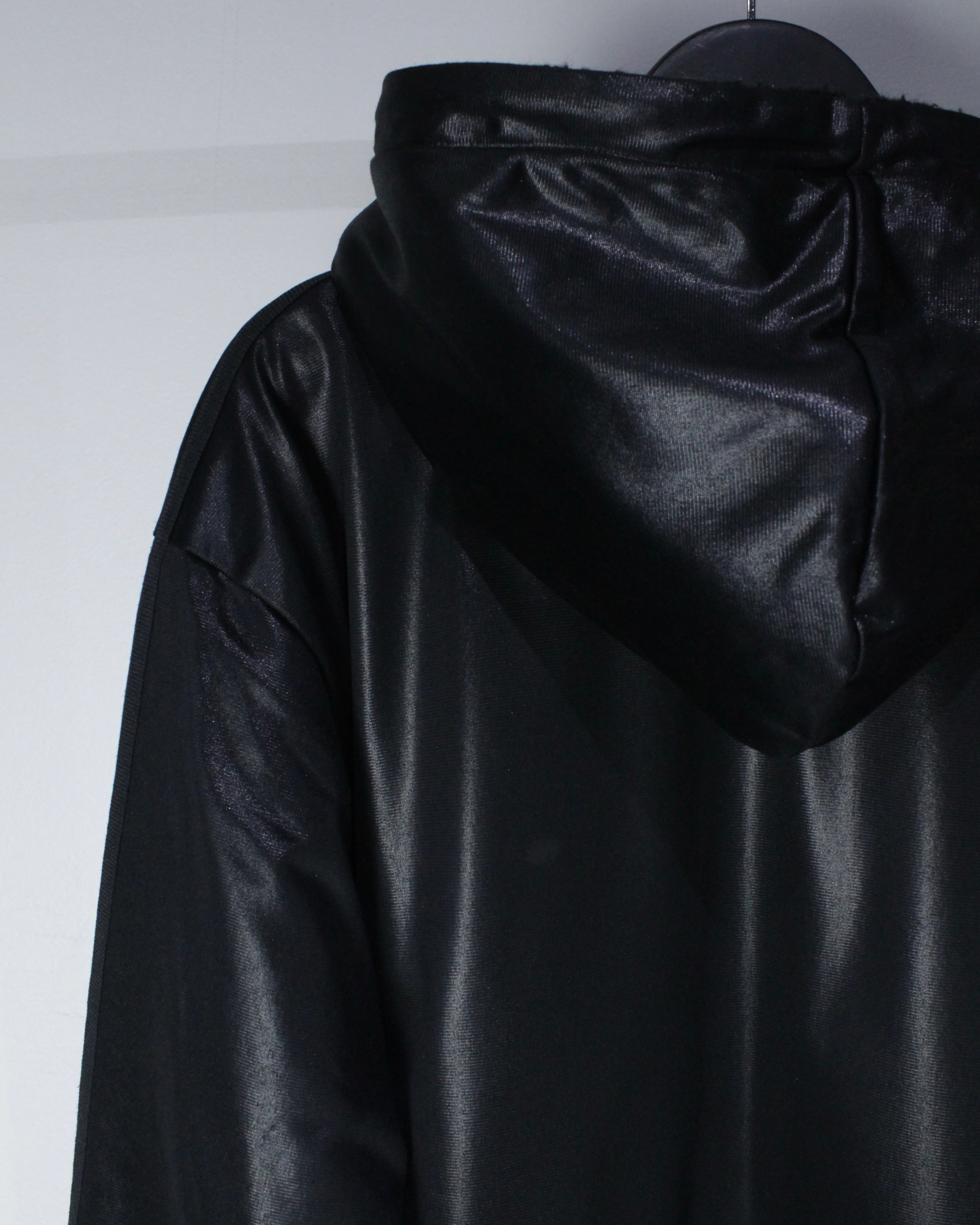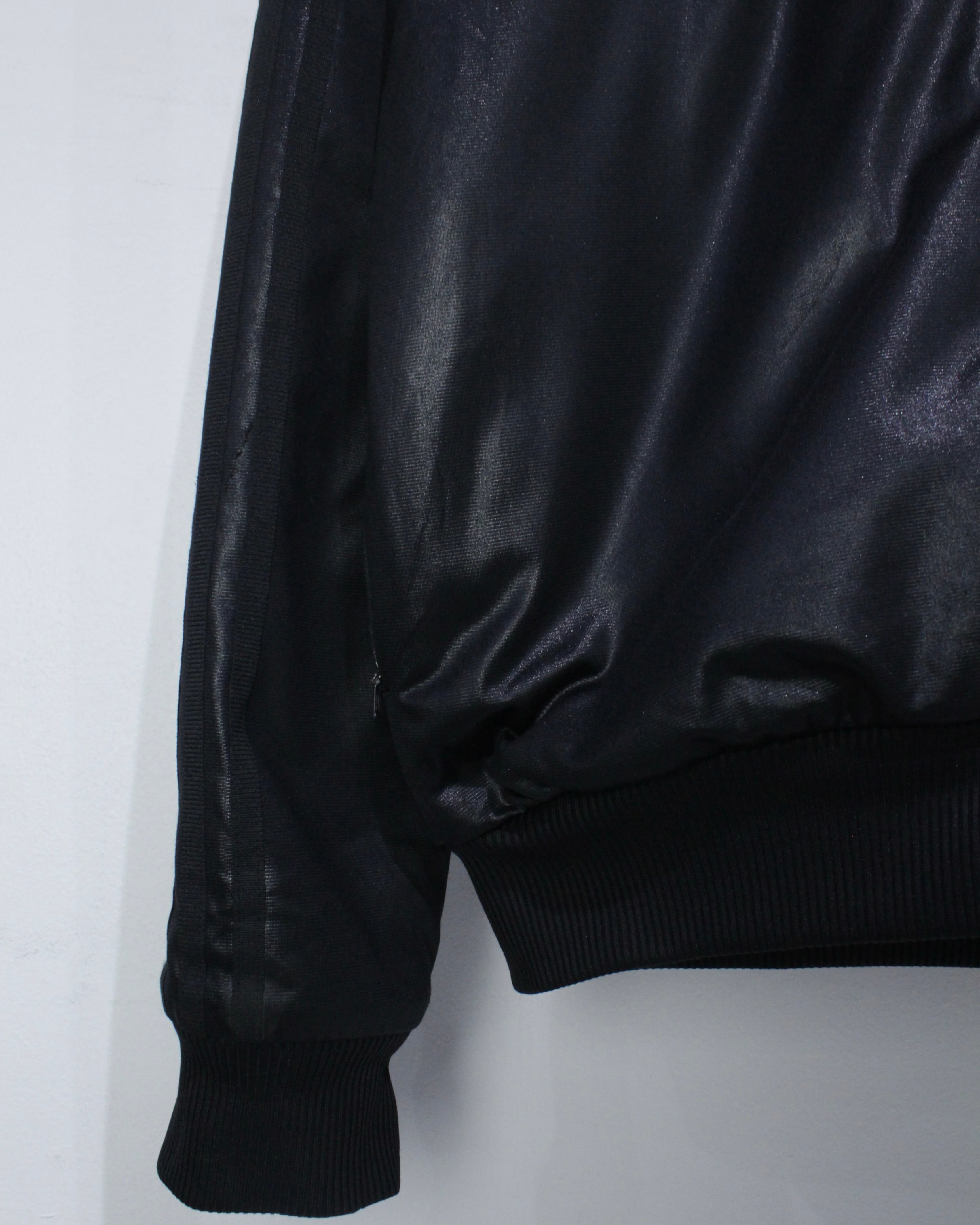 鈍い光沢を帯びたブラックのボディは独特の質感で、角度によって艶が変化する高級感のある表情を演出。胸元と裾の刺繍ロゴ、ジップチャーム至るまで徹底的に作り込まれており、オリジナルならではの重厚な存在感を放ちます。