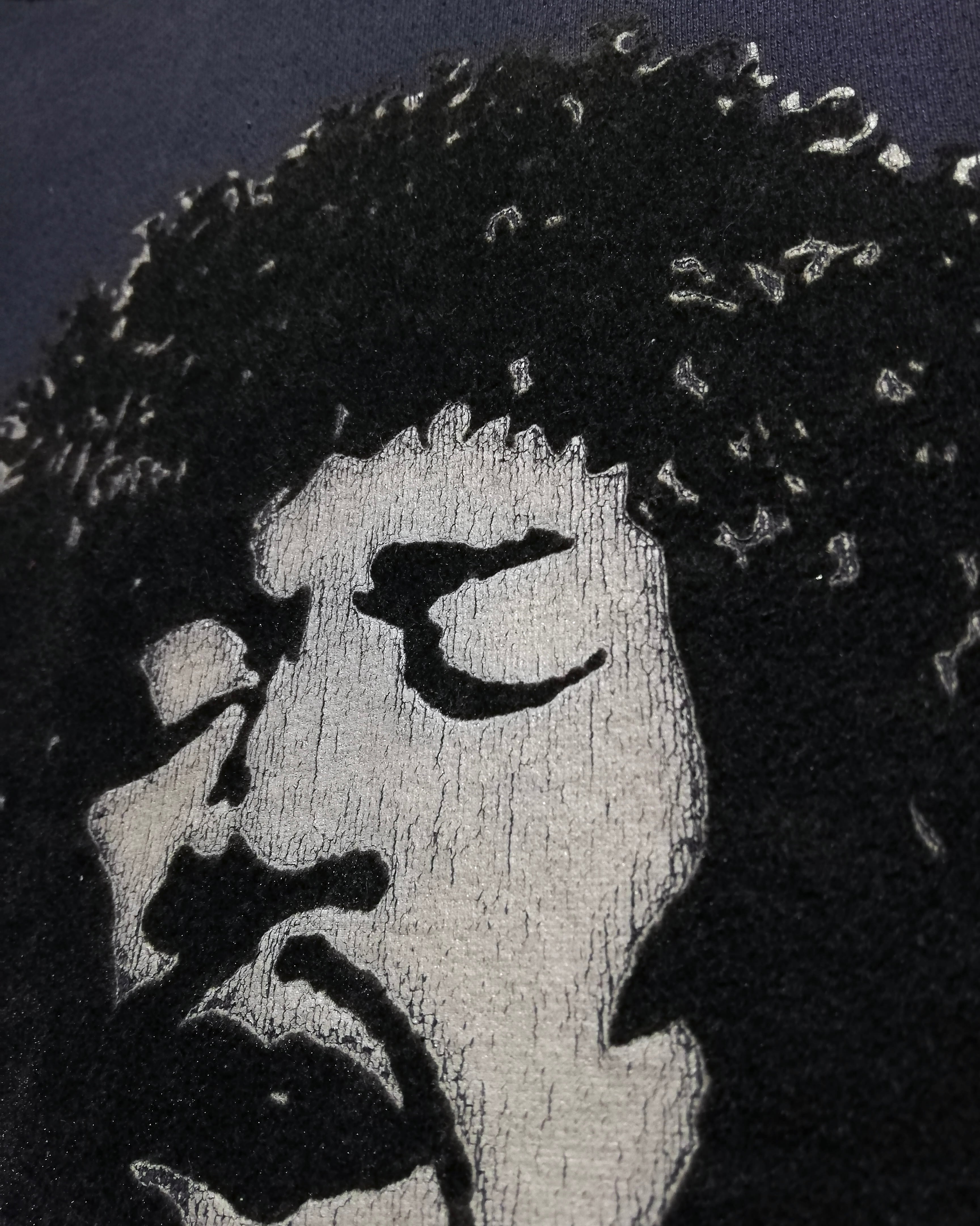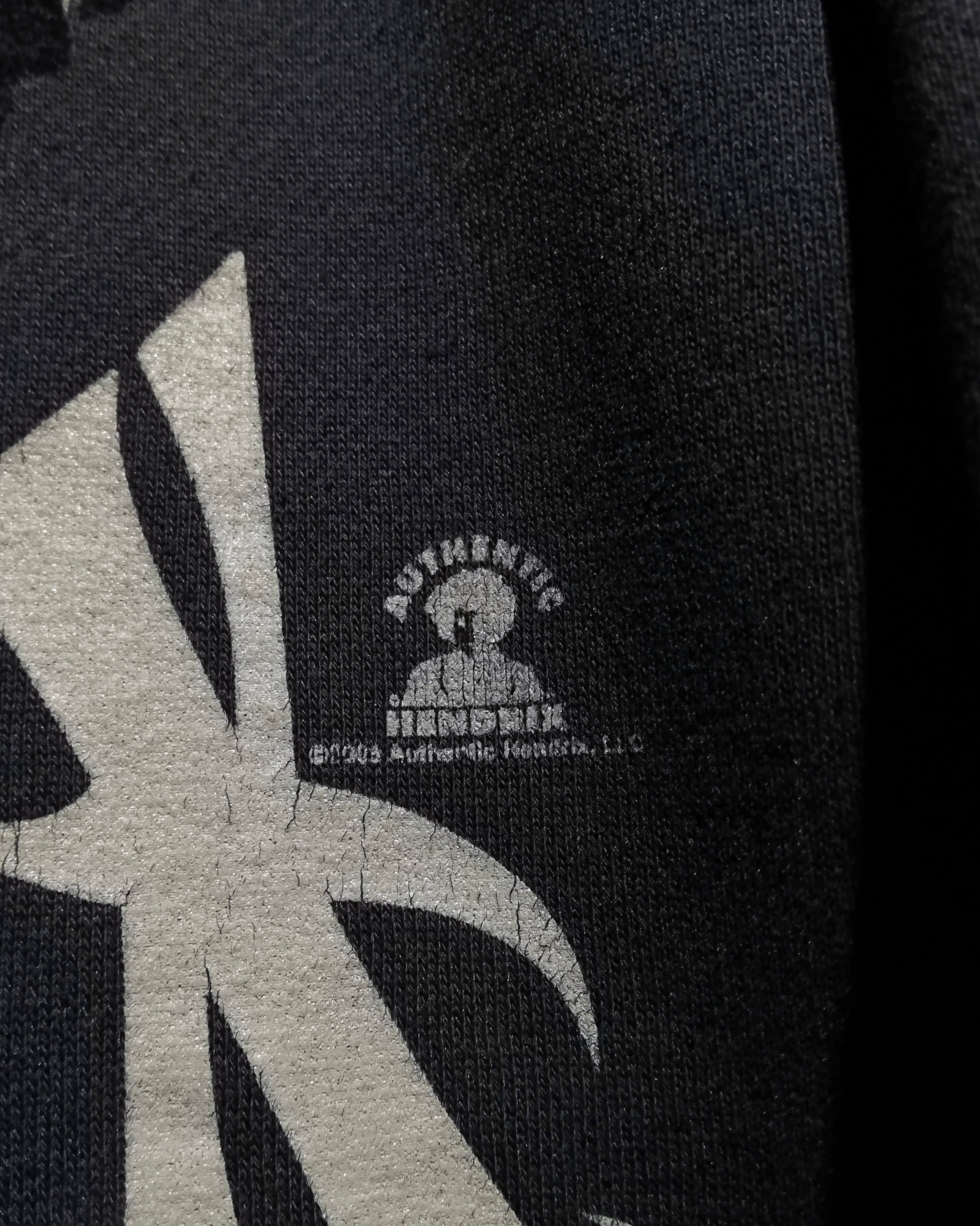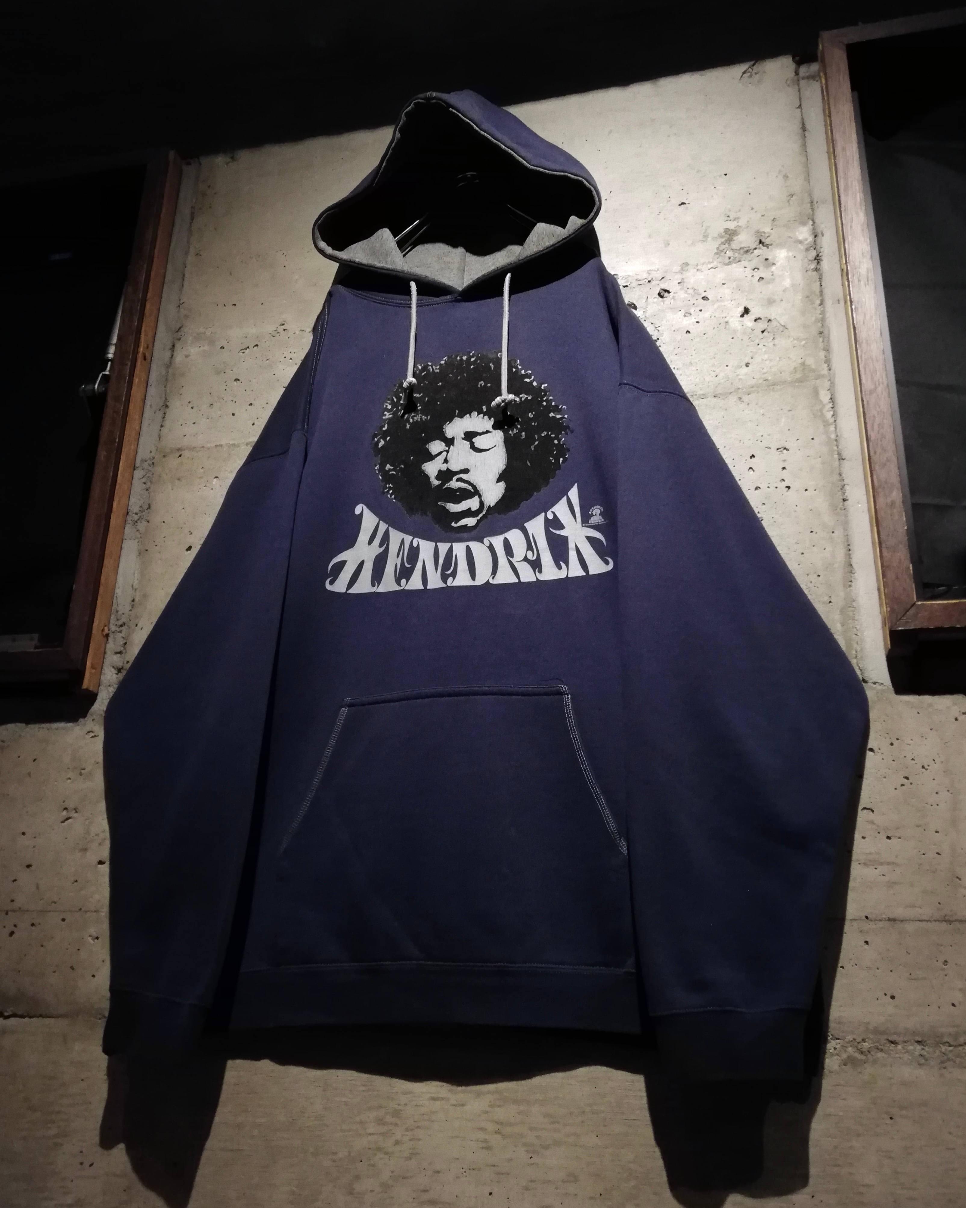ネイビーボディにジミ・ヘンドリックスの象徴的なポートレートと、独特のタイポグラフィで描かれた “HENDRIX” の文字がプリントされた1着。