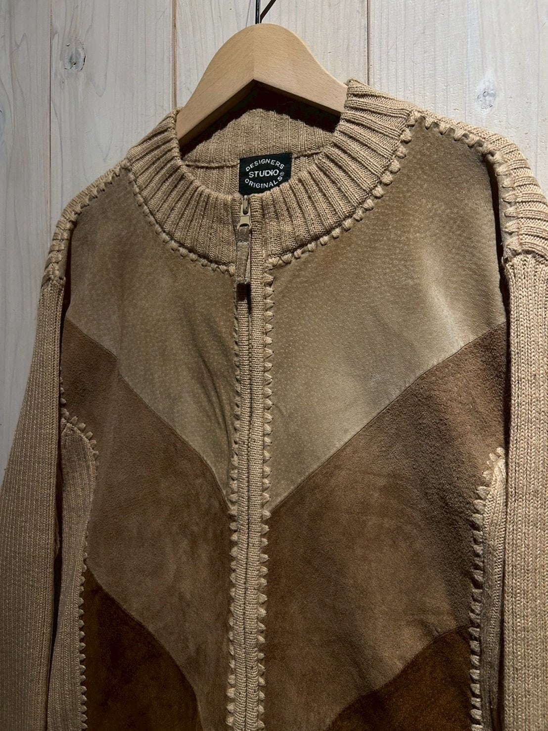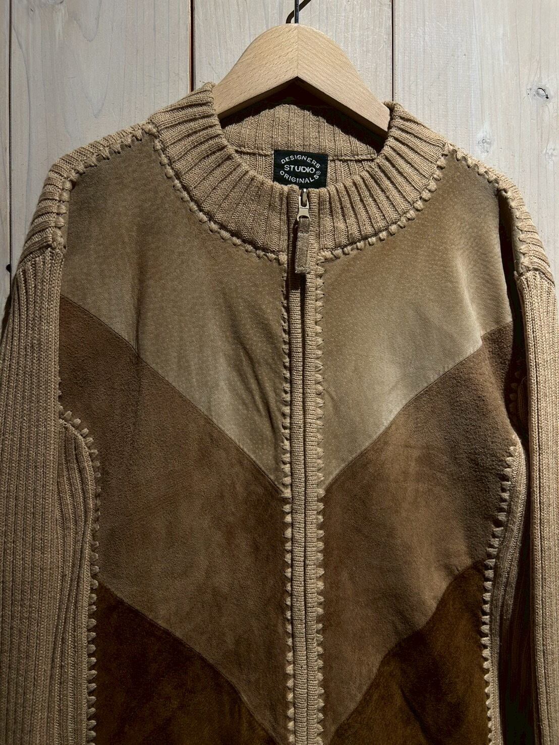 フロントにスエードレザーを大胆に切り替えたニットジャケット。