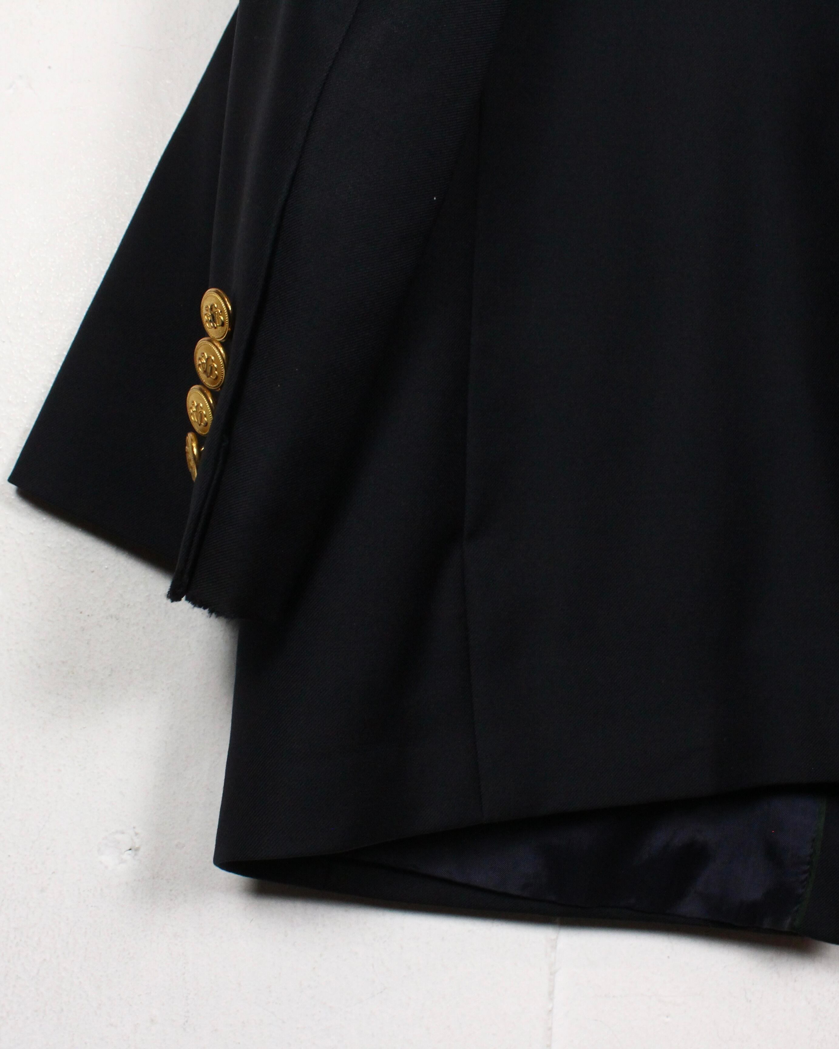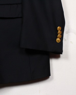 深みのあるカラーをベースに、フロントと袖口にはゴールドメタルボタンを配した王道のディテール。クラシックなノッチドラペル、程よい構築感を備えたショルダーライン、そして流れるように落ちる美しいシルエットは、老舗ブランドならではの端正な仕立てを実感させてくれます。