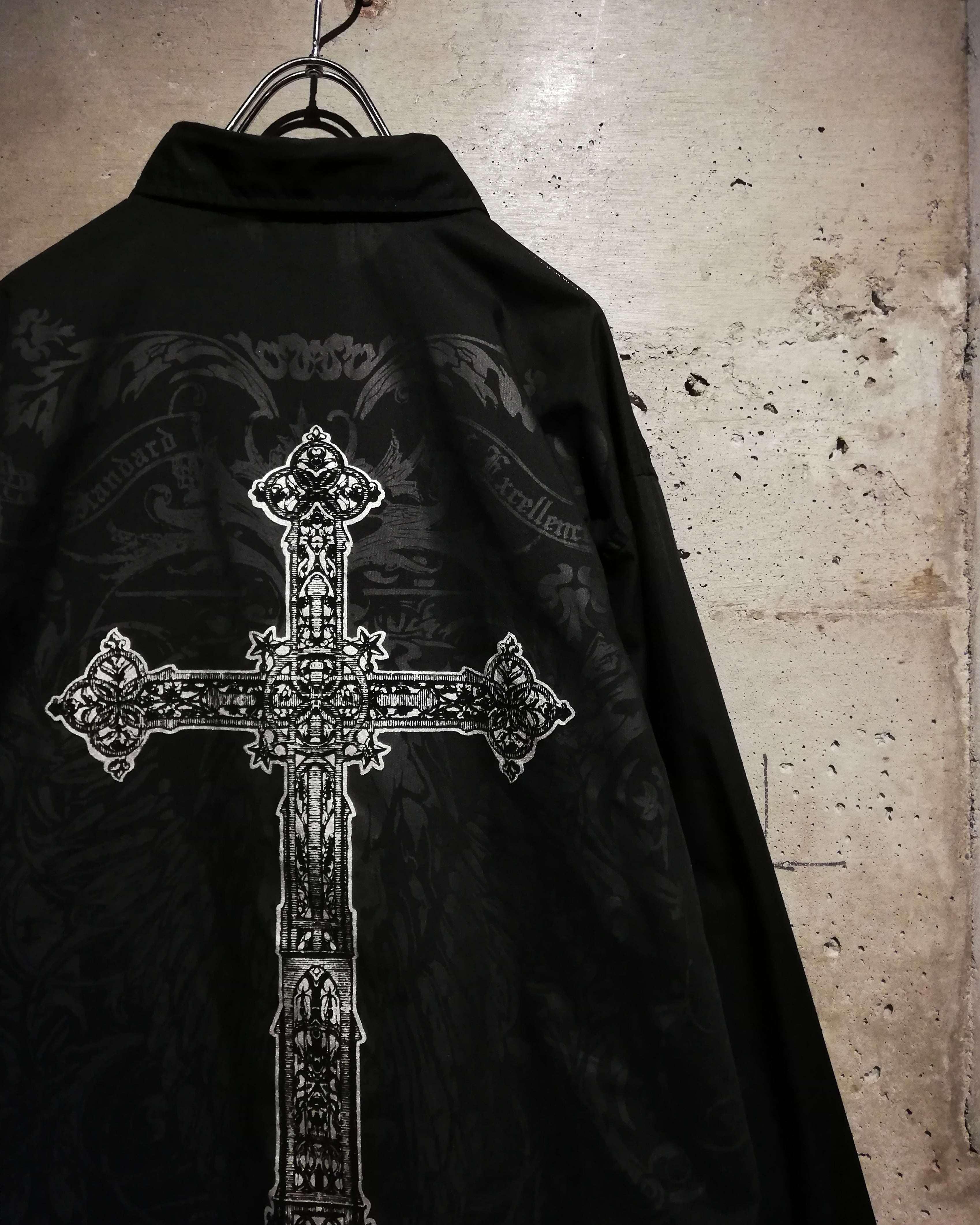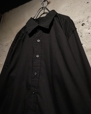 ブラックのボディをベースに、随所に施された装飾的な刺繍や大胆なグラフィックプリントが存在感を放つ長袖シャツ。