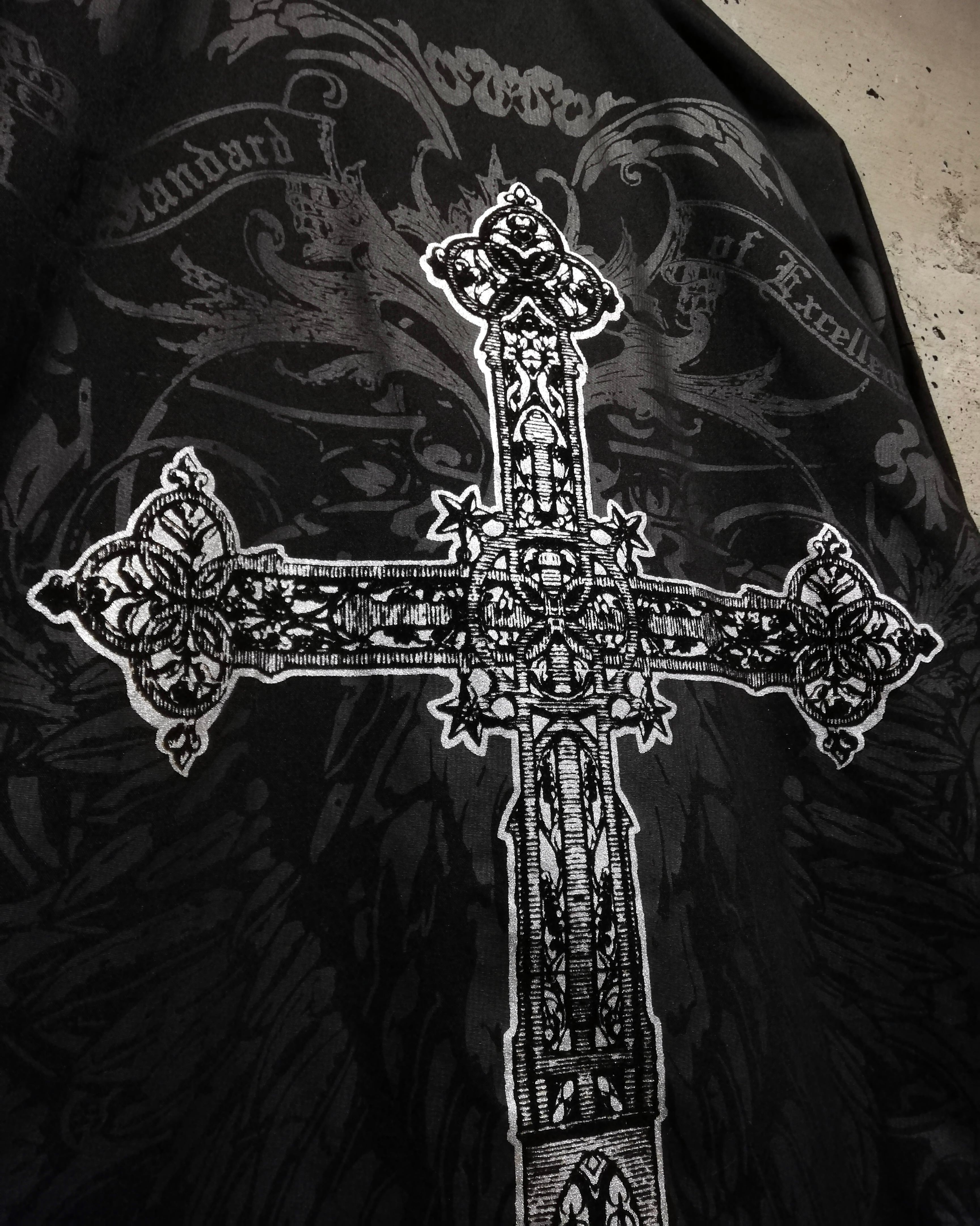 最大の特徴は背面に配されたクロスモチーフ。圧倒的なスケール感を誇り、荘厳な装飾をまとったグラフィックはゴシック建築を思わせる重厚さと繊細さを併せ持ちます。