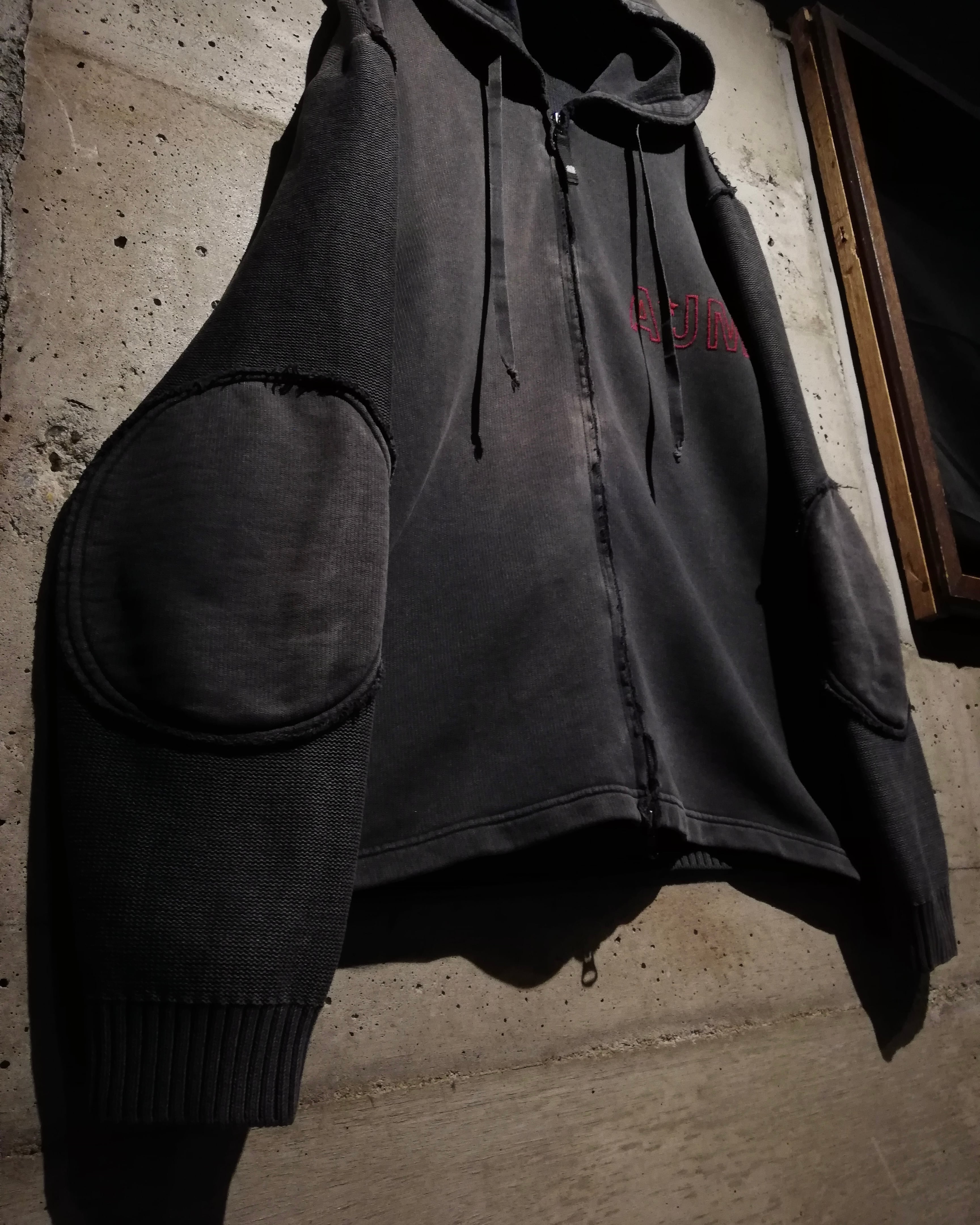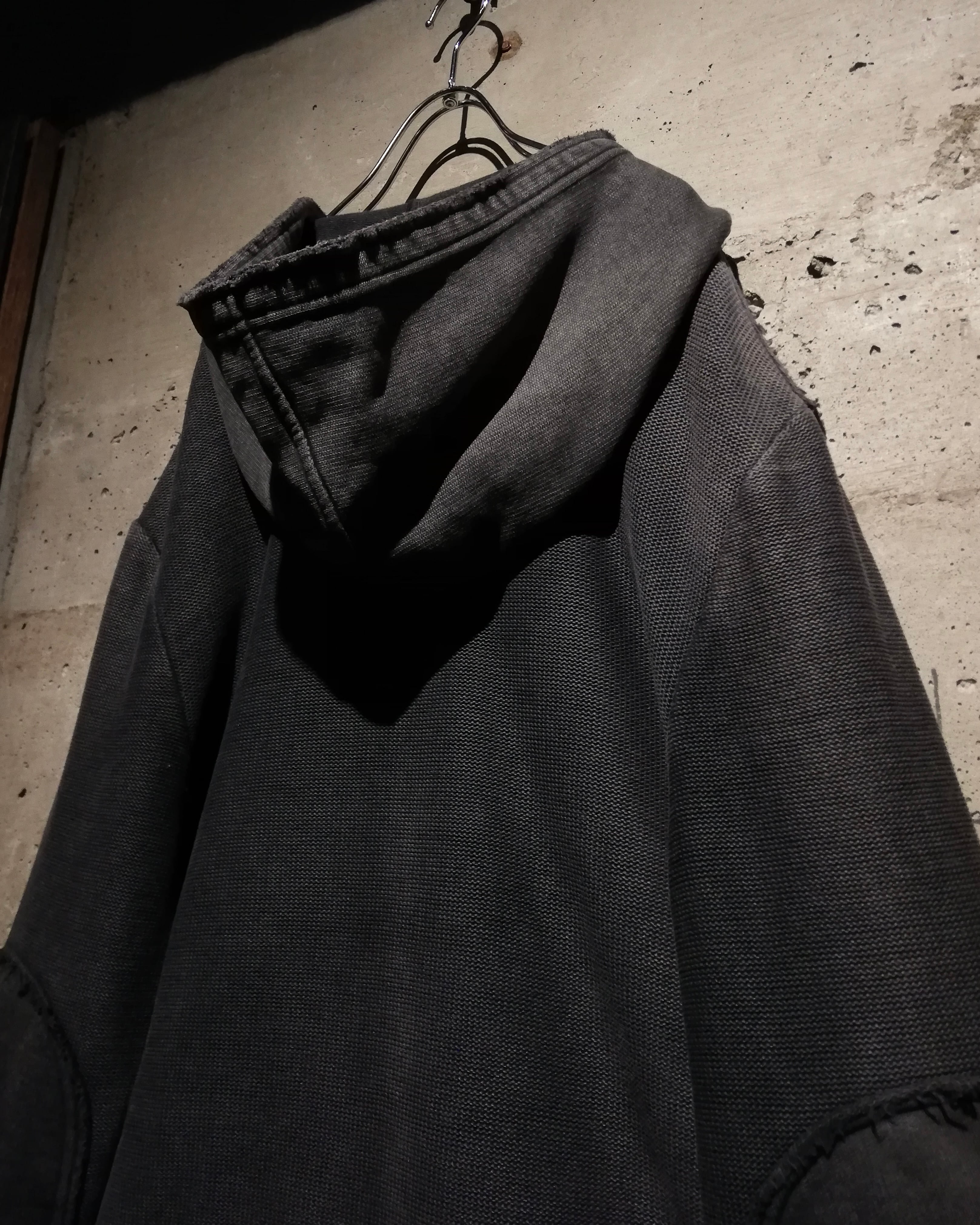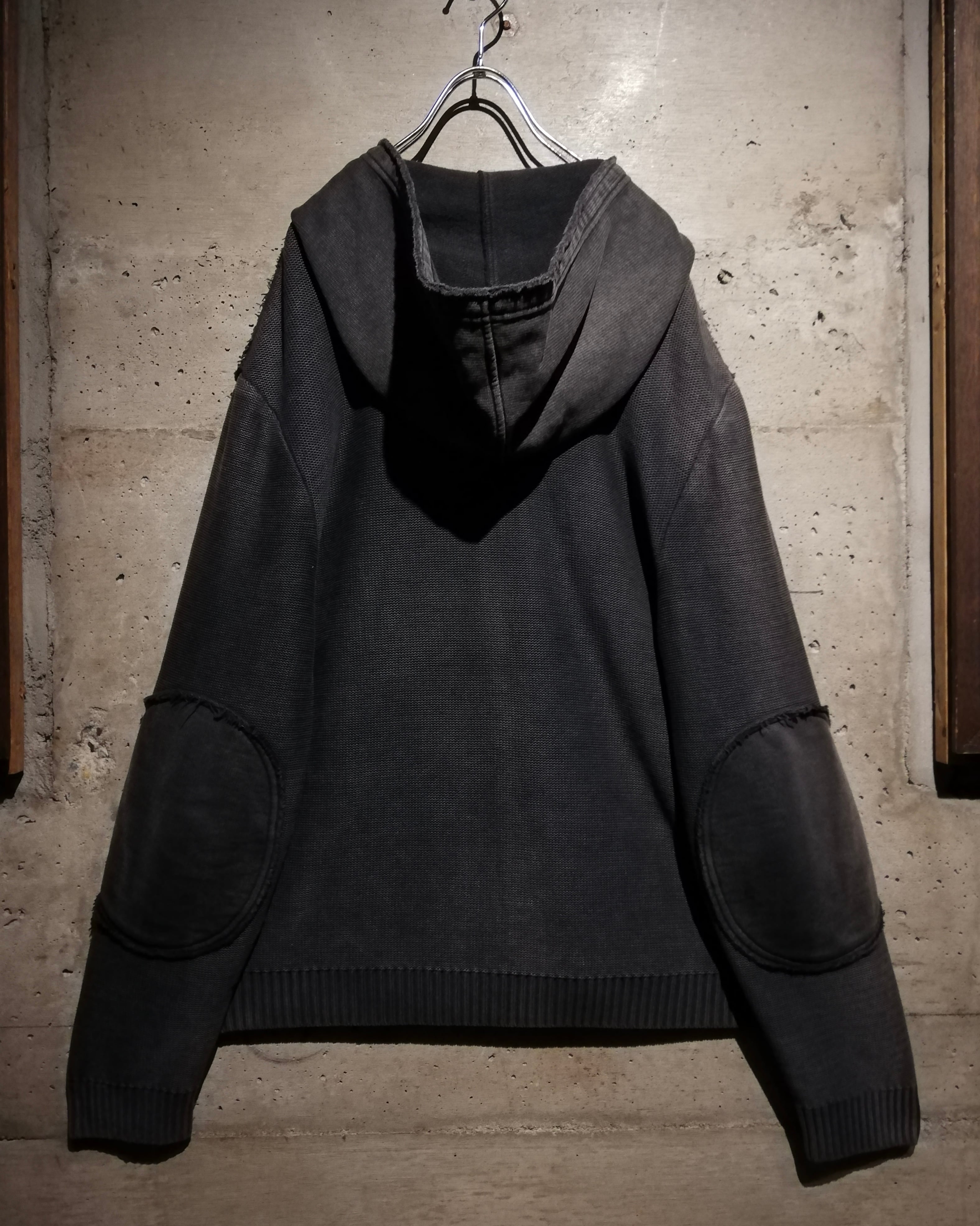 経年変化によってボディが美しくフェードした、古着特有のリアルな迫力と味わい深さのあるジップアップコットンニットフーディ。