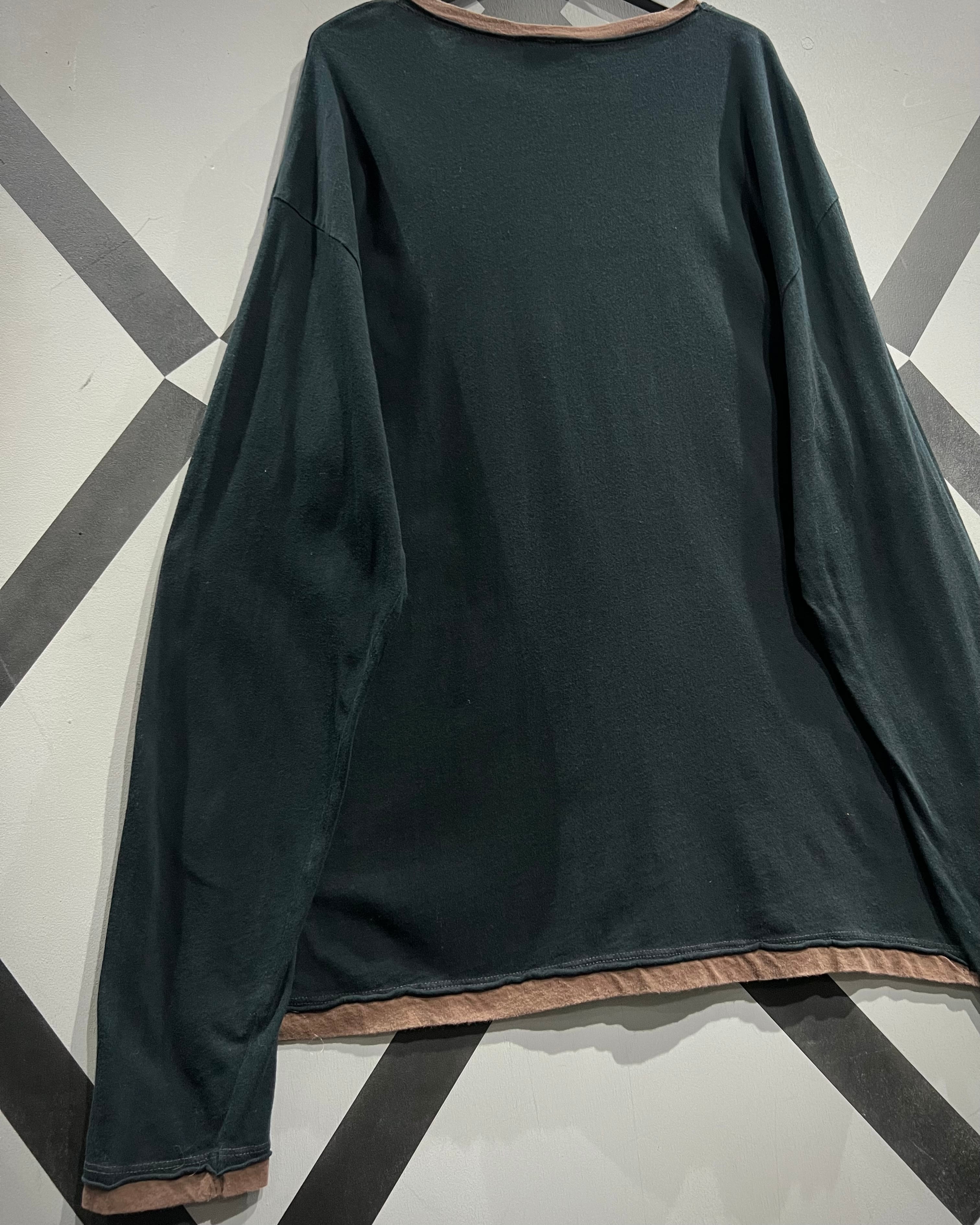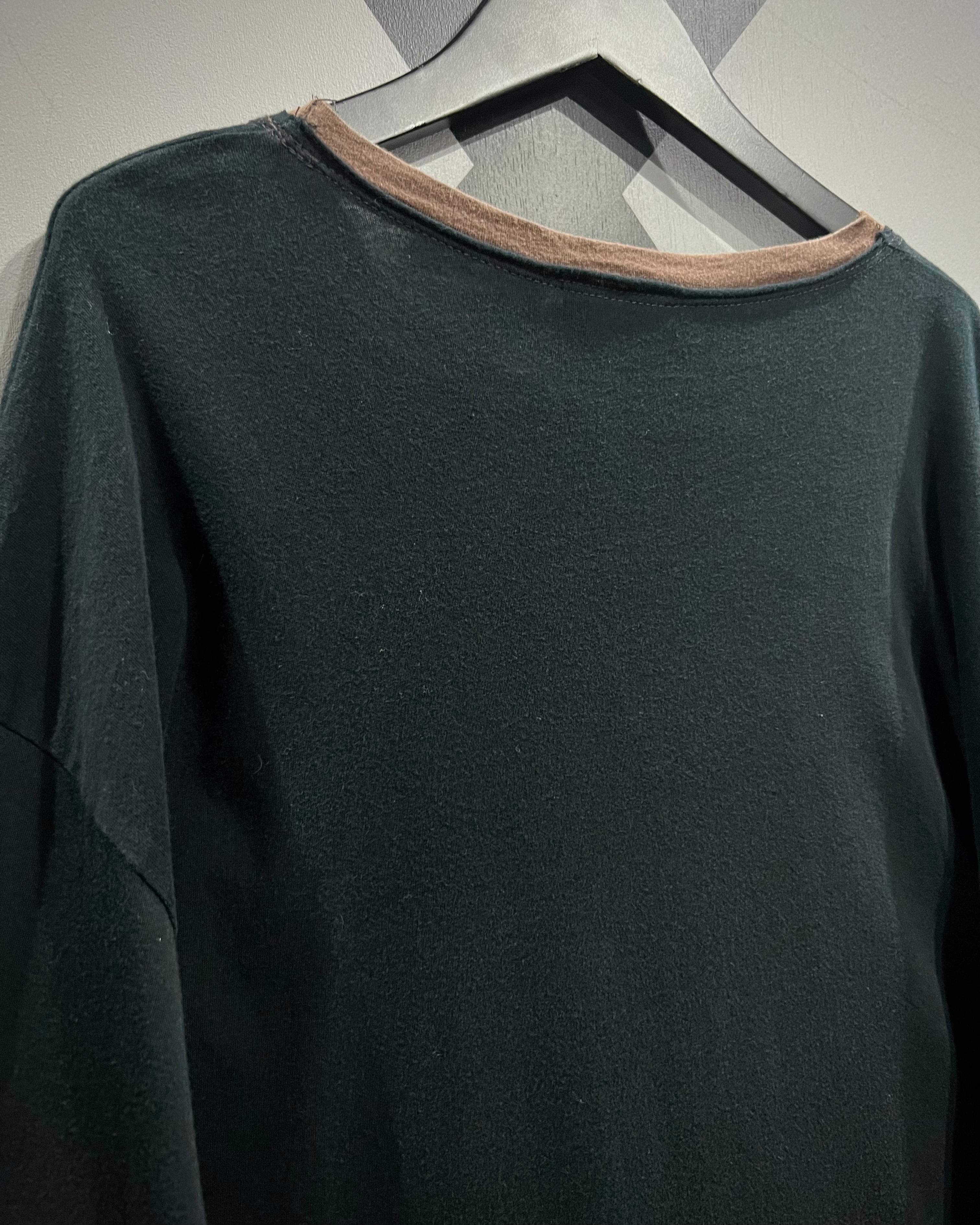ディテールとして注目すべきは、首元、袖先、裾に施されたブラウンの別生地のレイヤード風デザイン。これにより単なるブラックTシャツではなく奥行きと立体感が演出され、古着好きには堪らないアクセントとなっています。