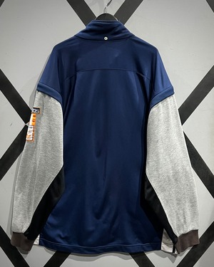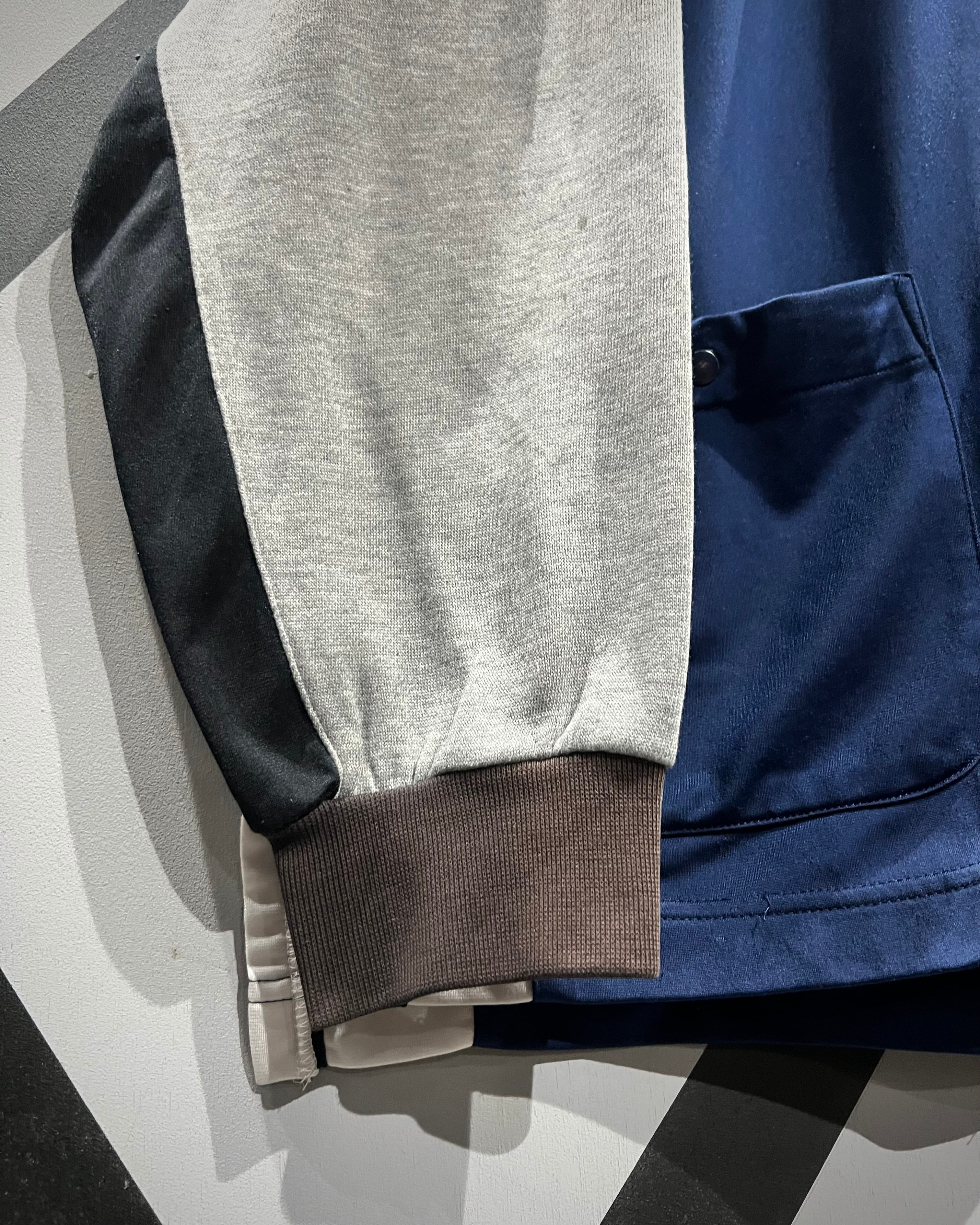 深みのあるネイビーボディをベースに、アーム部分にはグレーのスウェット生地を切り替えた、異素材感あふれる1着。