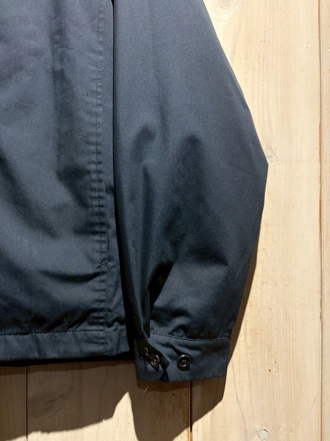 ボディは程よいハリを備えたナイロン、ポリ混紡生地を採用し、フロントにはヴィンテージらしいアルミ製のTALONジップを搭載。経年による鈍い輝きが存在感を放ちます。さらに、袖口にはアジャスターボタンが取り付けられ、シルエット、フィット感の調節も可能です。