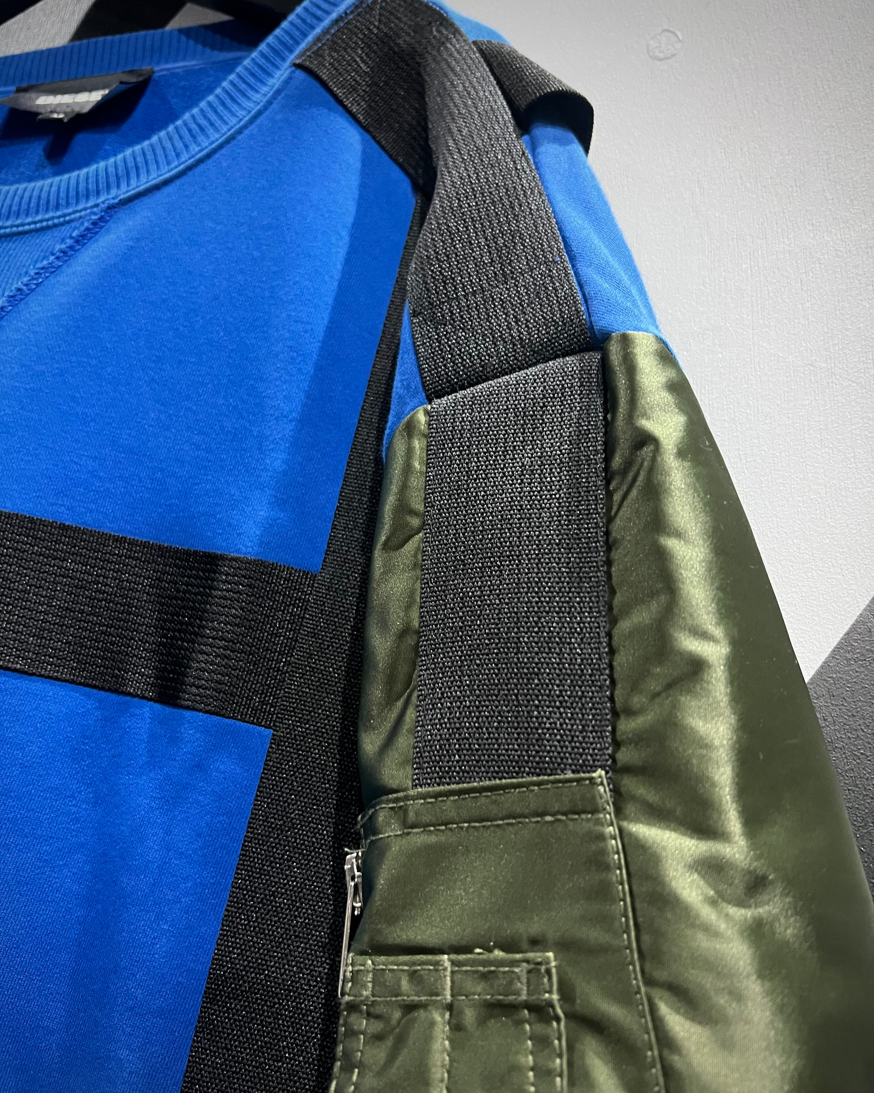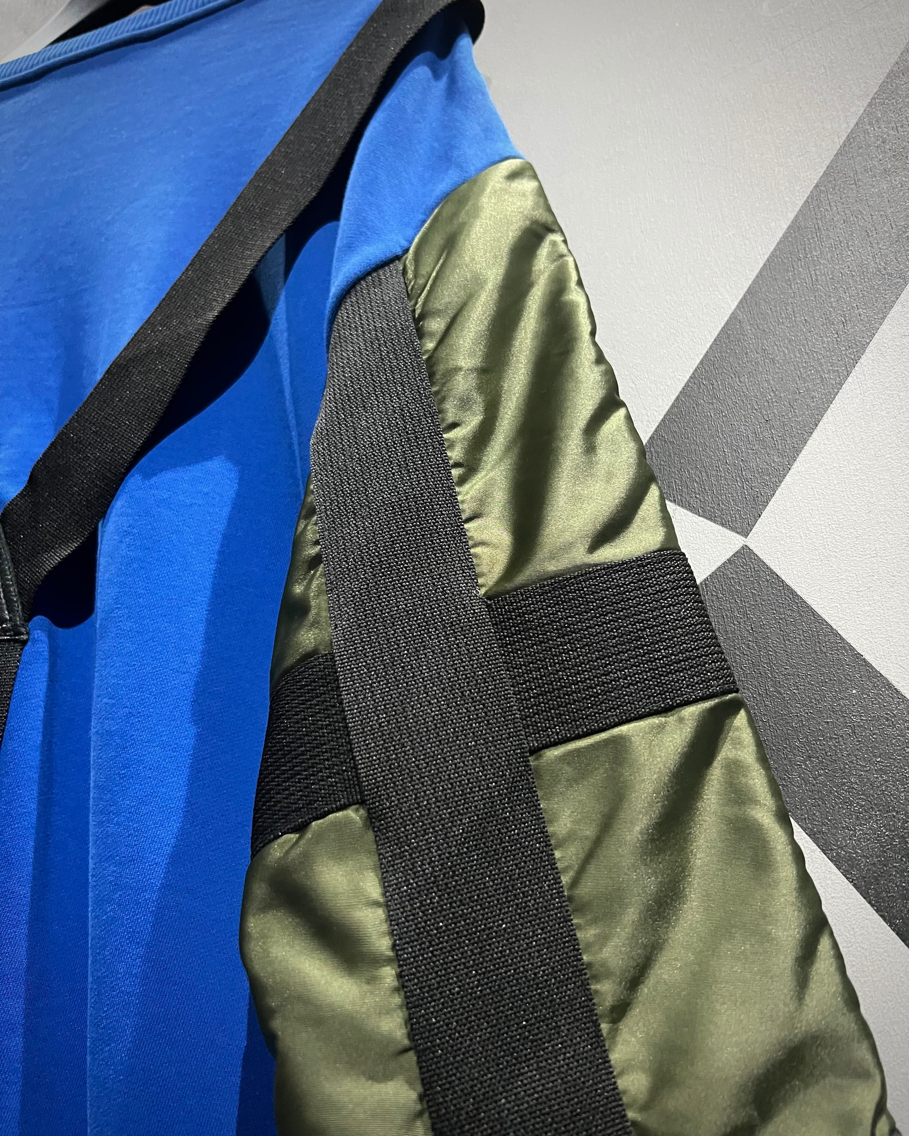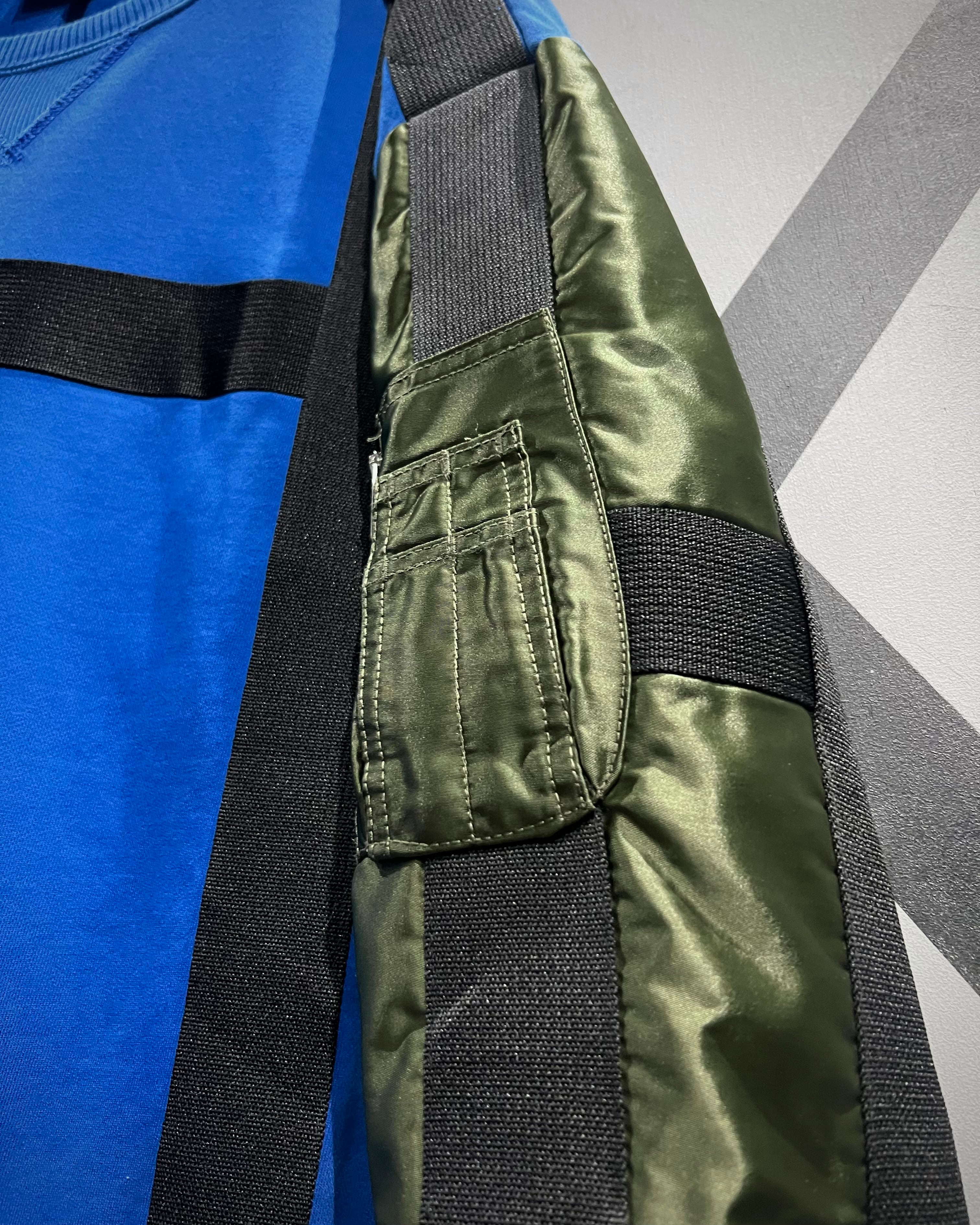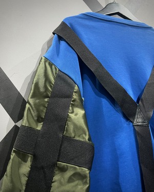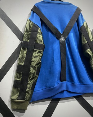 鮮やかなブルーのスウェットボディをベースに、ミリタリーウェアを象徴するMA-1のスリーブを大胆に切り替えたデザインが最大の特徴。
