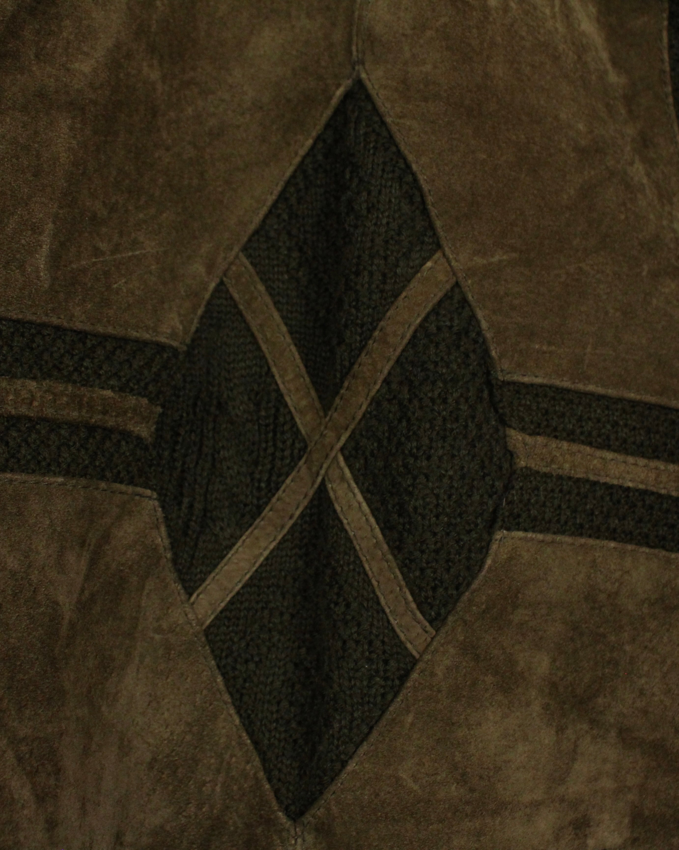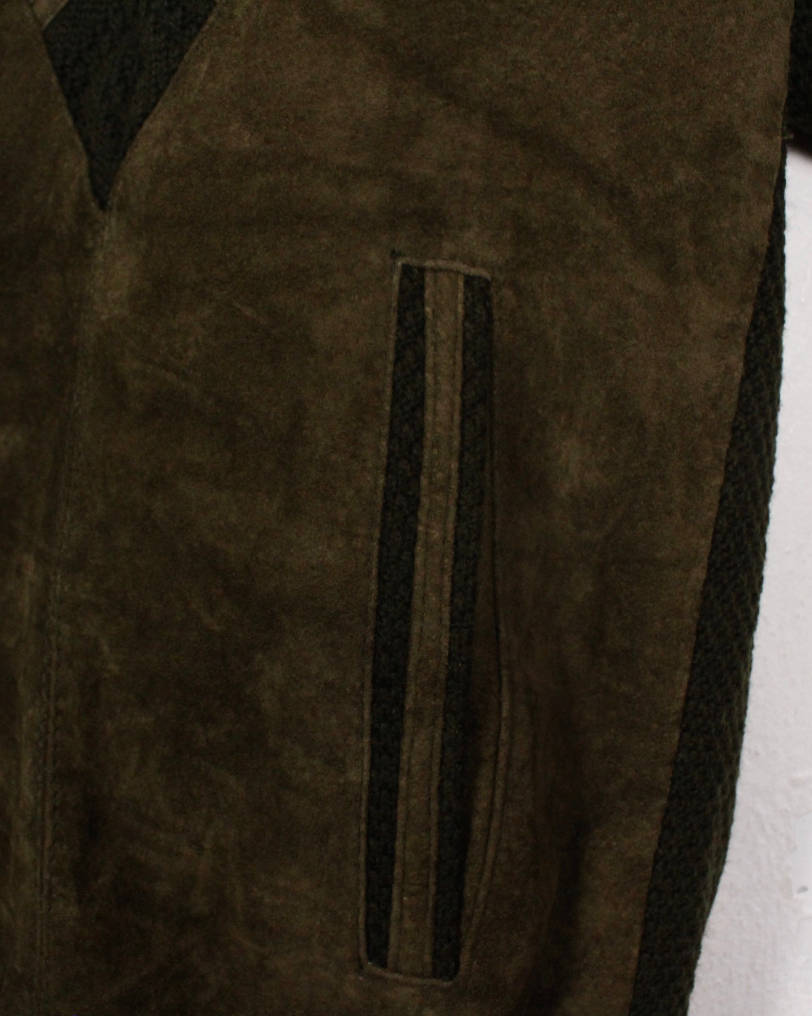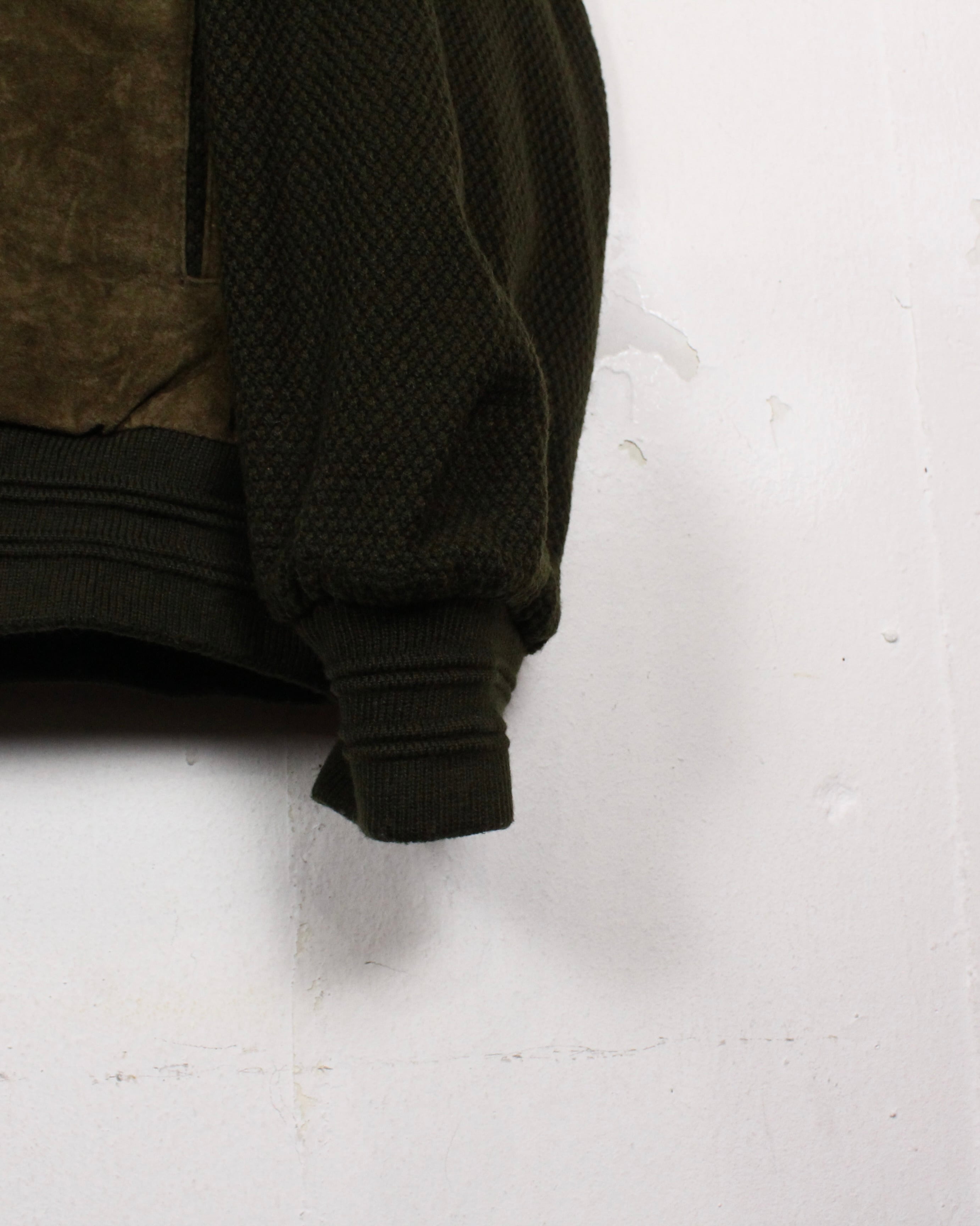 深みのあるオリーブトーンのニットは、ざっくりとした編み地による立体感とガッシリとした安心感を兼ね備え、対照的にスエードレザーはしっとりとした手触りと鈍い光沢を湛え、使い込むほどに増すエイジングを楽しむことができます。