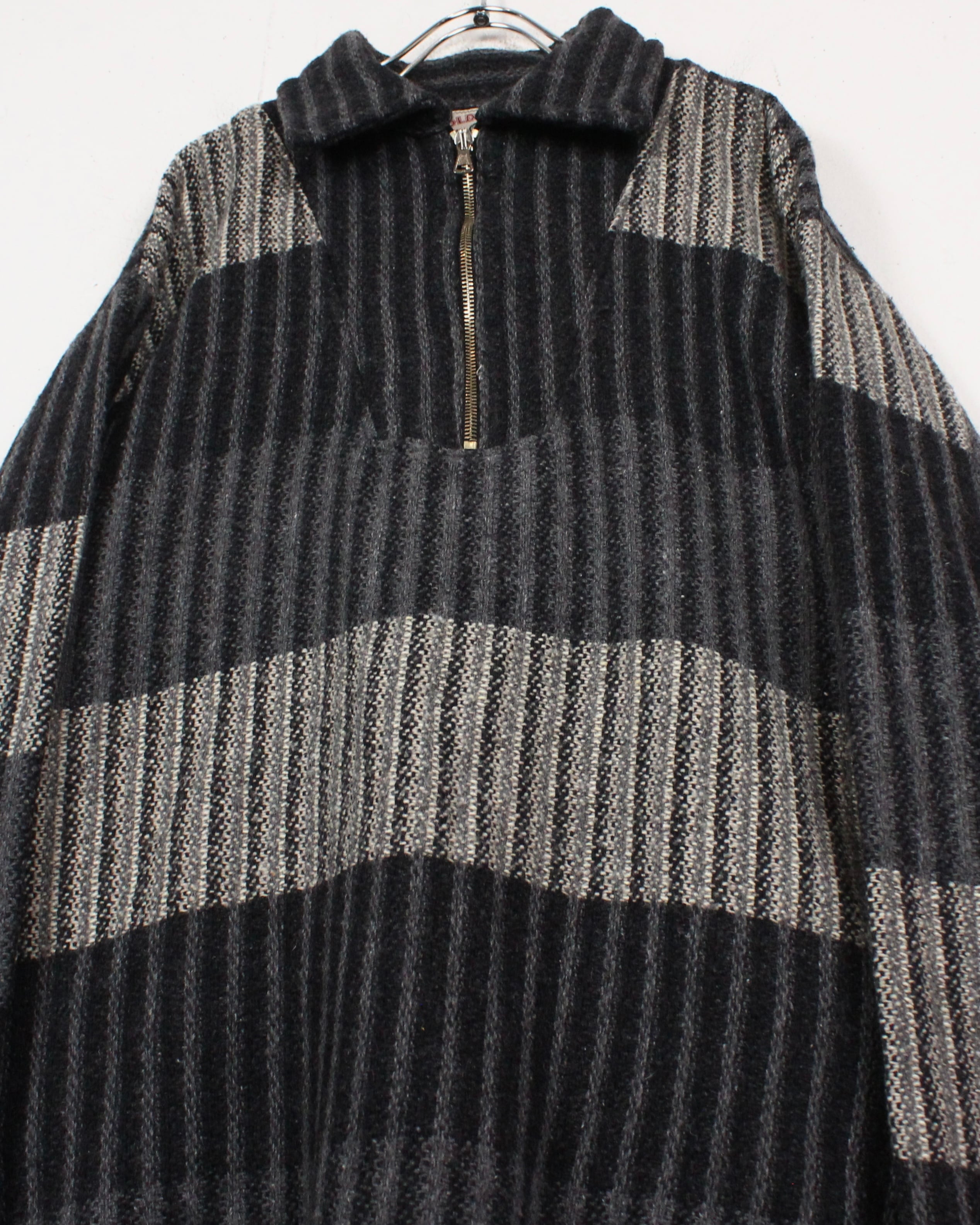 グレー、ホワイトなどのモノトーンのカラーリングでボーダー、ストライプを表現したハーフジップのプルオーバーシャツ。