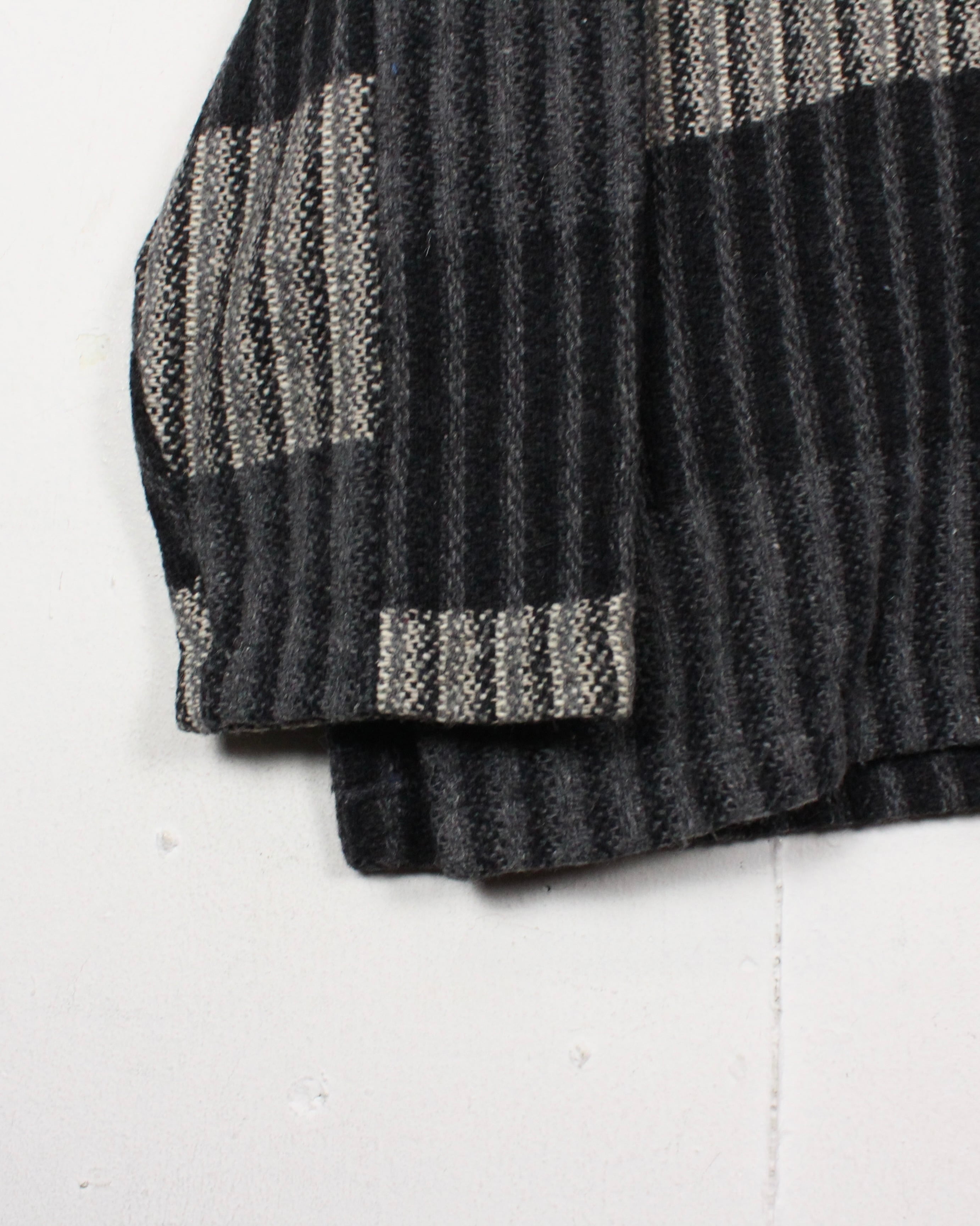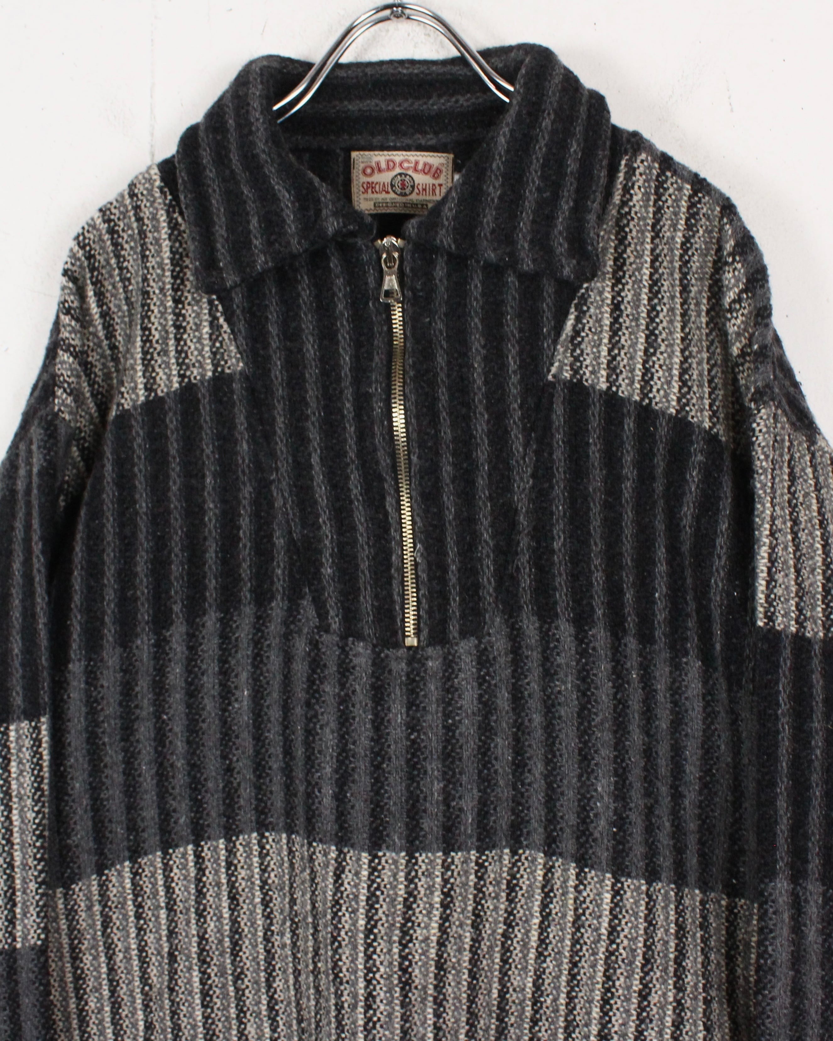 ボディにはダークトーンを基調とした グレー×ブラックのワイドボーダー柄を採用。縦方向に編み立てを交差させることで立体感のある表情に仕上がっています。ハーフジップ仕様の首元は開閉でニュアンスを変えられ、ラフに開けてレイヤードを楽しむのもおすすめ。