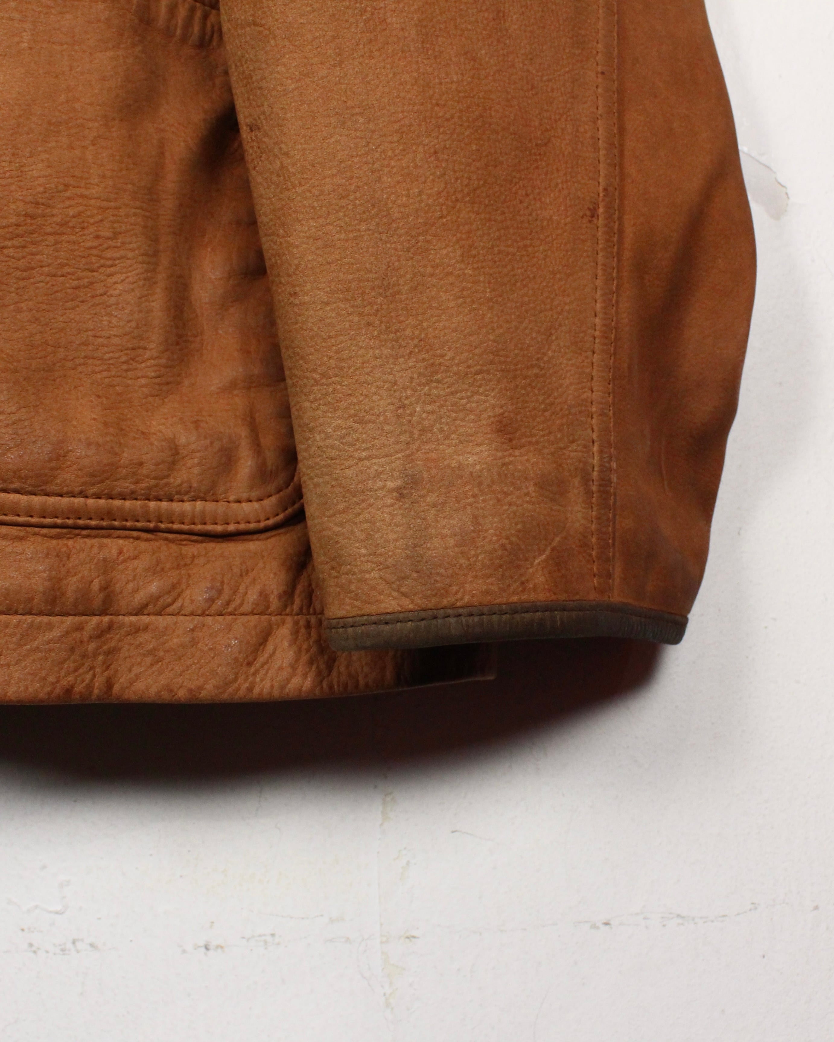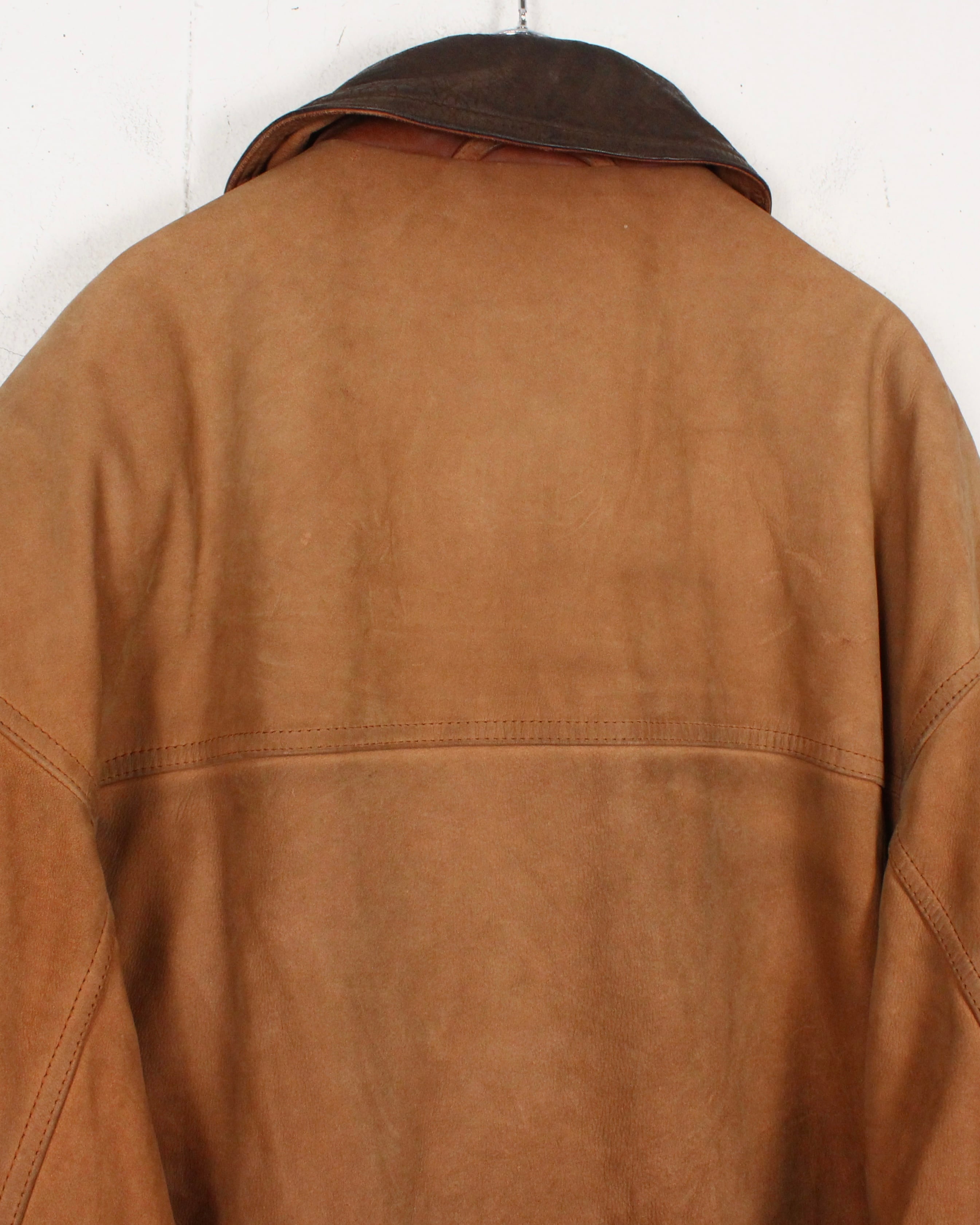 ライトブラウンのボディに、襟部分にダークブラウンのレザーを配することで、立体感と重厚な表情を演出したレザージャケット。