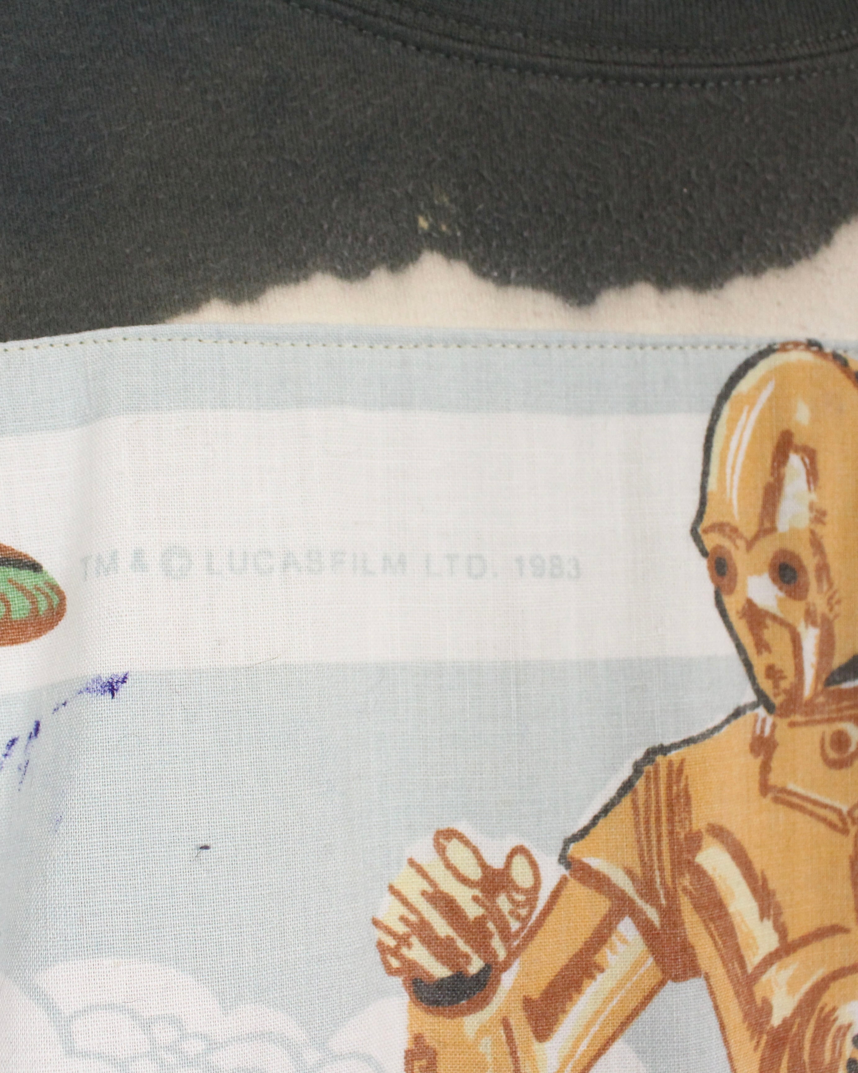 フロントには映画「STAR WARS / RETURN OF THE JEDI(ジェダイの帰還)」のキャラクター、C-3POやR2-D2やハン・ソロが描かれたビッグパッチをオン。アートワークを大胆に配置することで、ただのスウェットにはない存在感を放ちます。