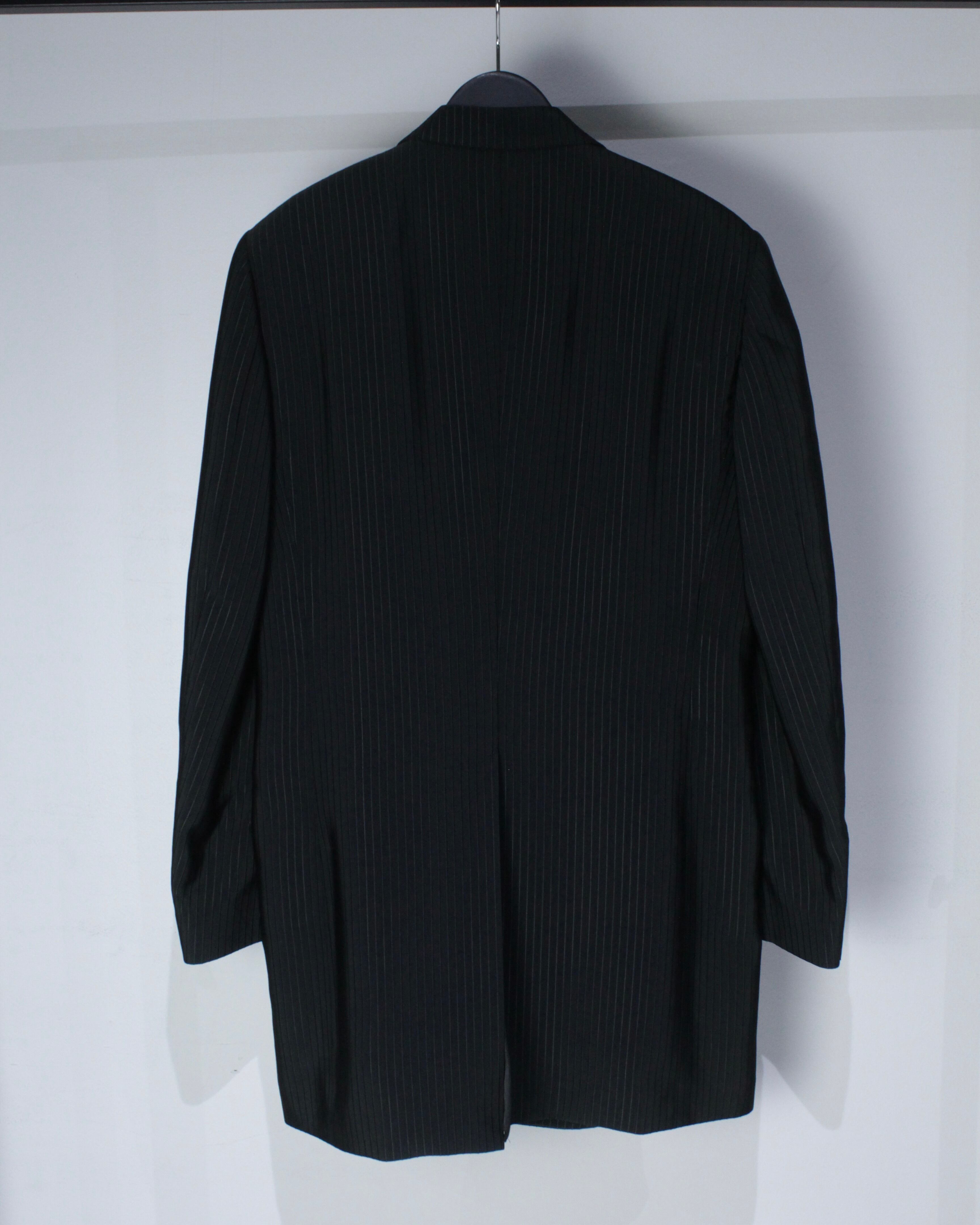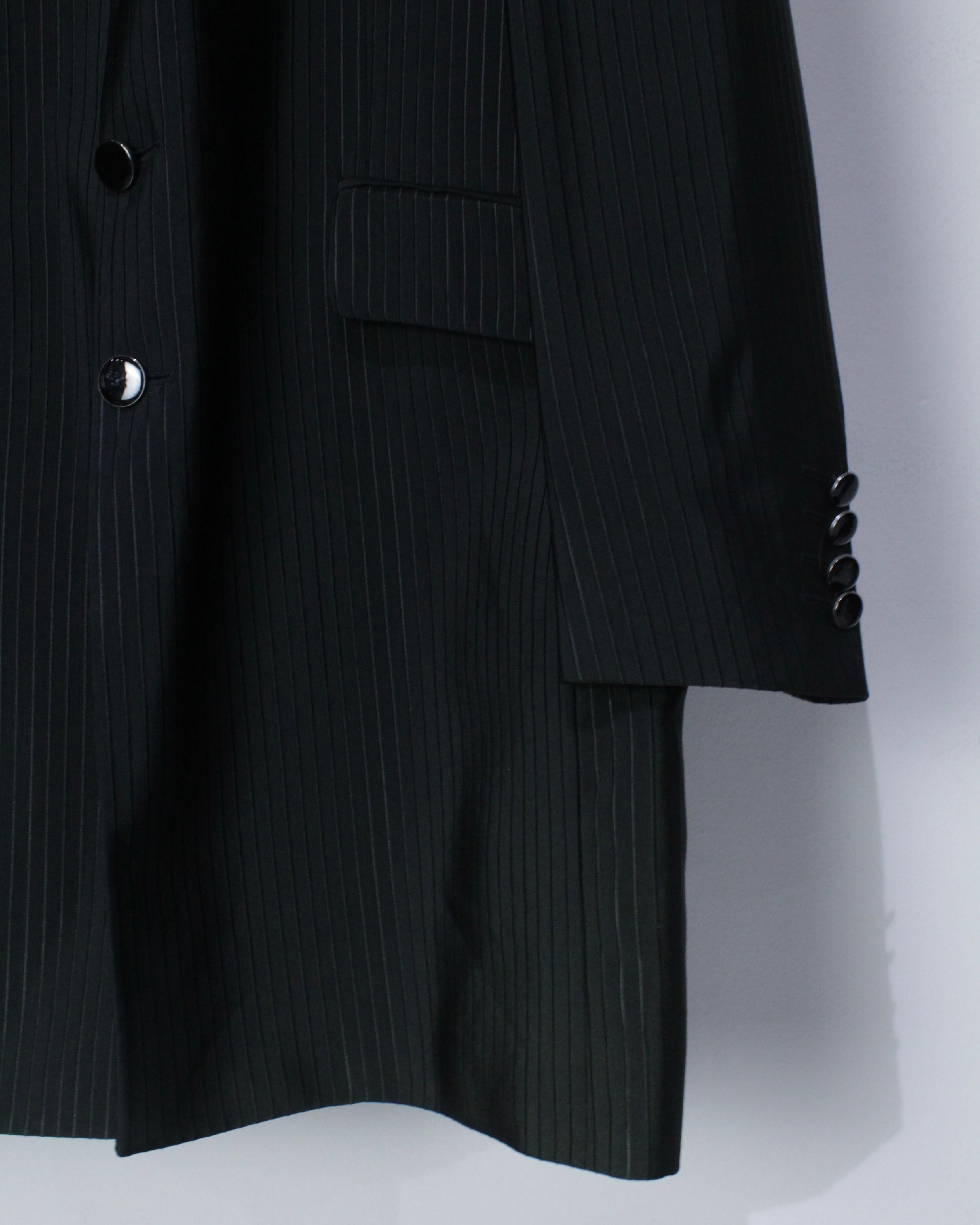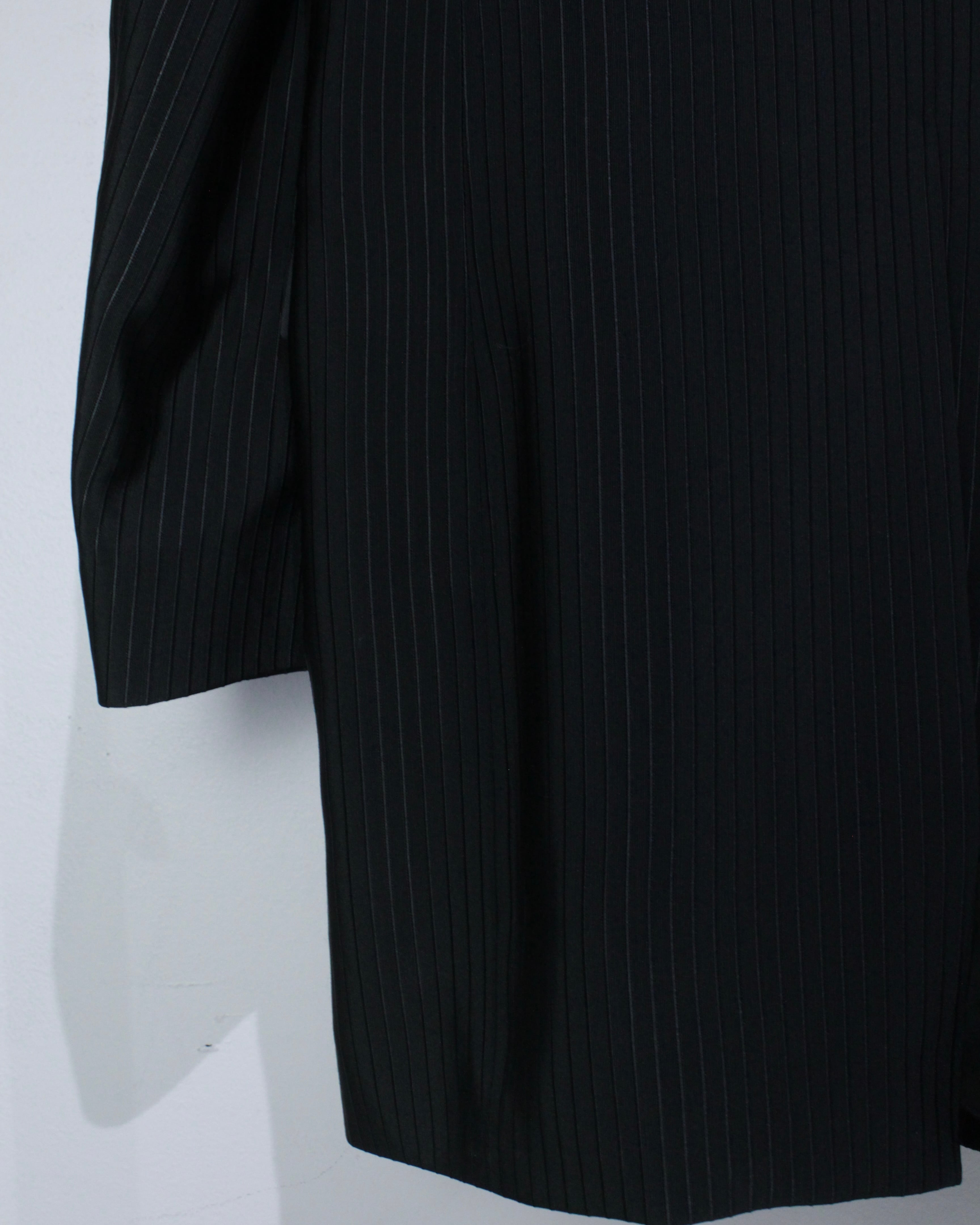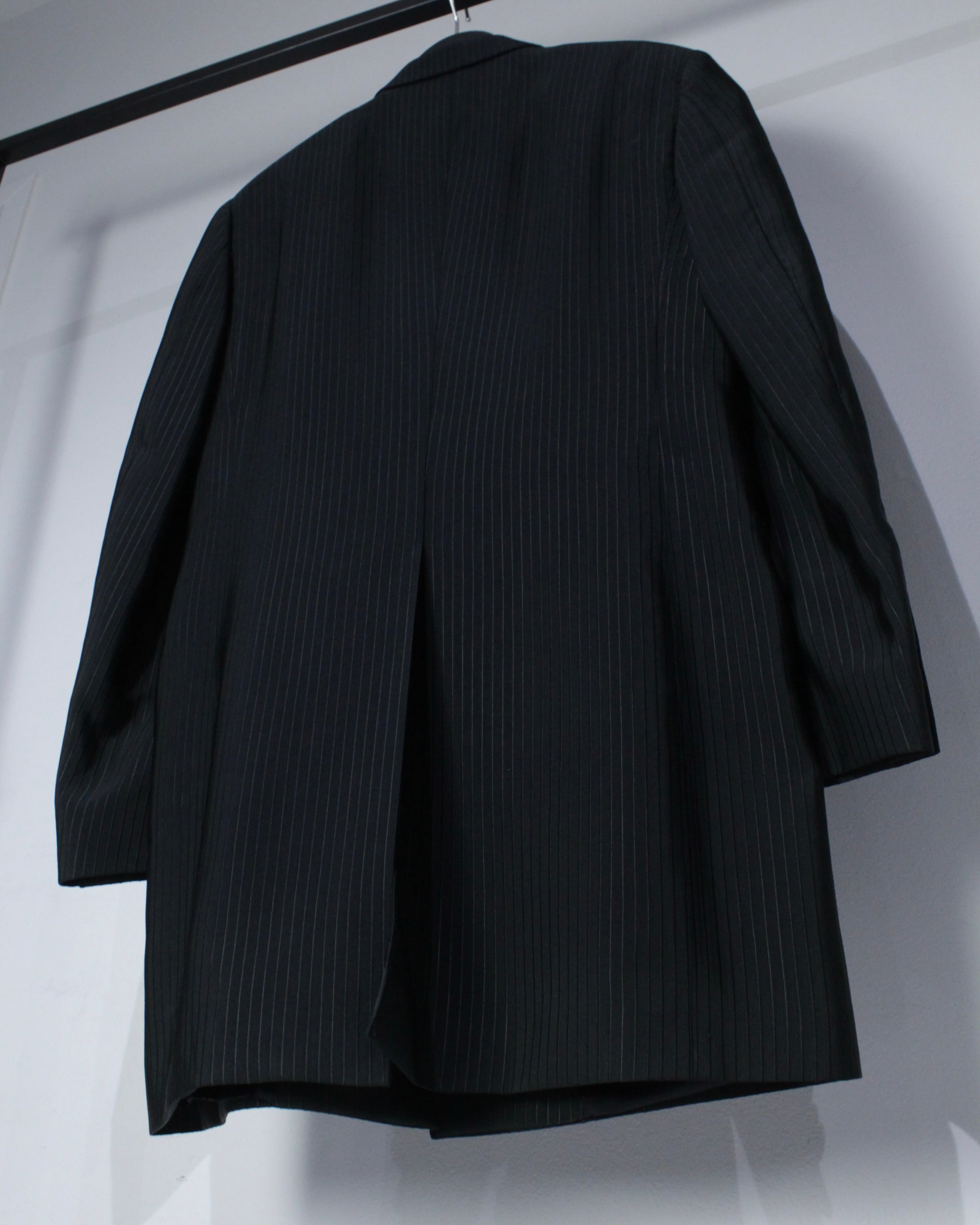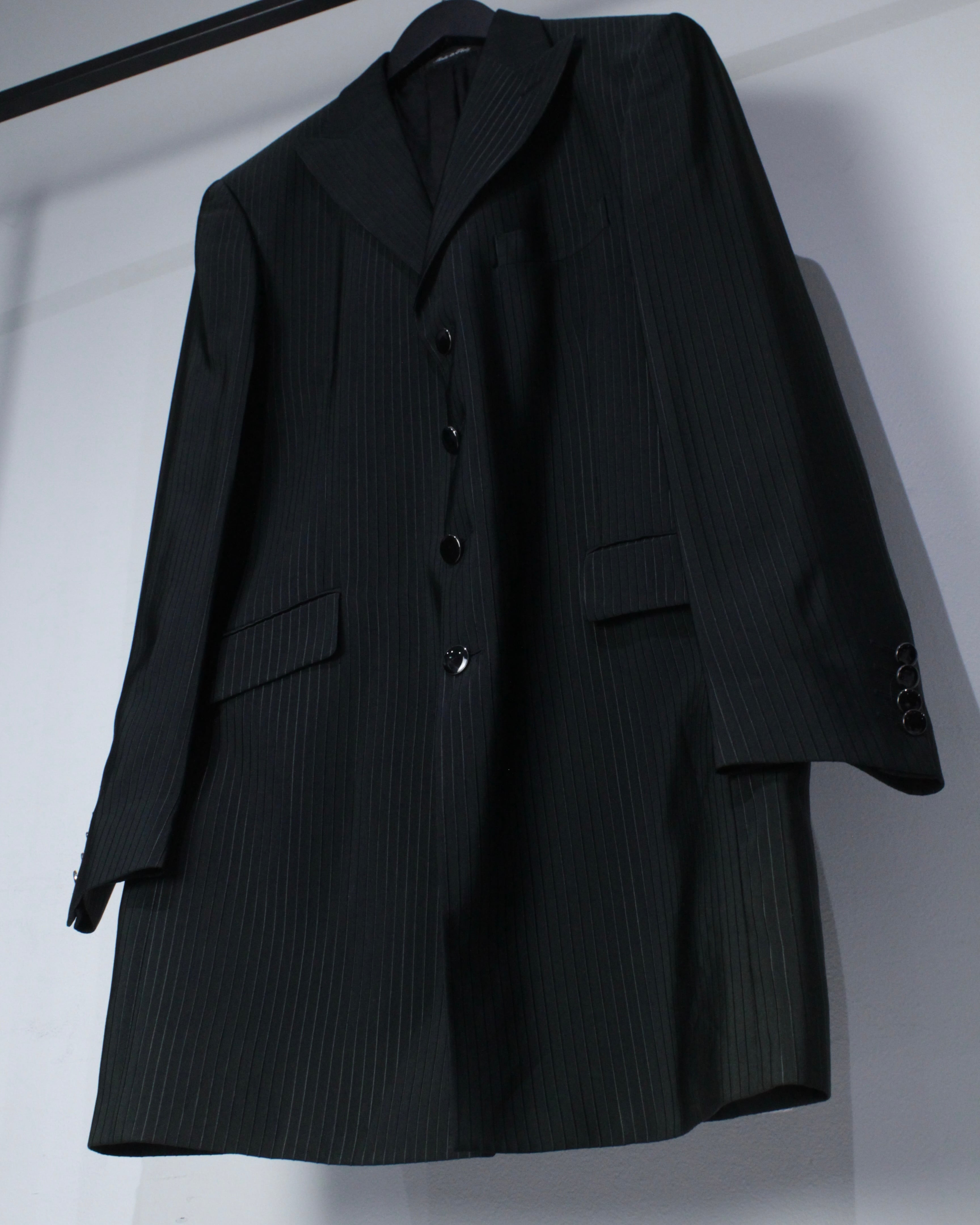 ボディは深みのあるブラックを基調に、シャープなピンストライプが走り、シルエットをさらに縦長に強調。大きく跳ね上がるようなピークドラペル、長めにとられた着丈、余裕を持たせた肩幅とアームが相まって、クラシカルかつアヴァンギャルドな雰囲気を纏います。