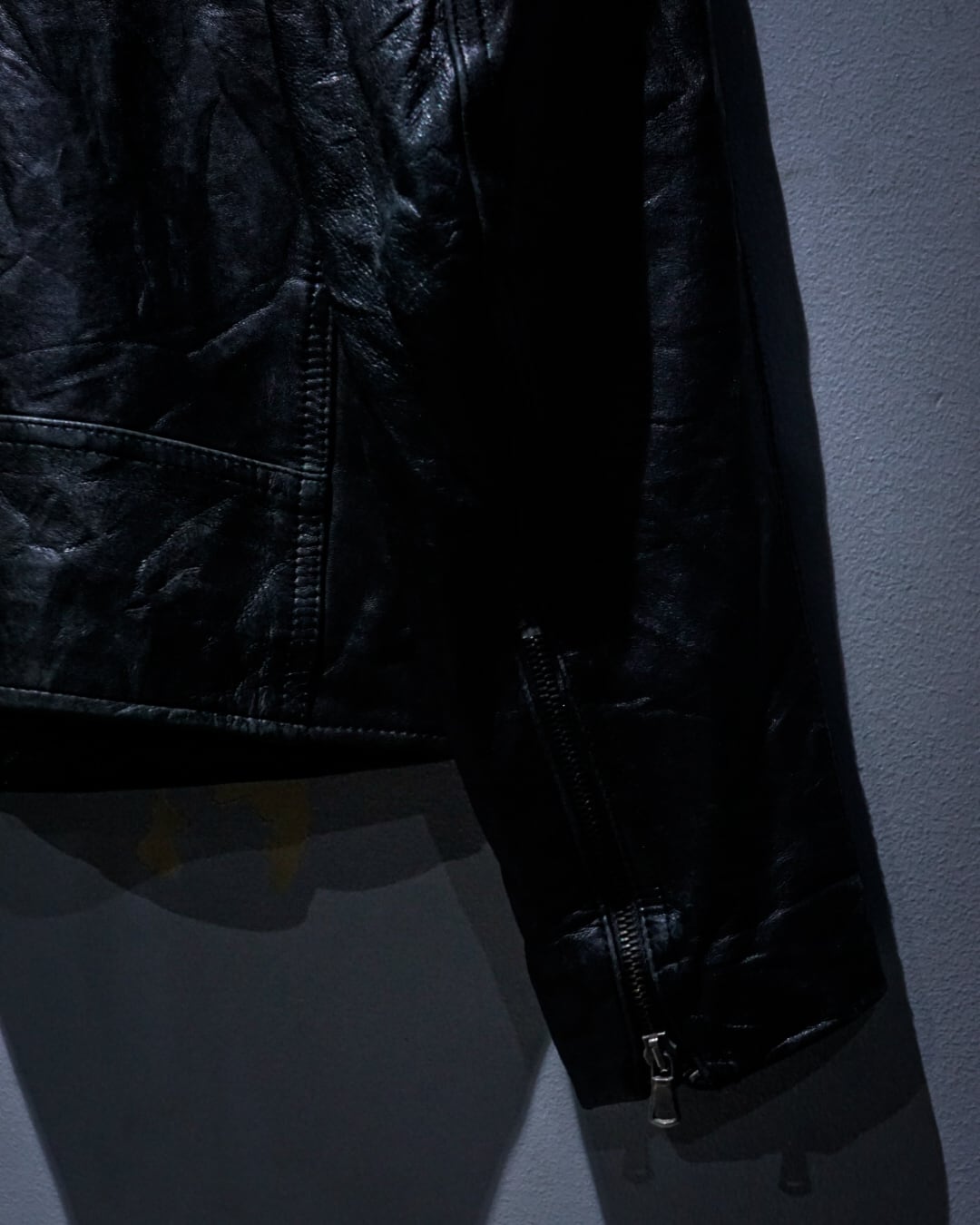 柔らかくもハリのある極上のブラックレザーを贅沢に使用したシングルライダースジャケット。