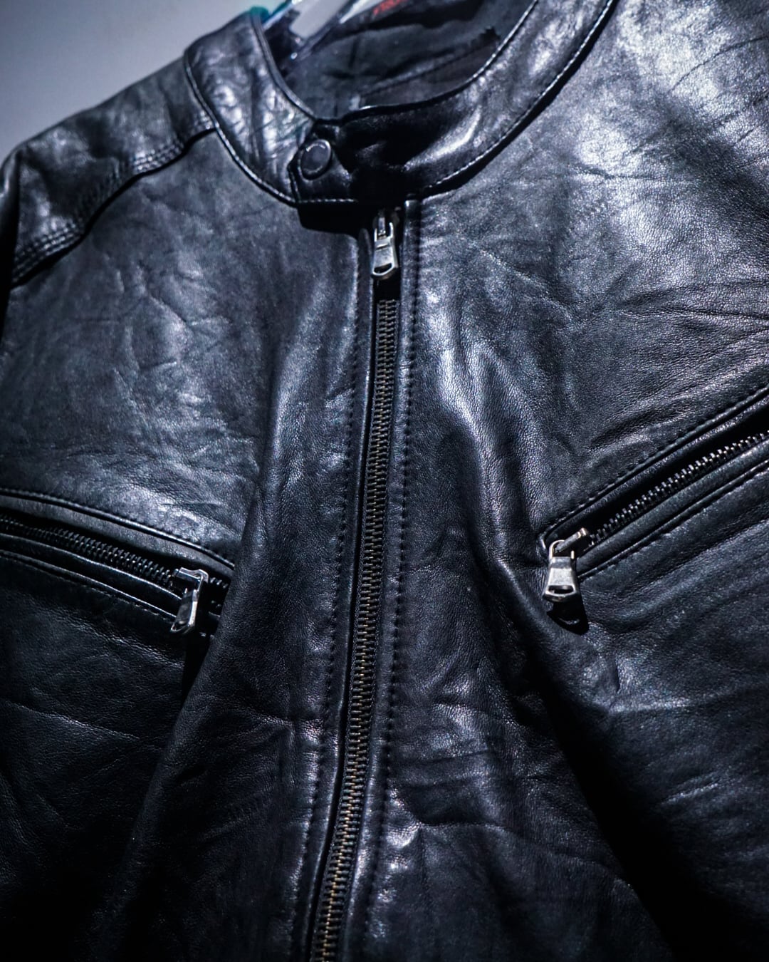 ディテールは逆ハの字に配された胸ポケット、両サイドのジップポケットを備え、首元はスナップ留め仕様となっており、スタンドカラーでの着用も可能。クラシックなライダースの王道を踏襲しながらも、フェードの効いた表情が他では味わえない深みを演出。