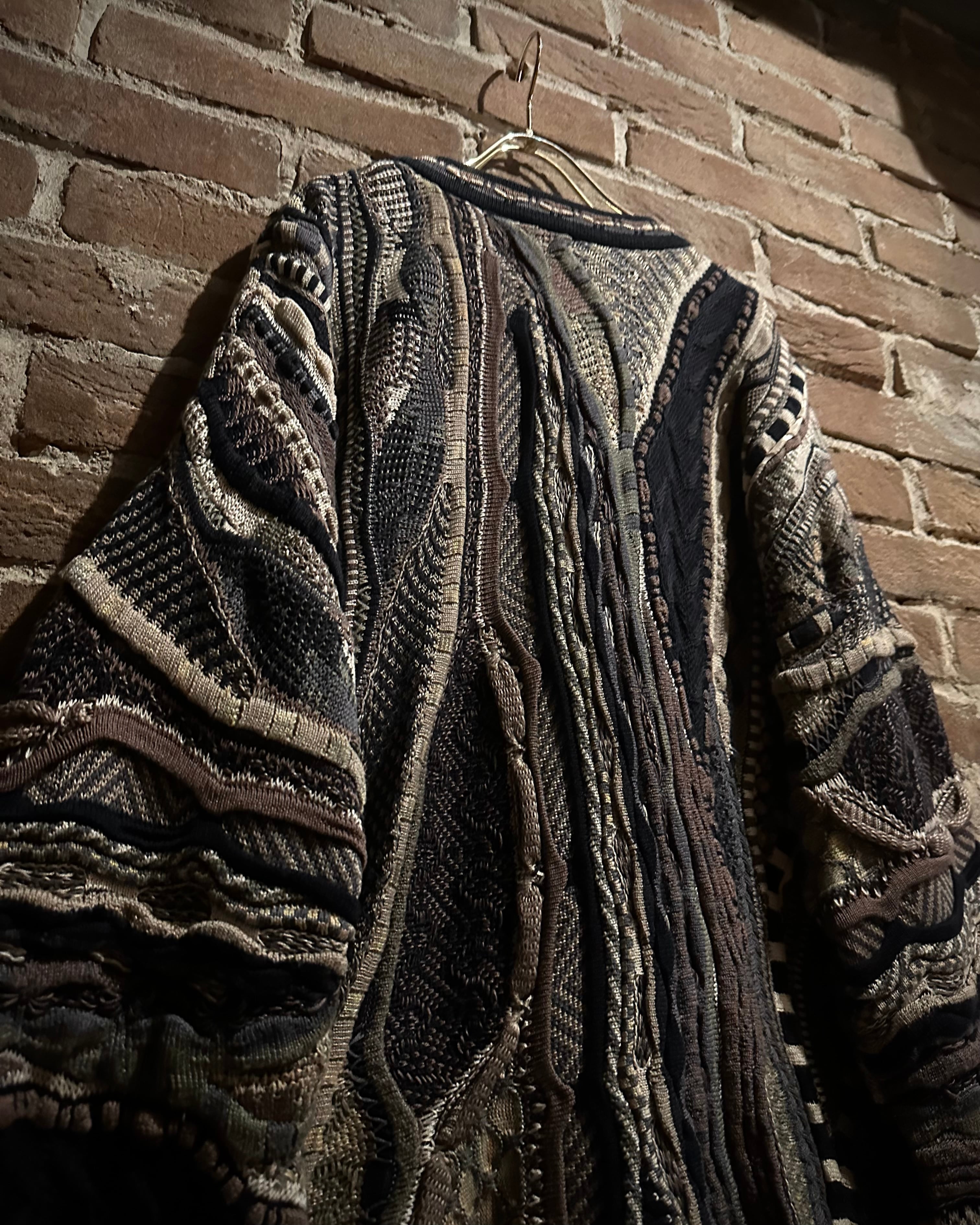 ボディ全体を覆う複雑かつ立体的な編み模様は、まるでアートピースのような迫力を放ちます。ブラウン、ベージュ、ブラックのトーンを基調とした落ち着きのある配色は、インパクトがありながらもスタイリングに取り入れやすく、ストリートやモードな着こなしにしっかりと馴染みます。