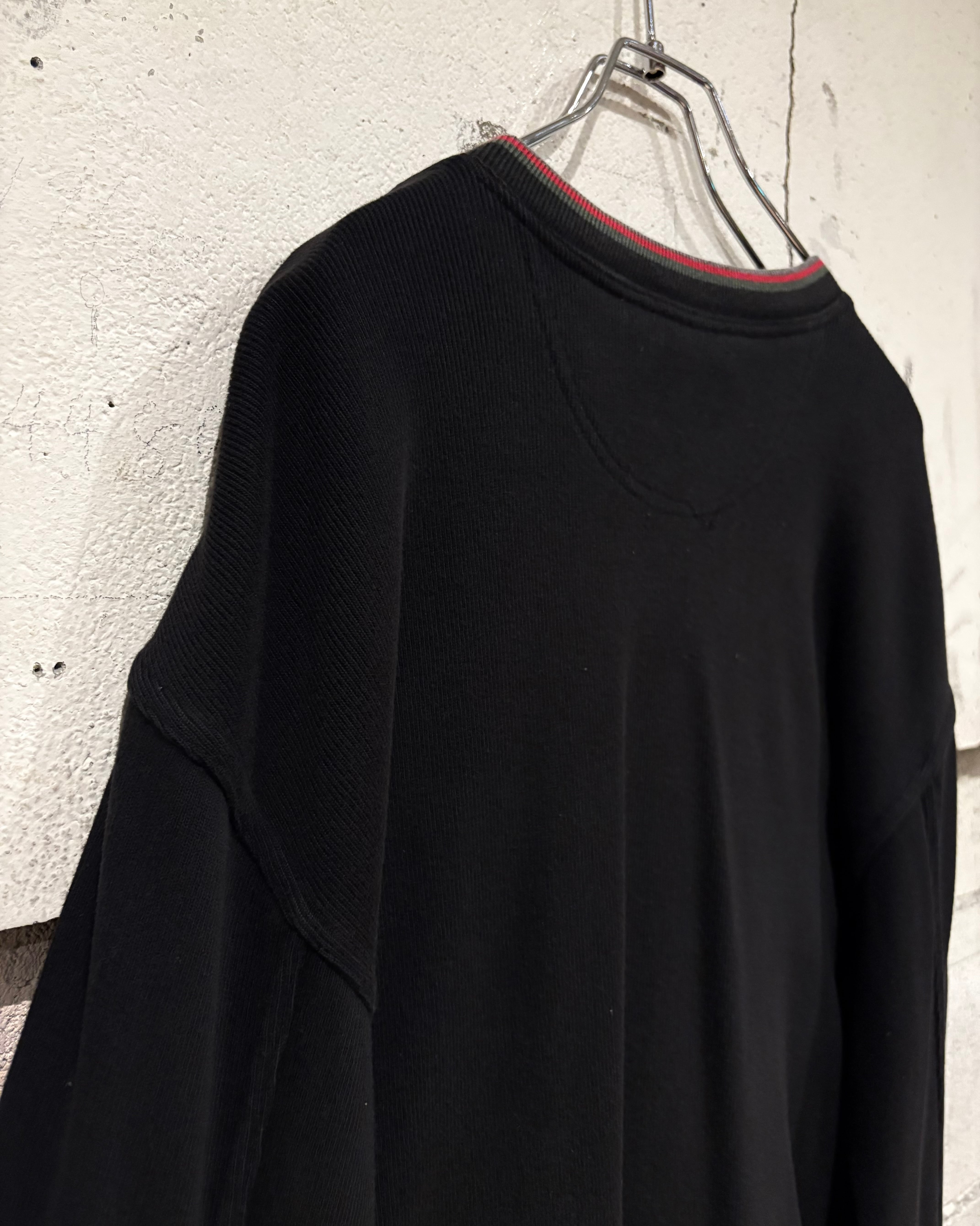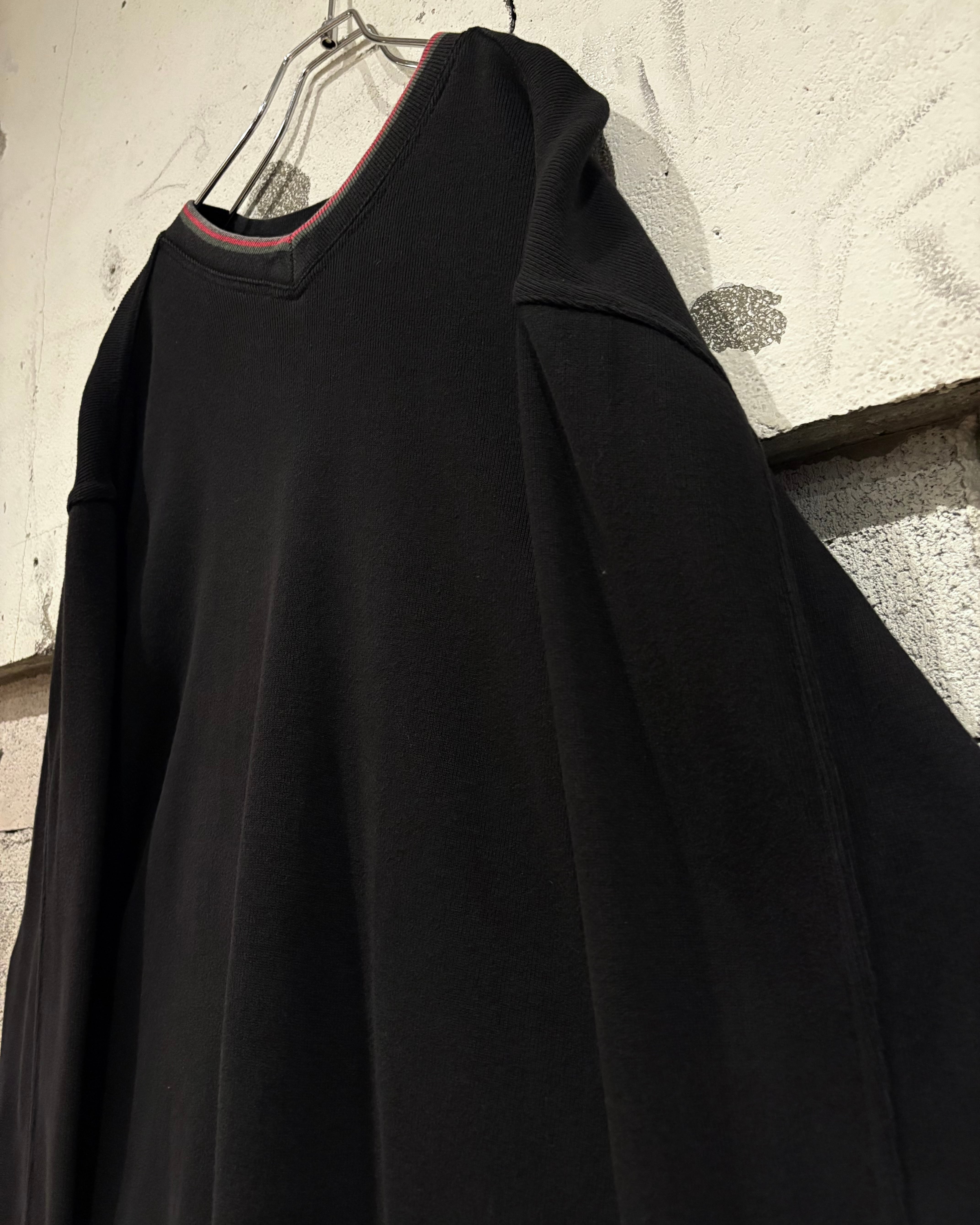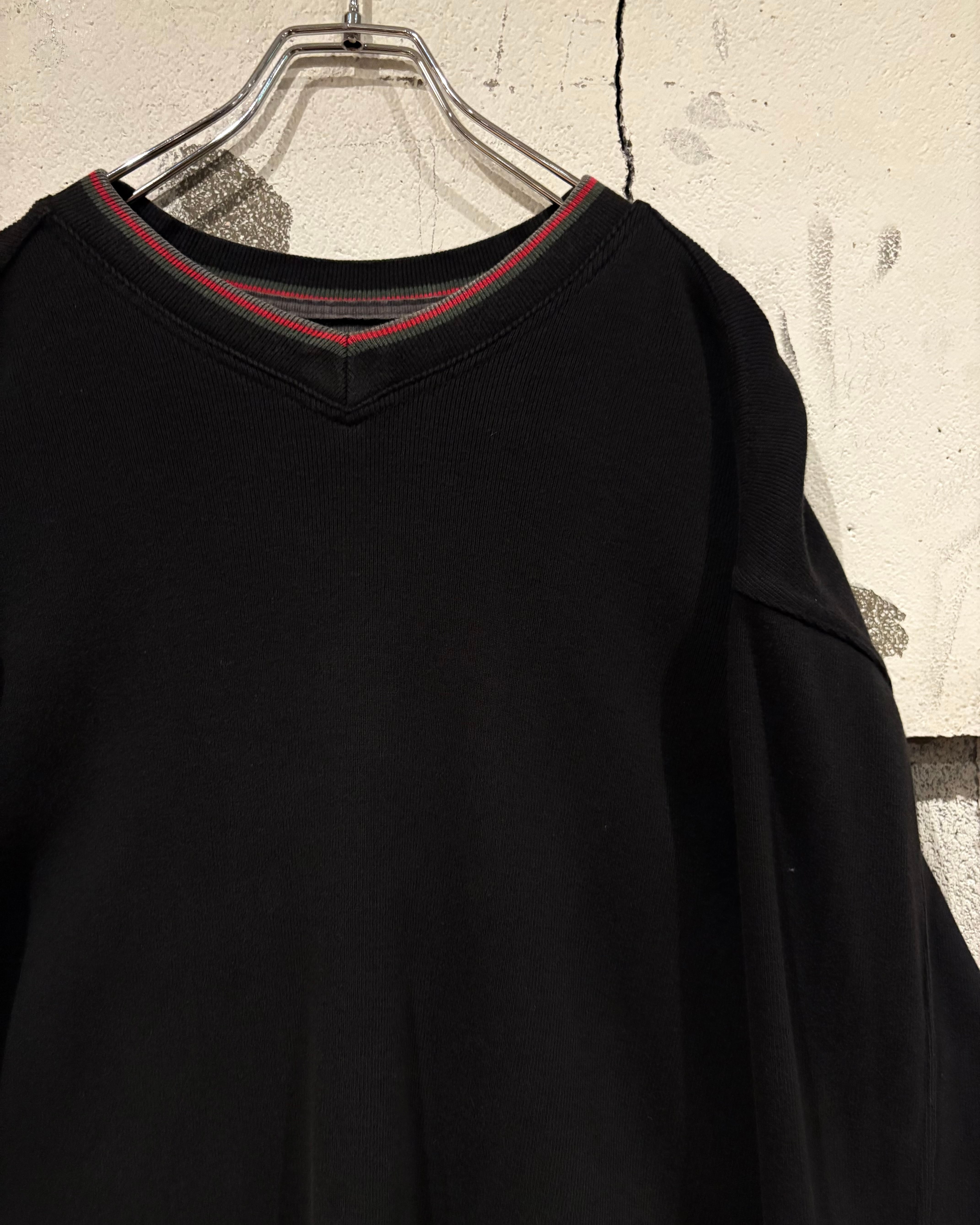 首元をVネックに仕上げ、リブに沿ってGUCCIのシェリーラインを彷彿とさせる赤×緑のラインを走らせたスウェット。