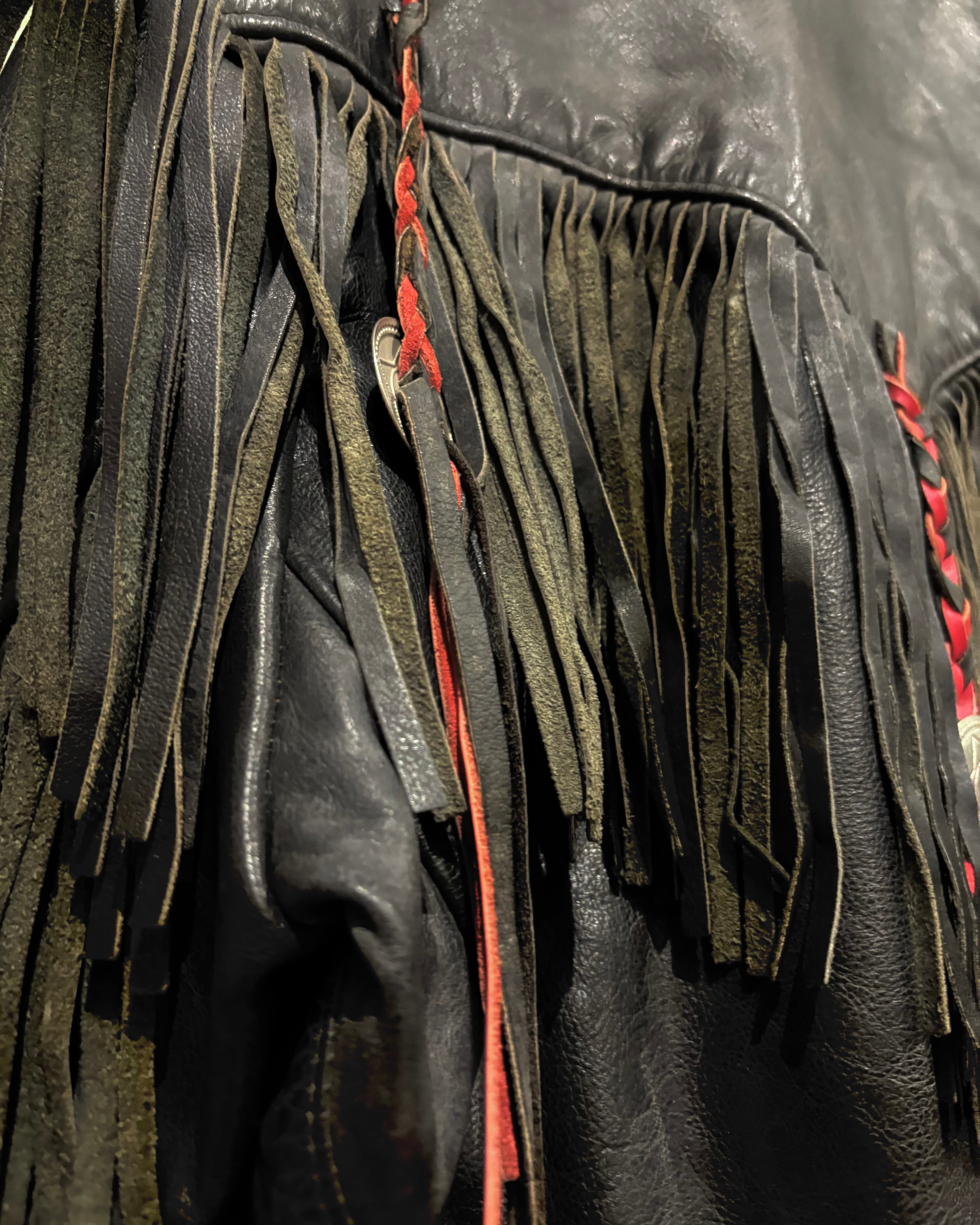 随所に見られる赤のレースアップとコンチョボタンの装飾、ヨークの切り替えはウエスタンやネイティブのエッセンスを強く打ち出しつつ、無骨なライダースの佇まいと融合。動くたびに揺れるフリンジがダイナミックな存在感を放ち、唯一無二のヴィンテージ感を演出しています。
