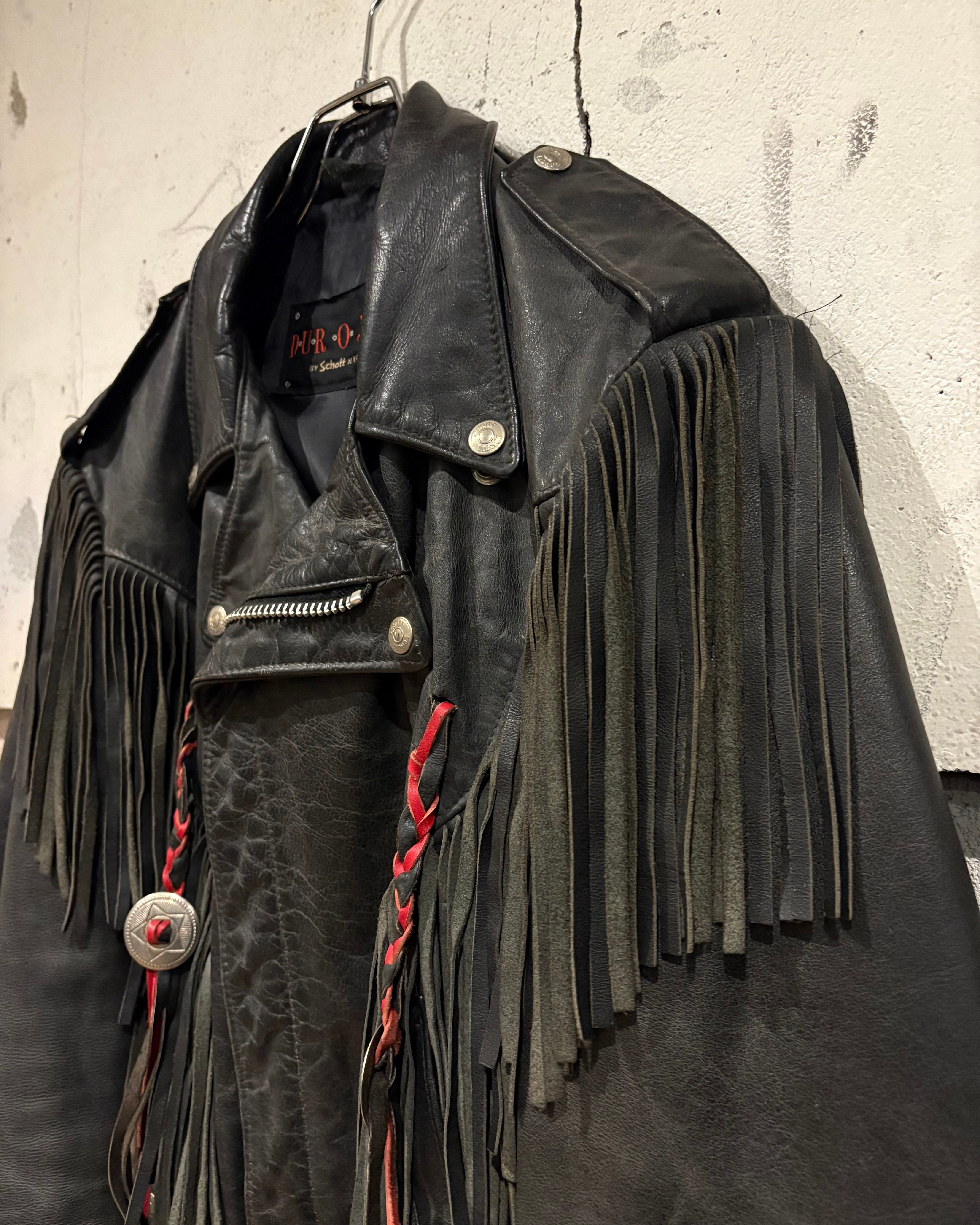 しなやかで重厚感のあるブラックレザーをベースに、肩から袖、フロント、バックヨークにかけて大胆にフリンジをあしらった、スペシャルな逸品。