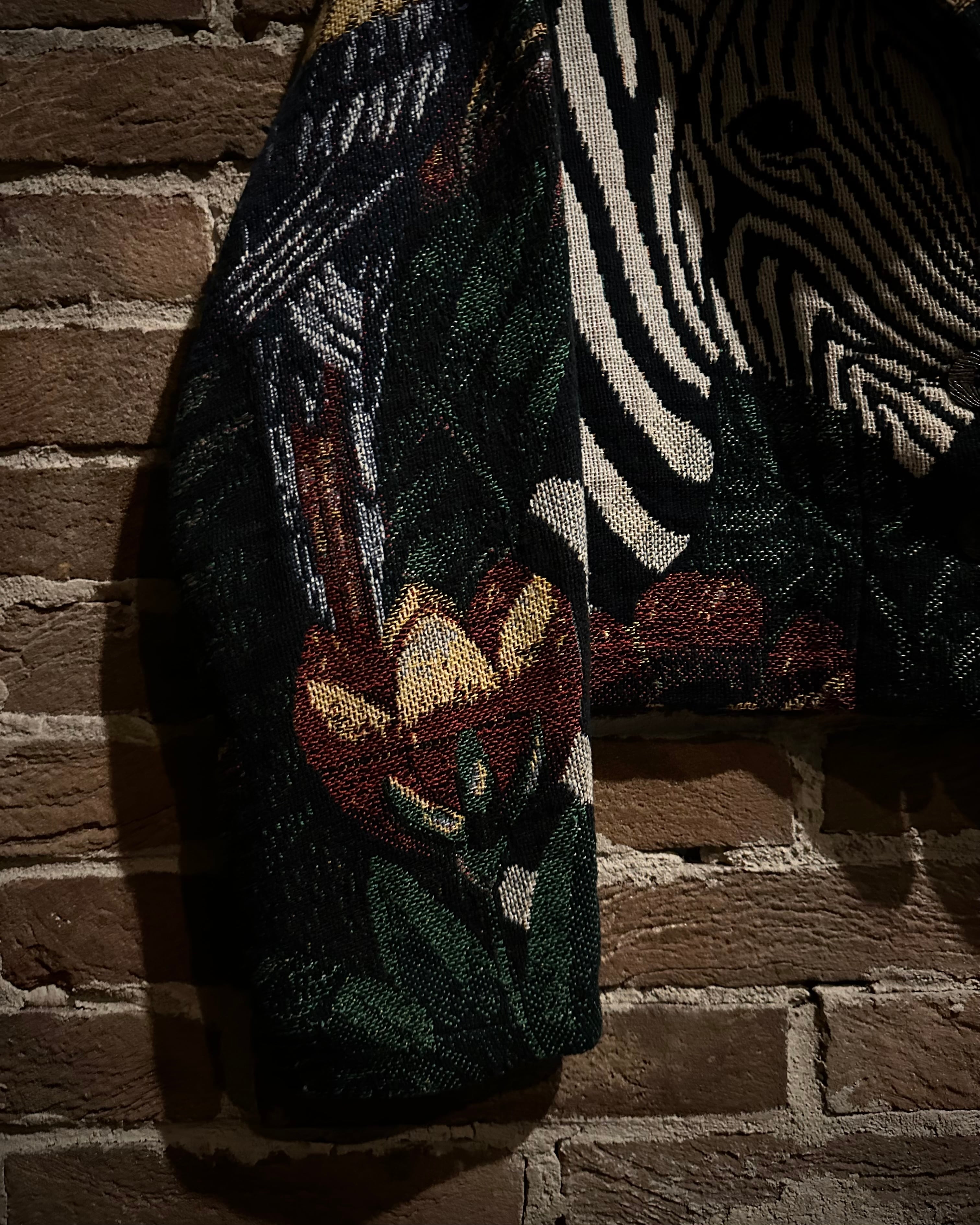 ボディ全体に用いられたゴブラン織りのテキスタイルは、ジャングルの奥深くを切り取ったかのような迫力あるグラフィックで構成され、ゼブラ、ヒョウといった野生動物に加え、咲き誇る花々までもが重厚な織りで描き出されています。